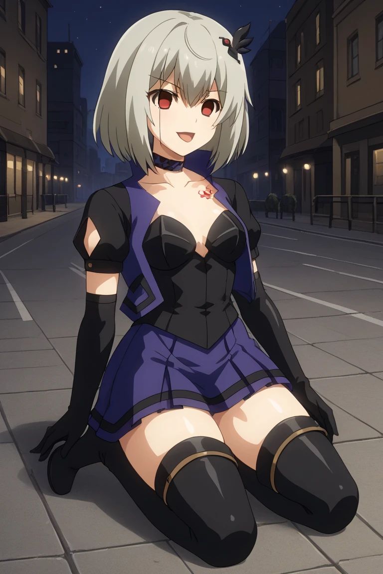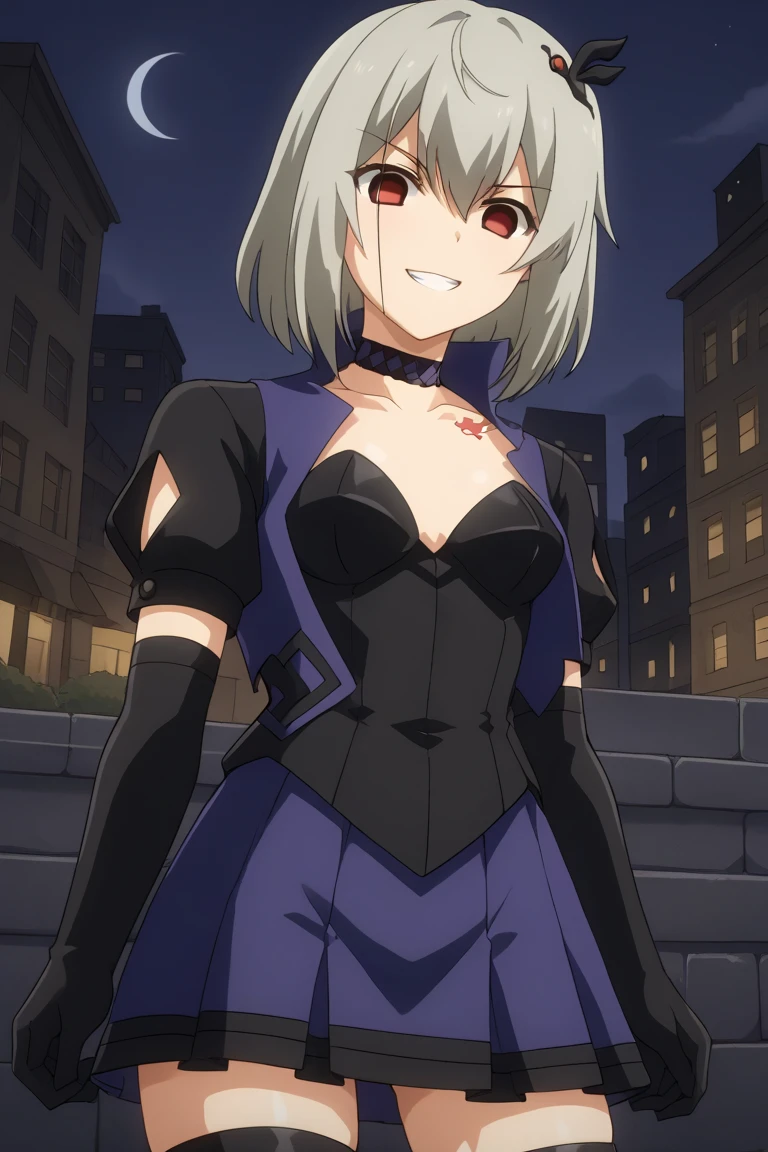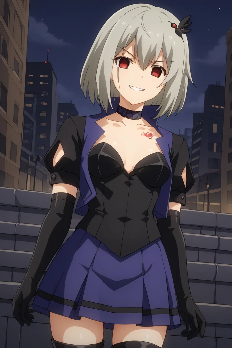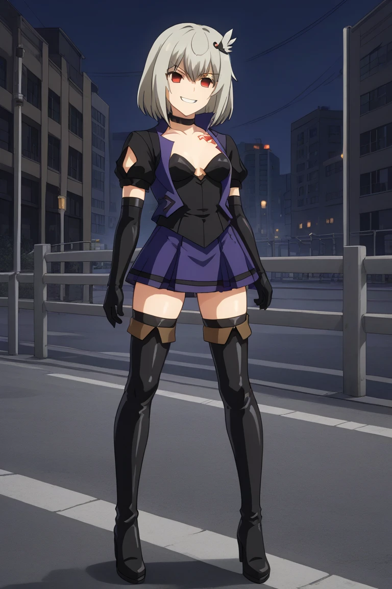 keywords: magical girl, grey hair, short hair, red eyes, hair ornament, choker, shirt, covered navel, black sleeves, puffy short sleeves, purple vest, black elbow gloves, purple skirt, black thigh boots, high heel boots