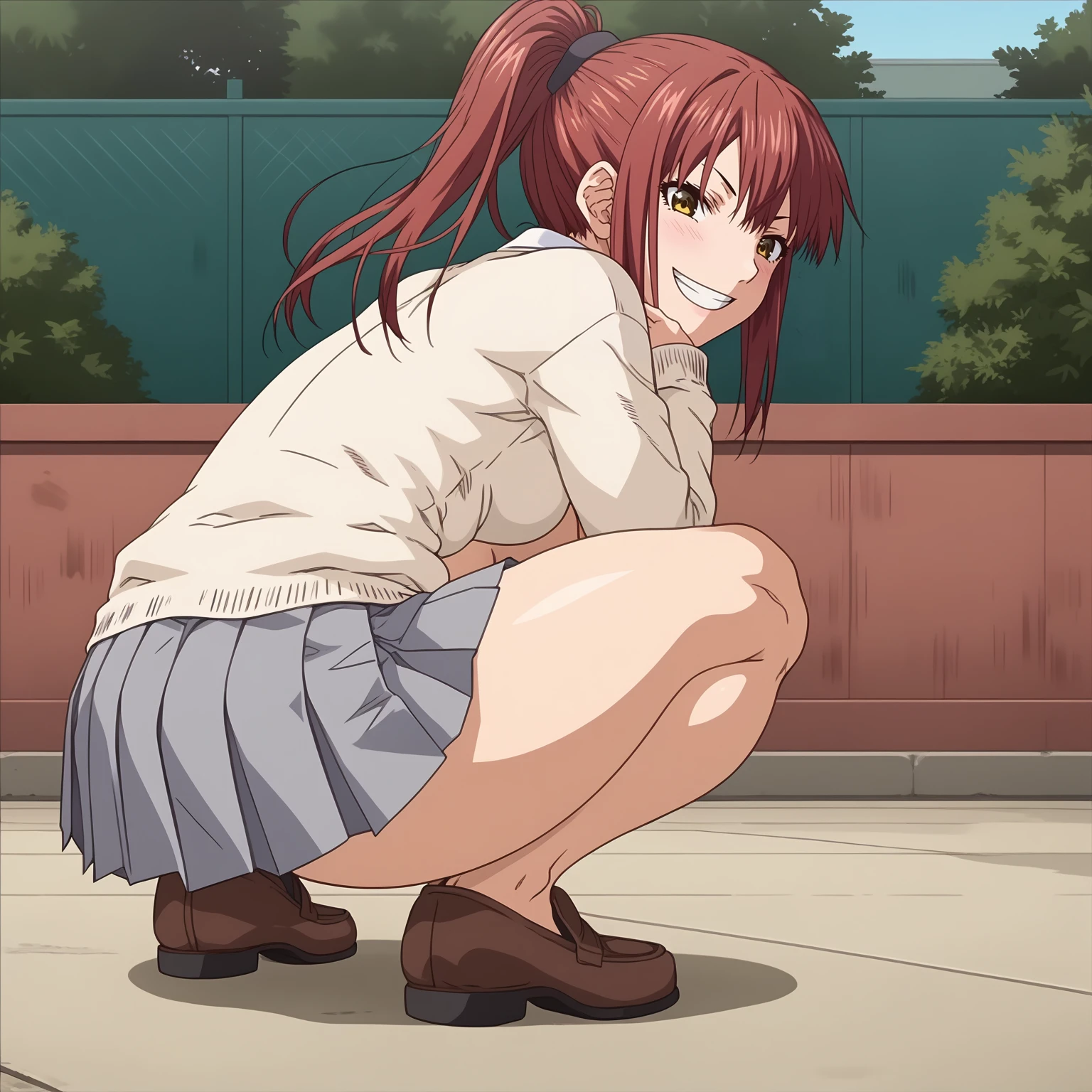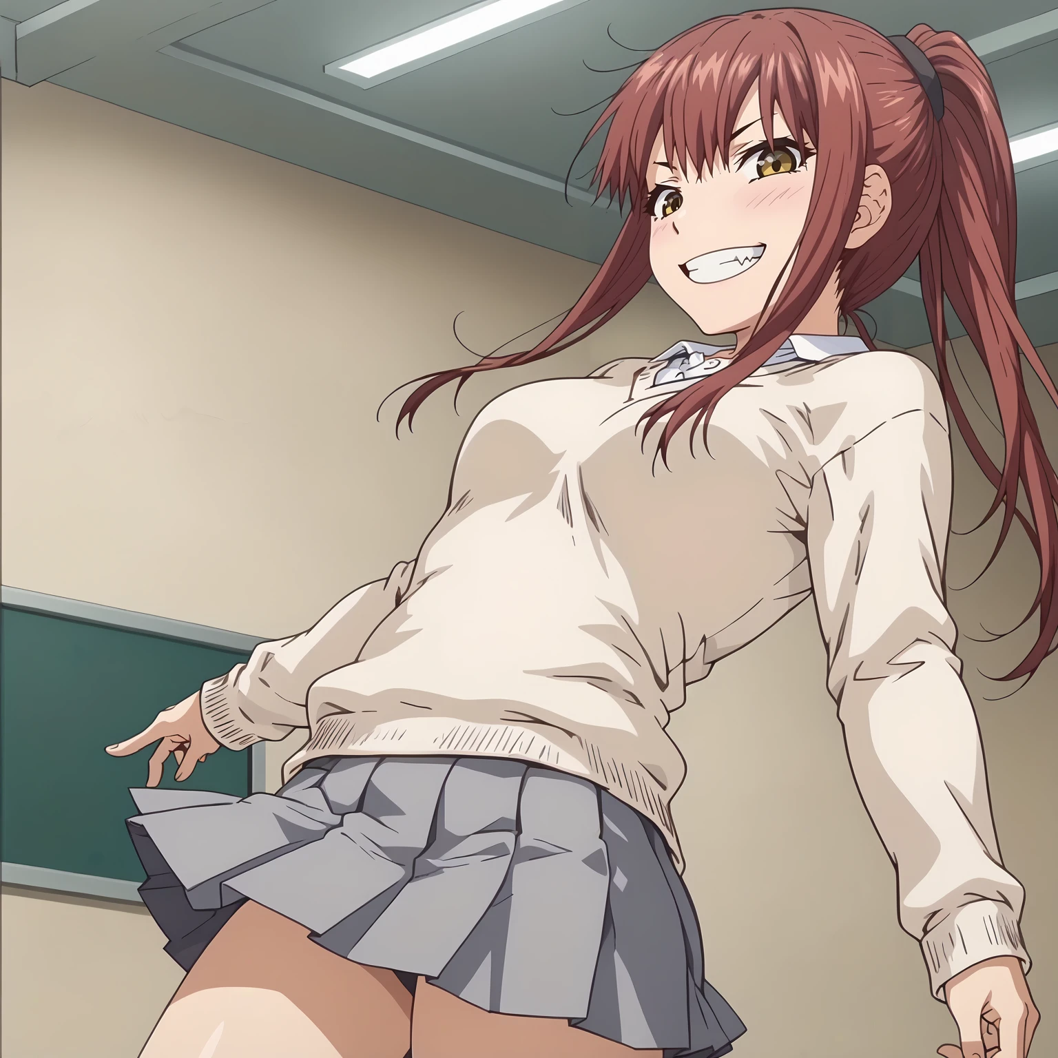 school_uniform,sweater,white shirt, pleated_skirt,gray skirt,