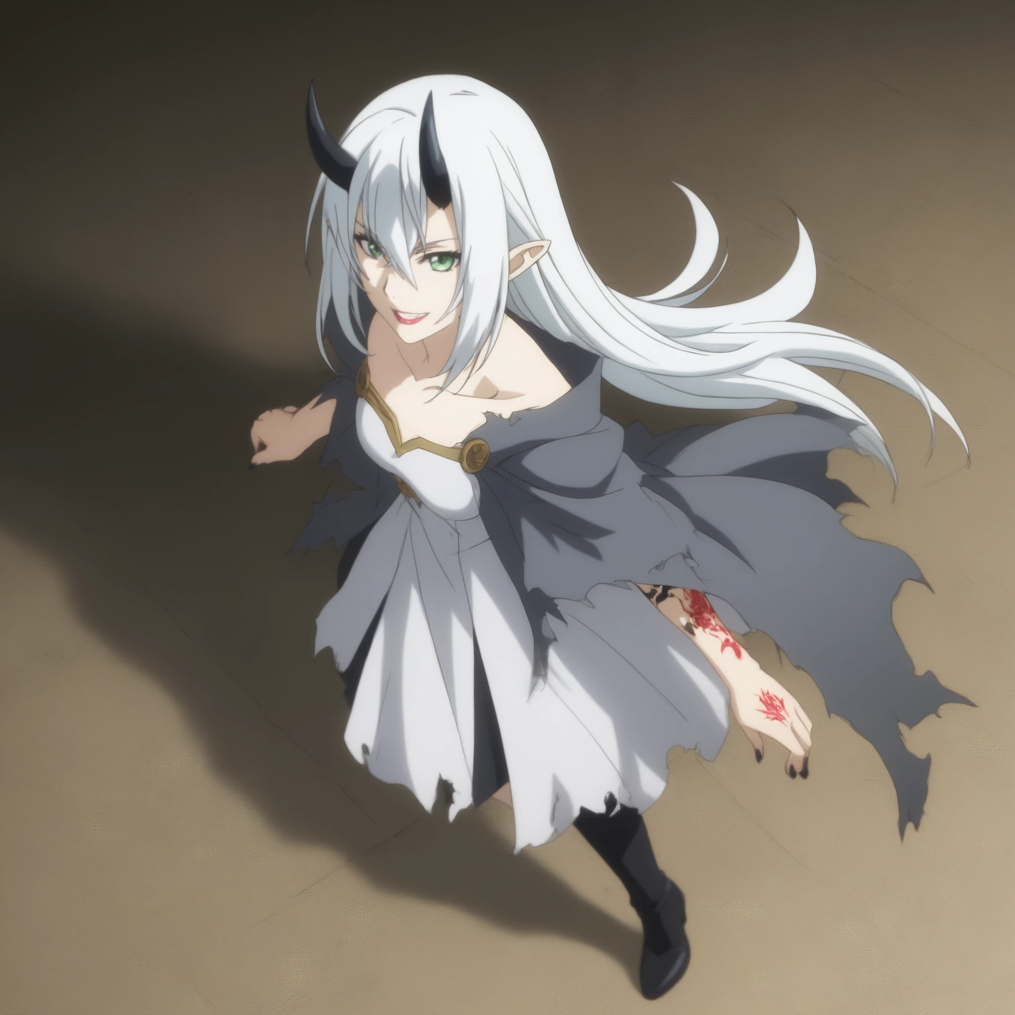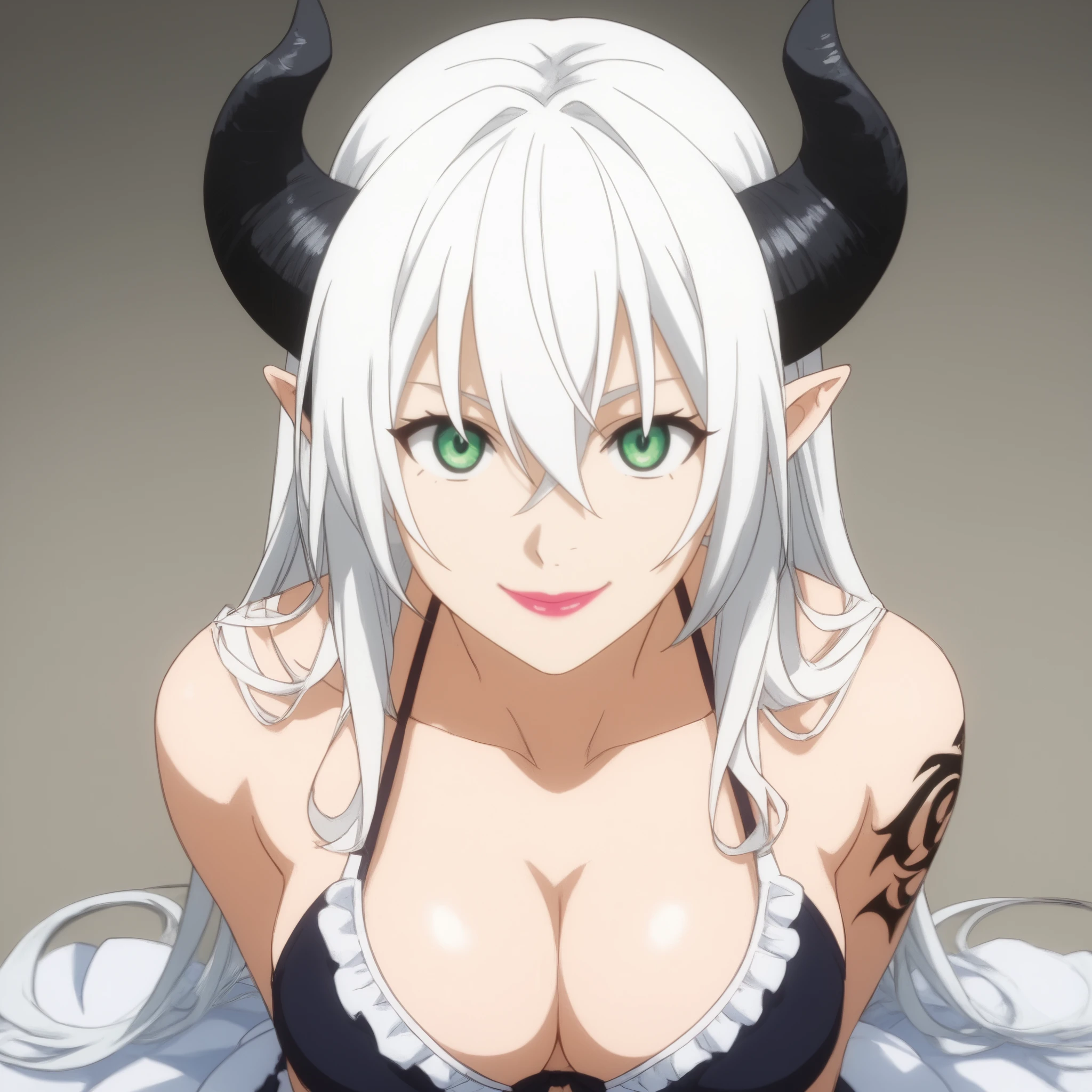 ReMonsterSei, white hair, green eyes, pointy ears, hair between eyes, arm tattoo, black nails, pale skin, lipstick, long hair, horns,