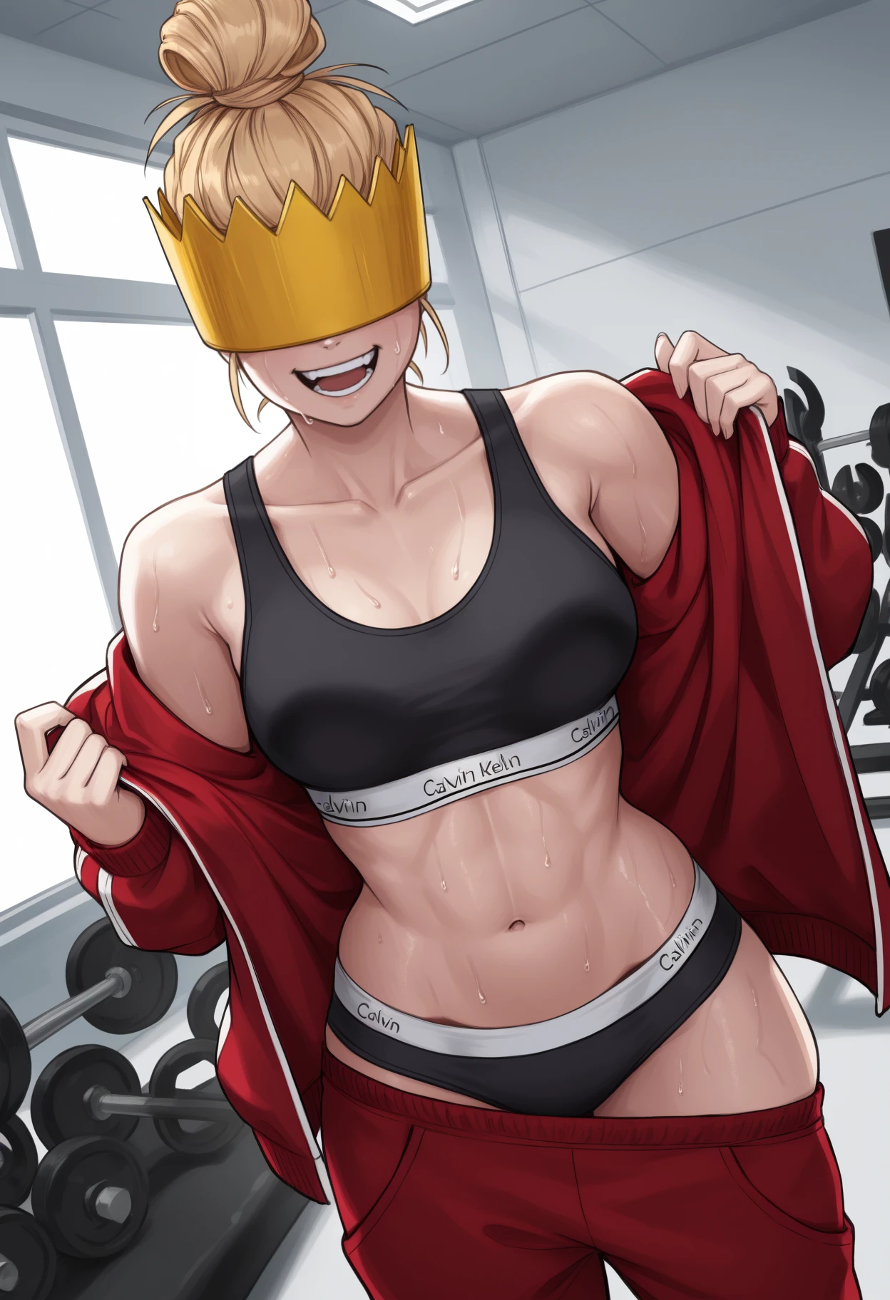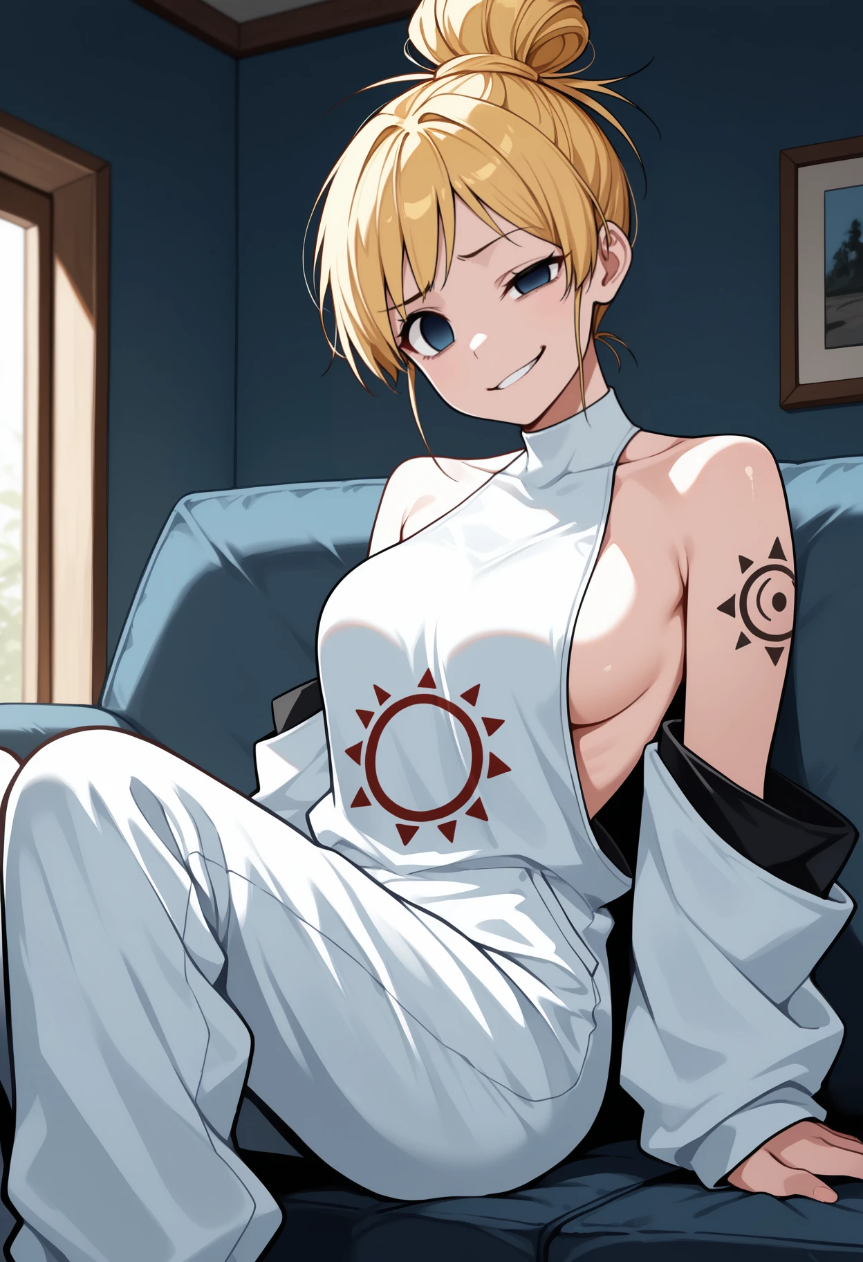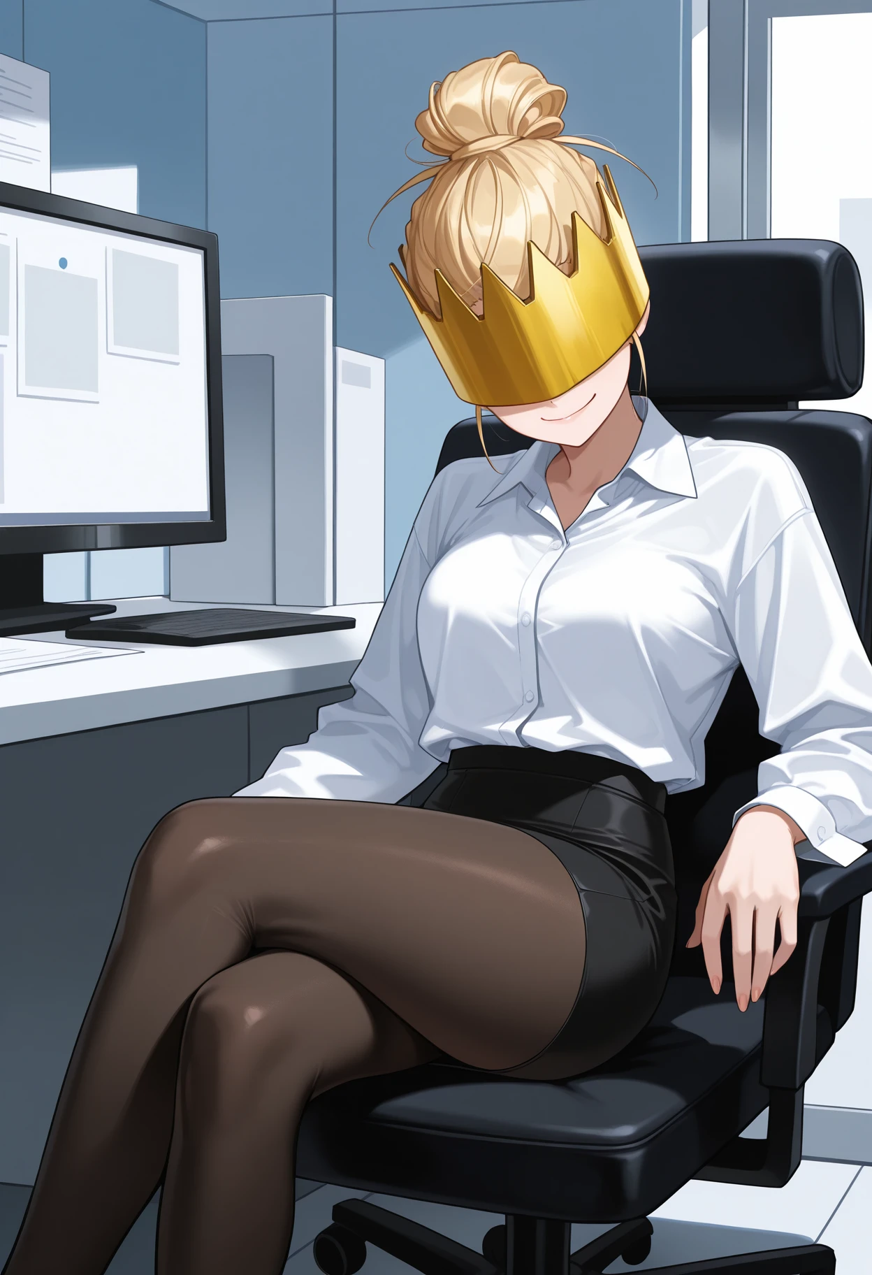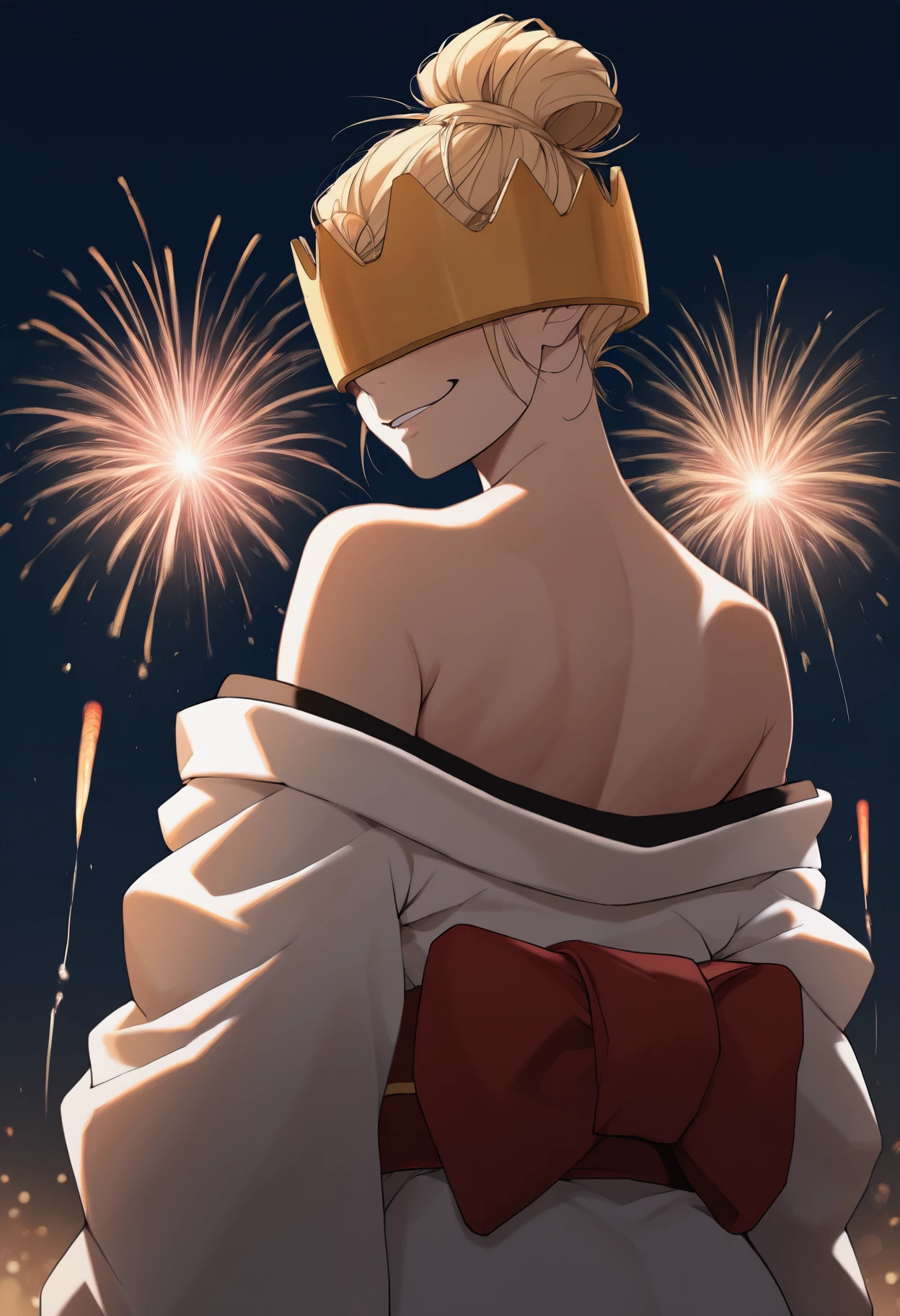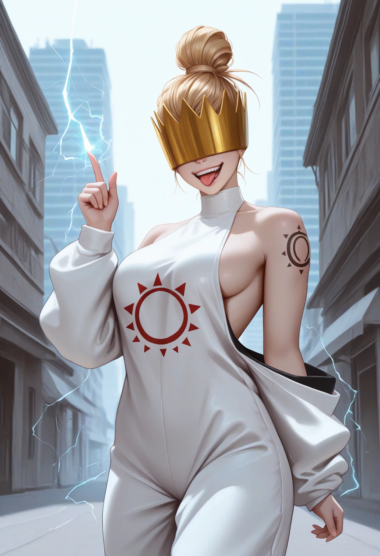 Trigger + Appearance: haum3a, shoulder tattoo, short hair, blonde hair, single hair bun, crown, covered eyes