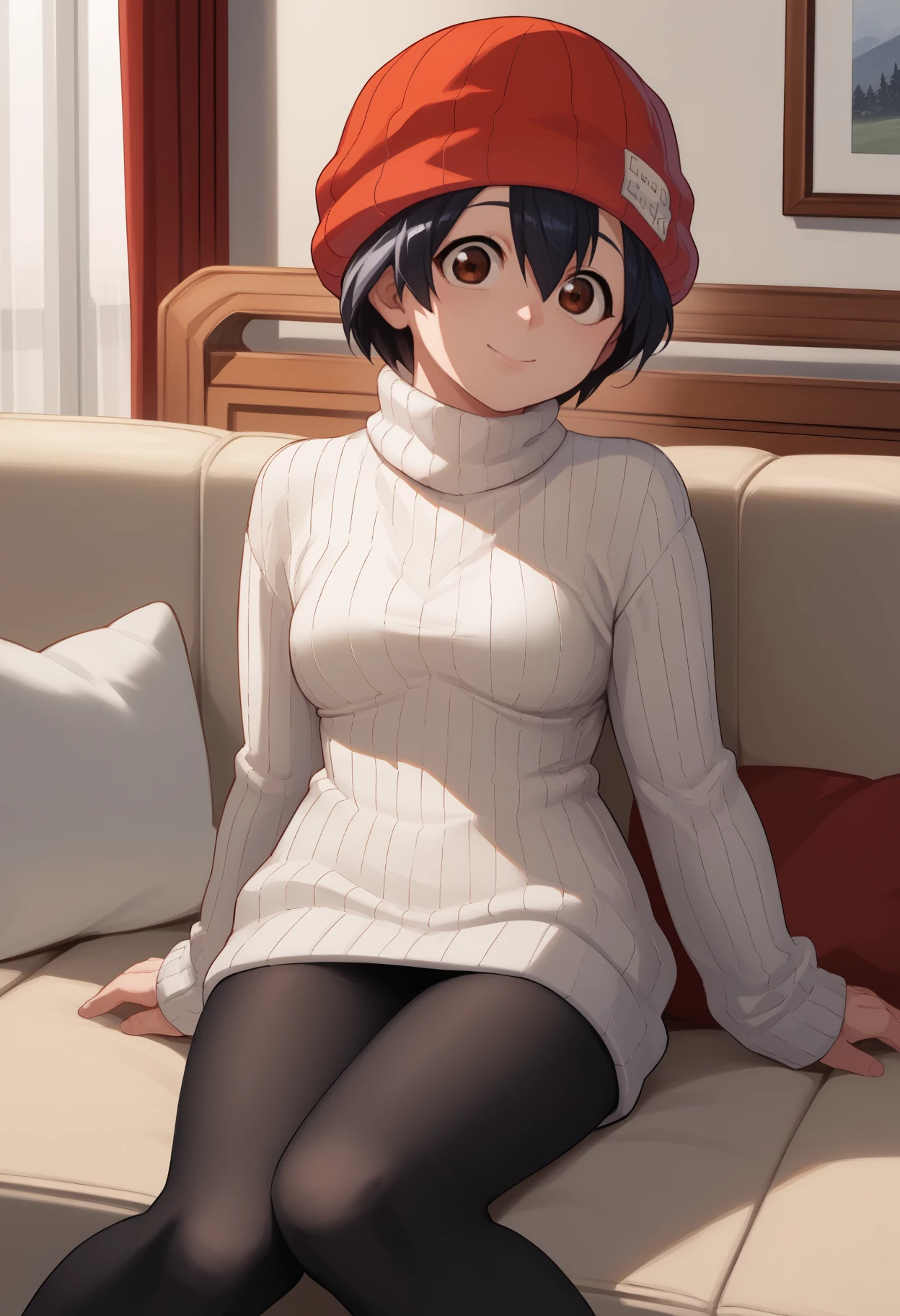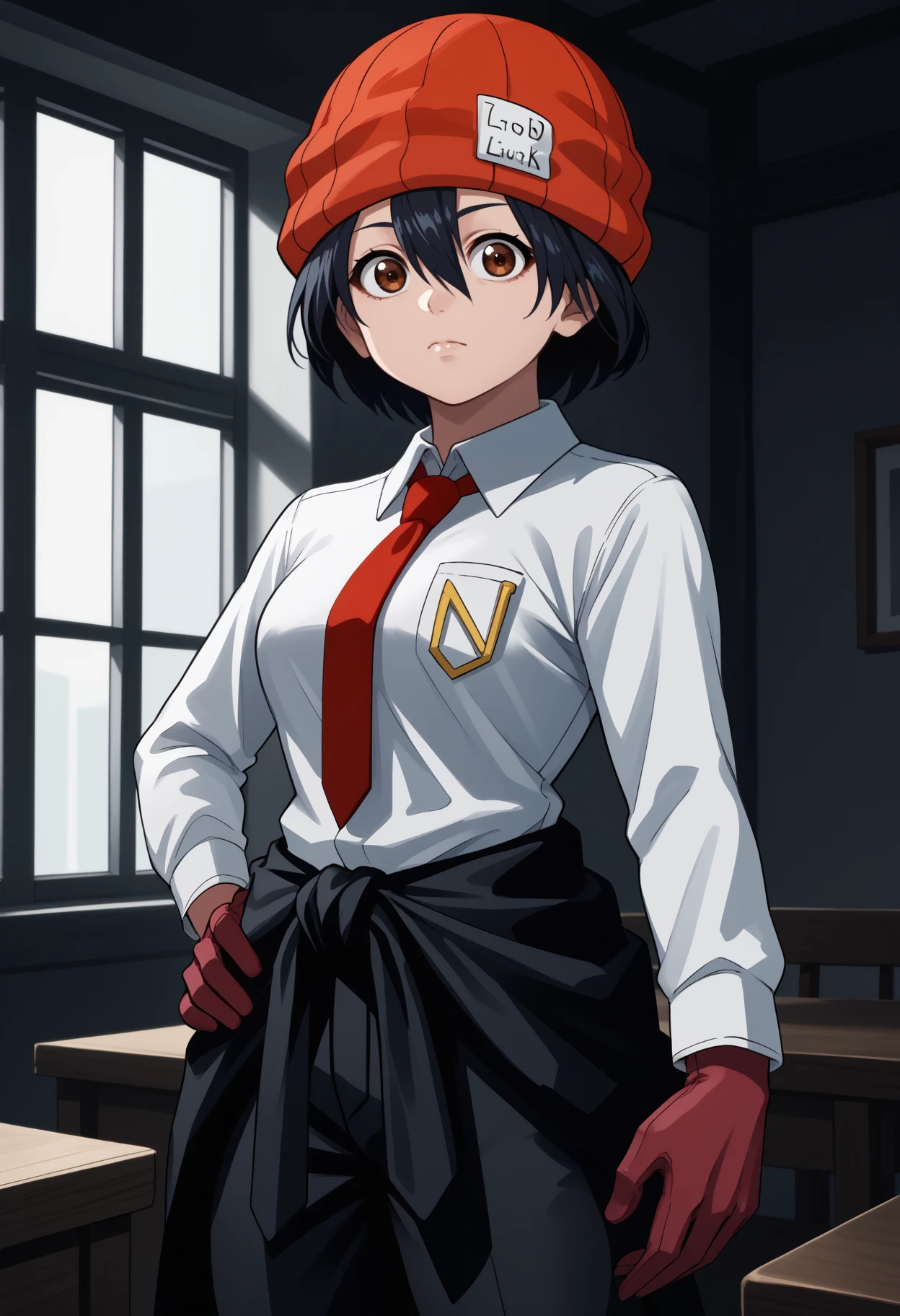 izumo fuuko, short hair, black hair, hair between eyes, red headwear, beanie, brown eyes, white shirt, collared shirt, red necktie, long sleeves, red gloves, clothes around waist, jacket around waist, black pants, large breasts