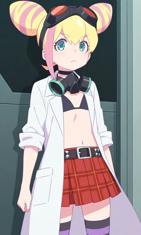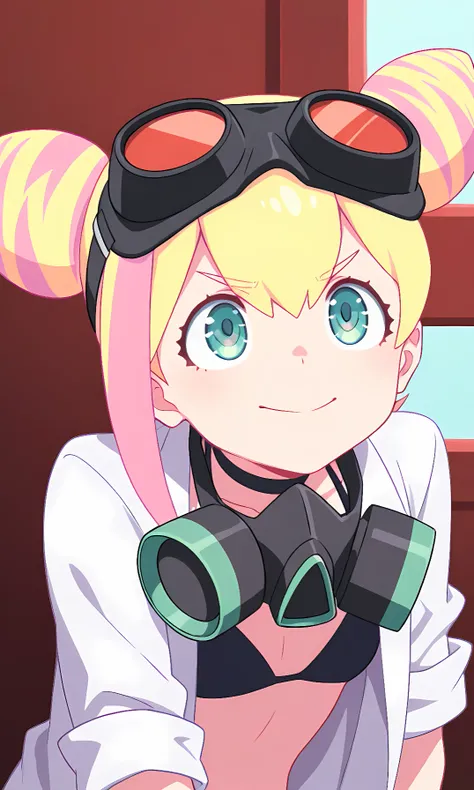 choker, goggles, goggles on head, gas mask, labcoat, bikini top only, rolled up sleeves