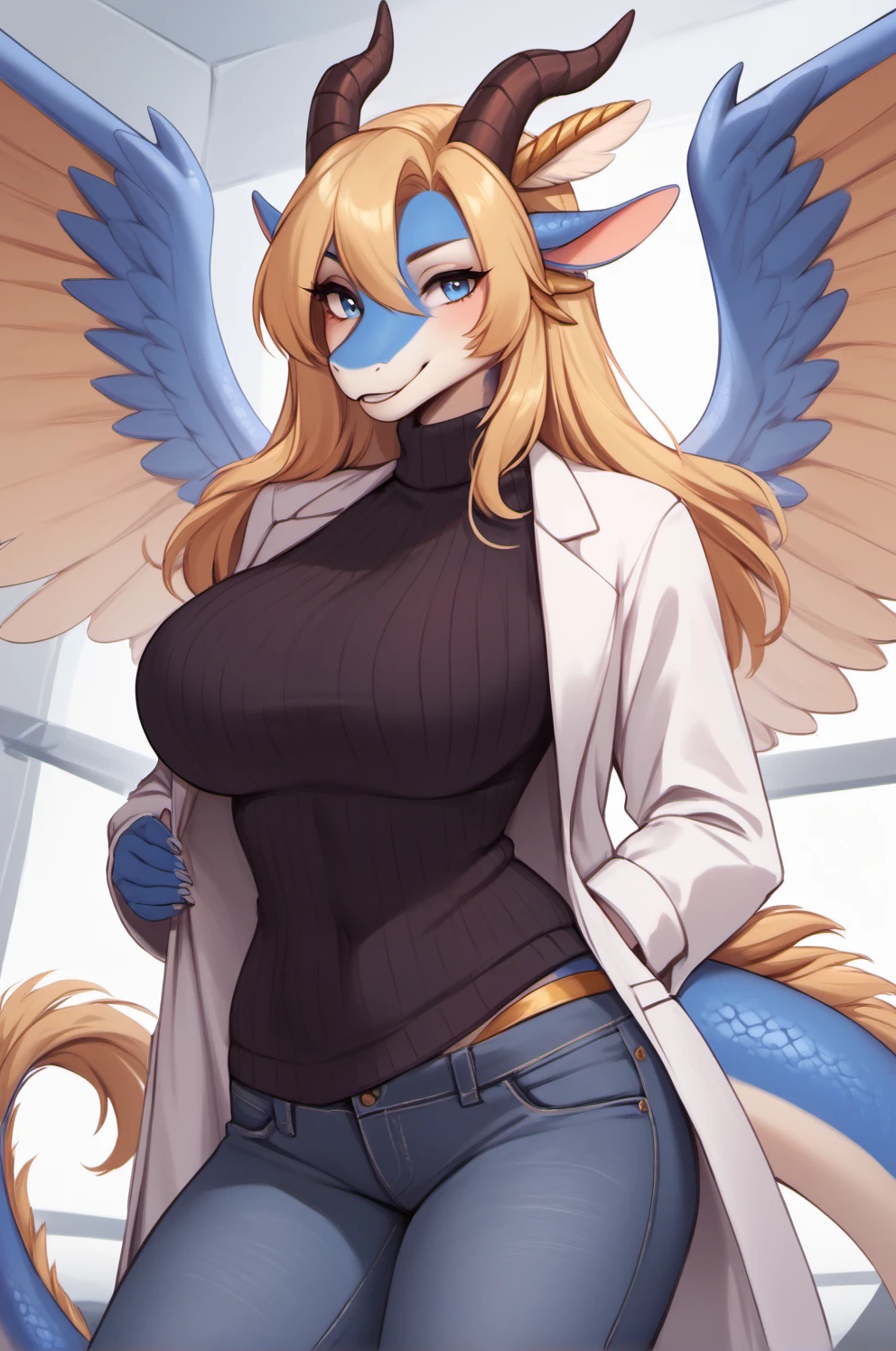 saffira the queen of dragons, furry female, dragon wings, dragon horns, dragon girl, dragon tail, light blue skin, blue eyes,