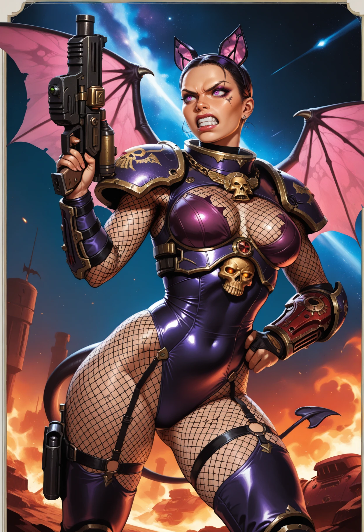 makeup, small bat wings, see-through wings, patterned wings, fishnet ????????, fake ears, curved leotard, black leotard, purple leotard, flame trim leotard, demon tail, thigh straps, garter straps