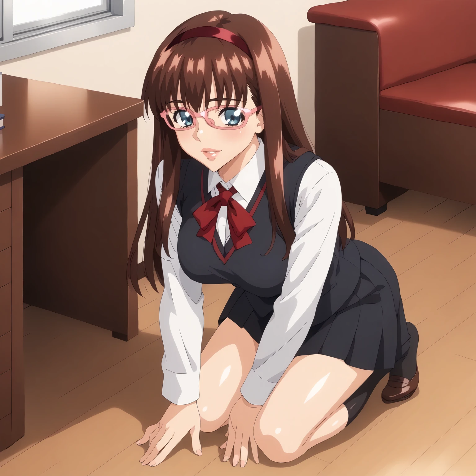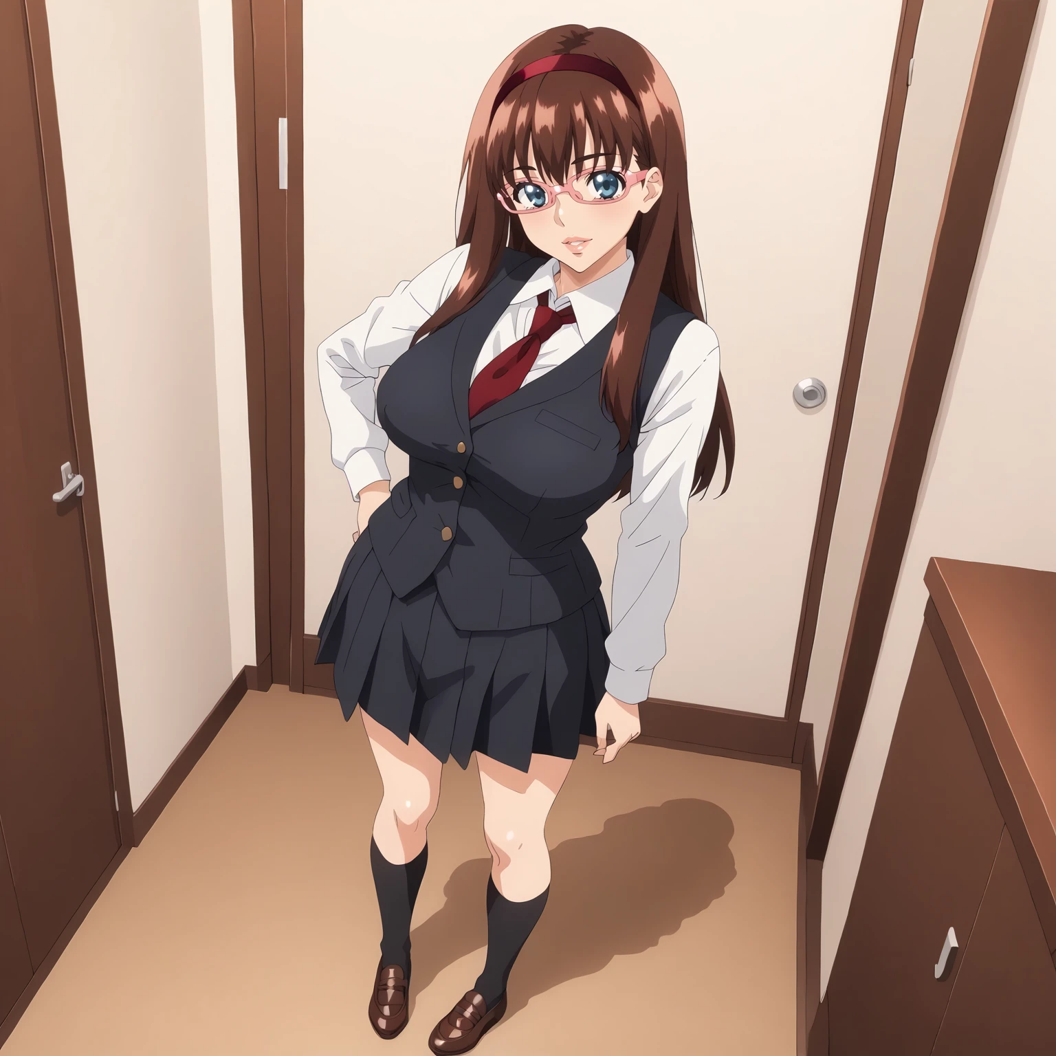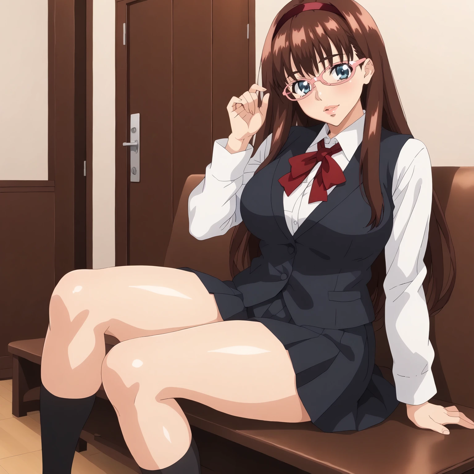 HitomiKurumizawa,1girl,brown hair,long hair,red hair band,blue eyes,pink-framed eyewear, large breasts,