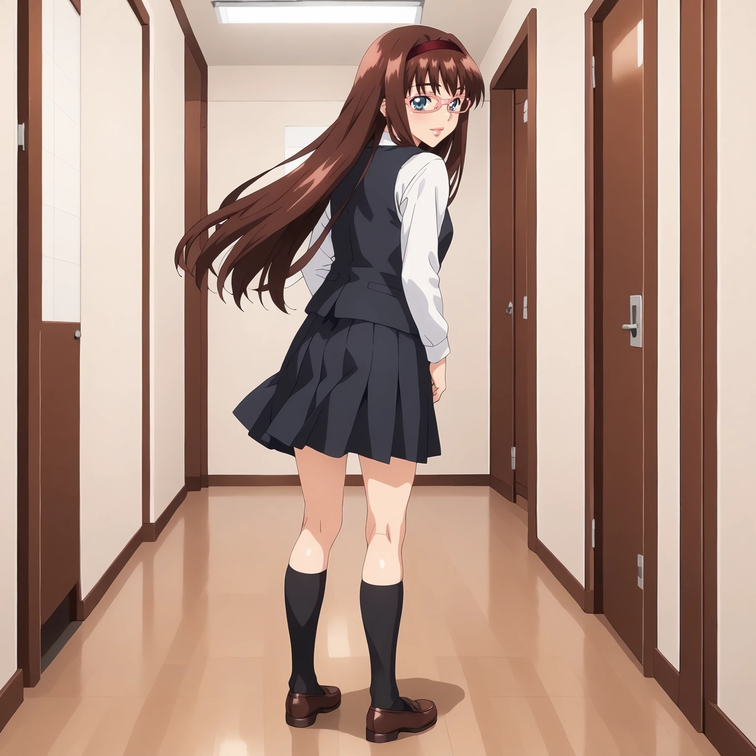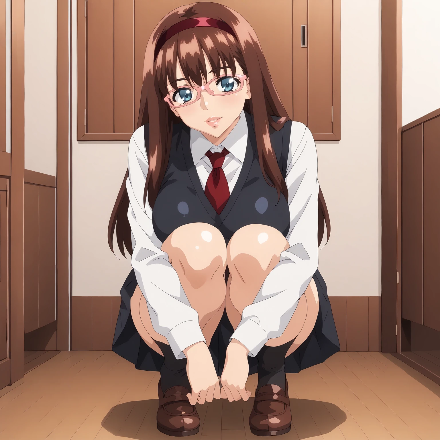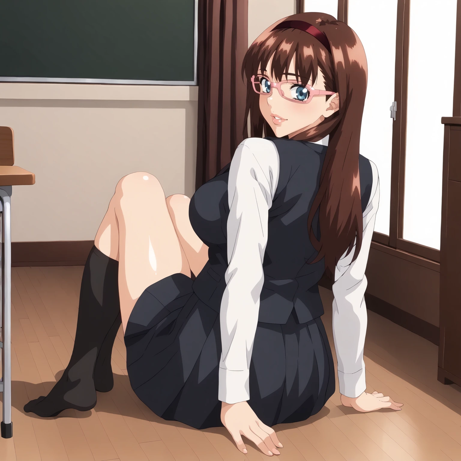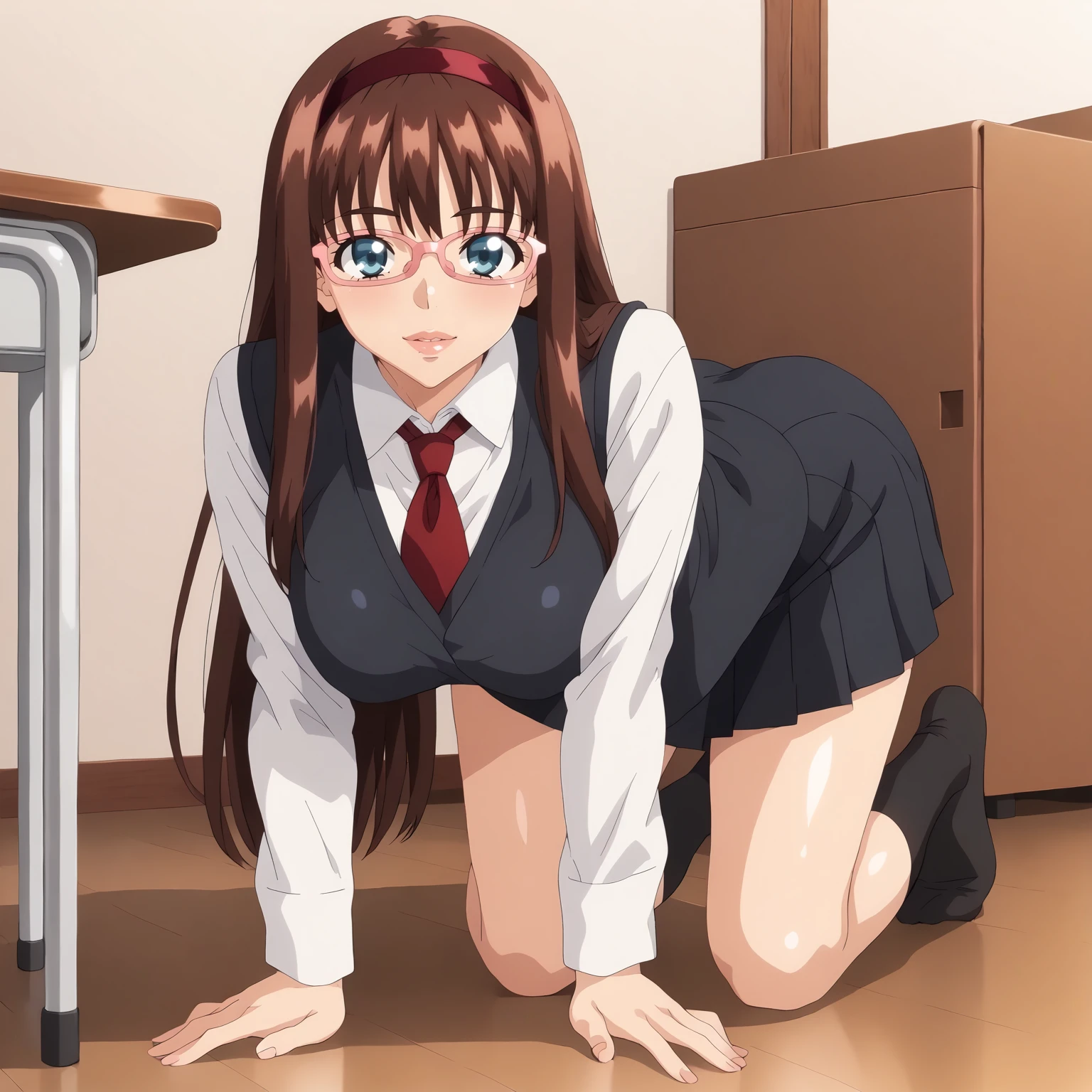 HitomiKurumizawa,1girl,brown hair,long hair,red hair band,blue eyes,pink-framed eyewear, large breasts,