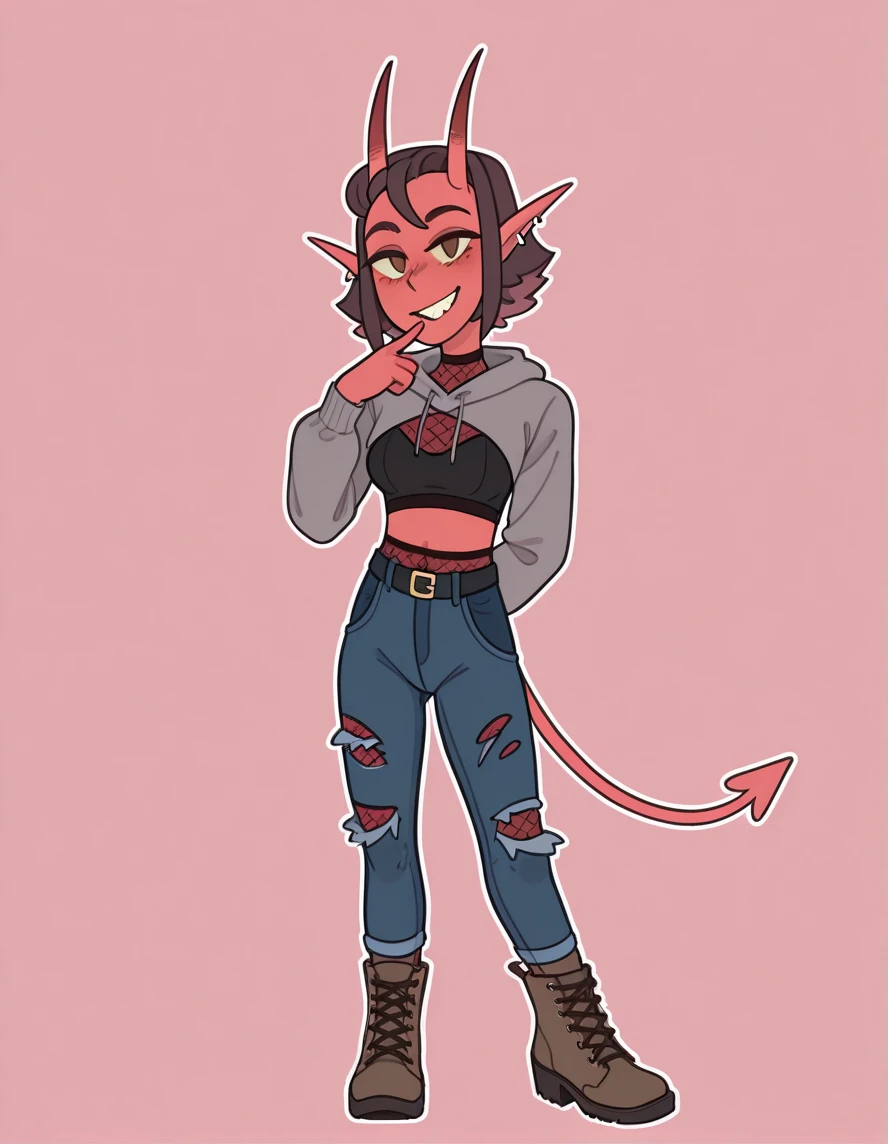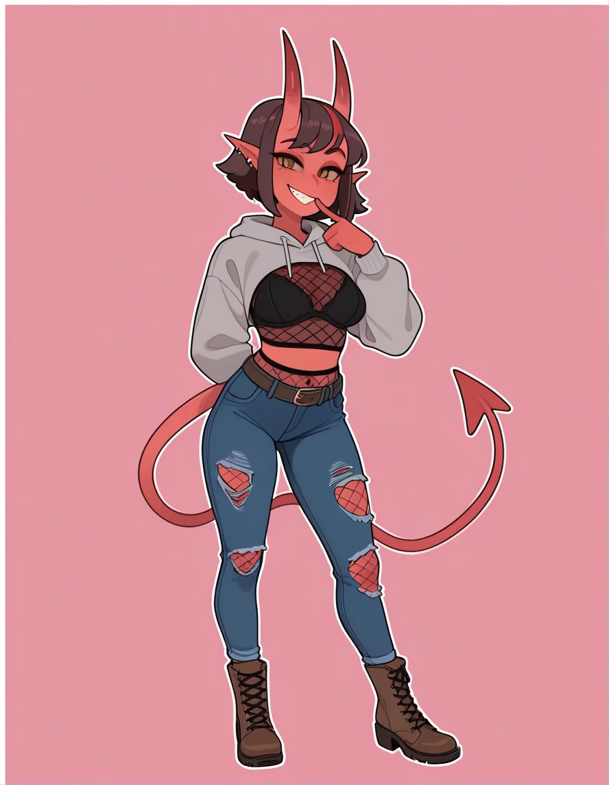 demonsal, 1girl, short hair, black hair, red eyes, tail, earrings, horn, teeth, pointy ears, colored skin, piercing, demon girl, demon horns, sharp teeth, ear piercing, demon tail, colored sclera, red skin, yellow sclera, red tail, black hair