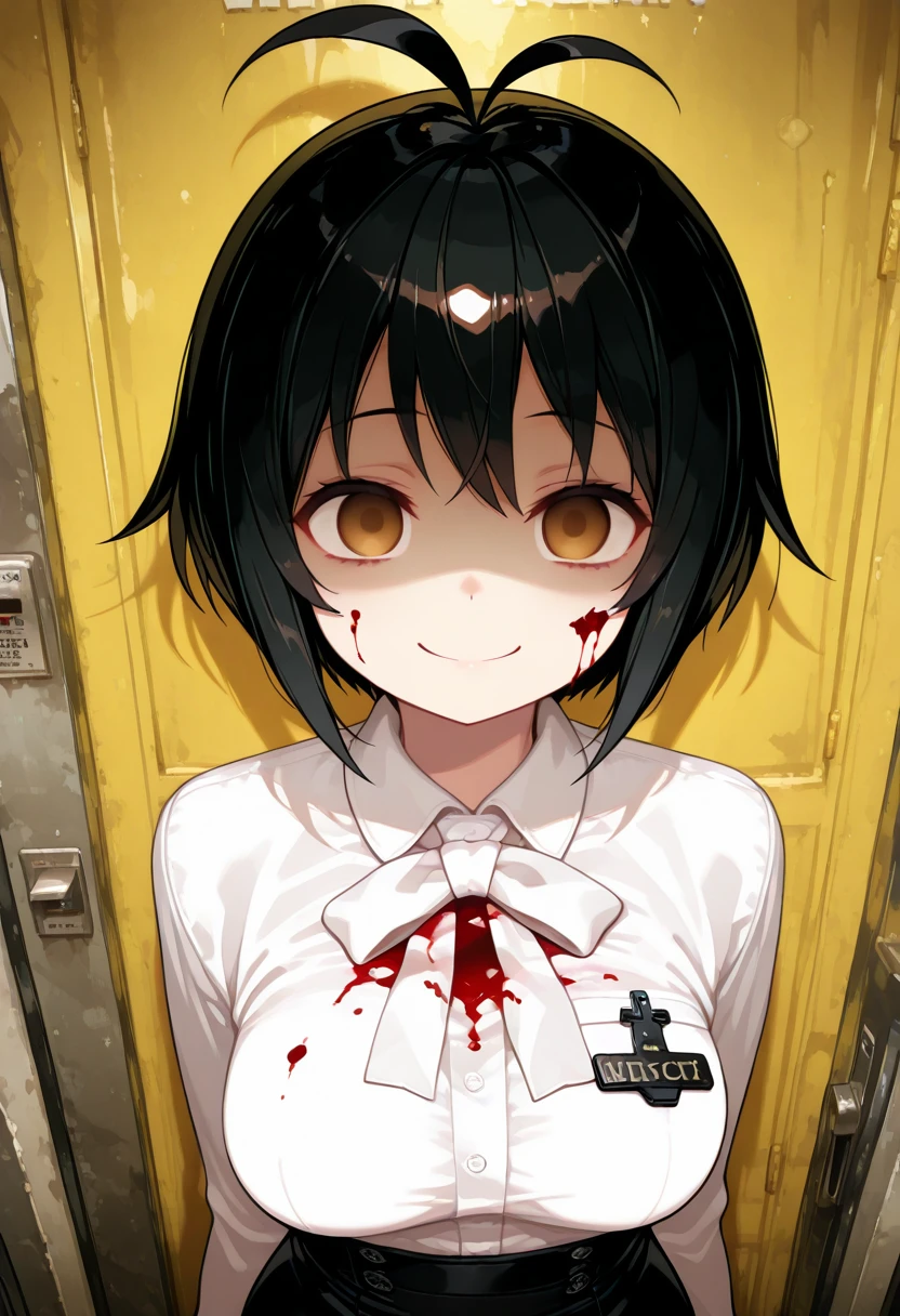 jiyoung, black hair, short hair, antenna hair, empty eyes, white blouse, white neck ribbon, black pencil skirt, black thighhigh, black loafer