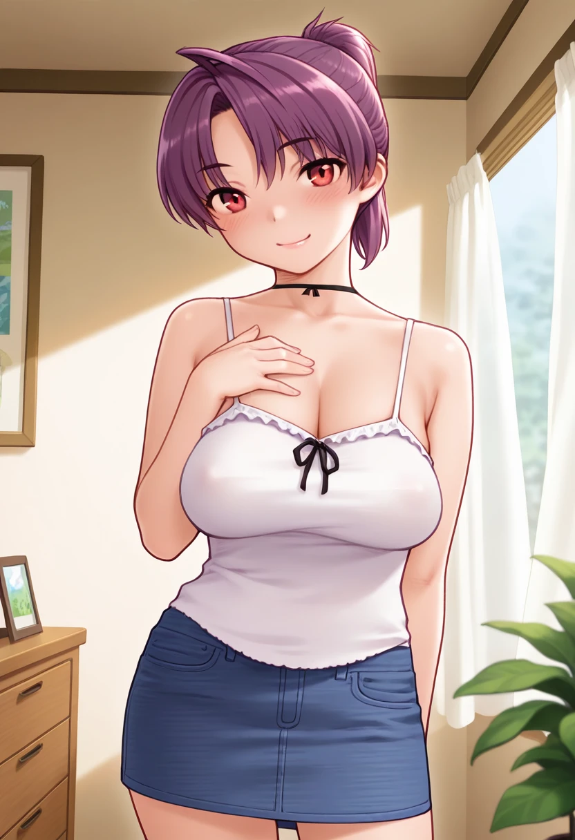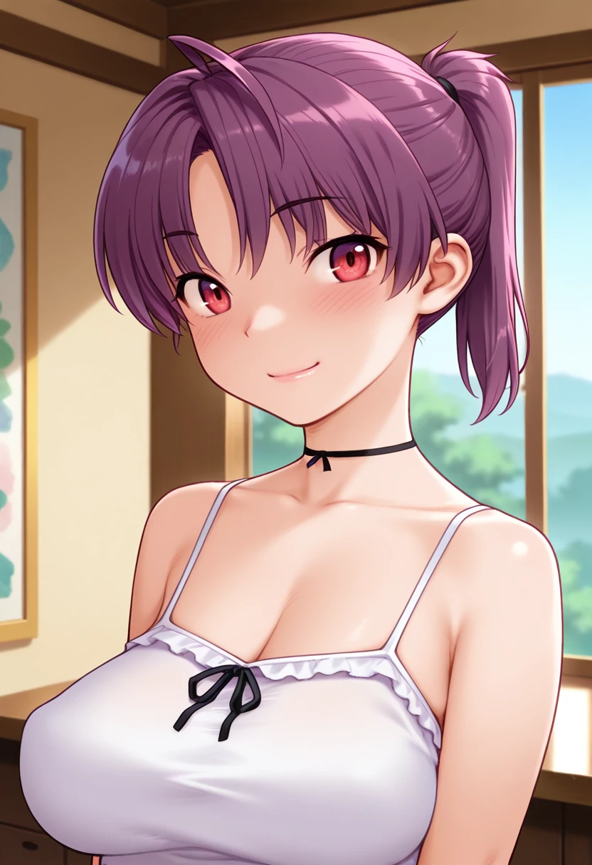 chinatsuww, red eyes, purple hair, short hair, ponytail, parted bangs, ahoge, large breasts,
