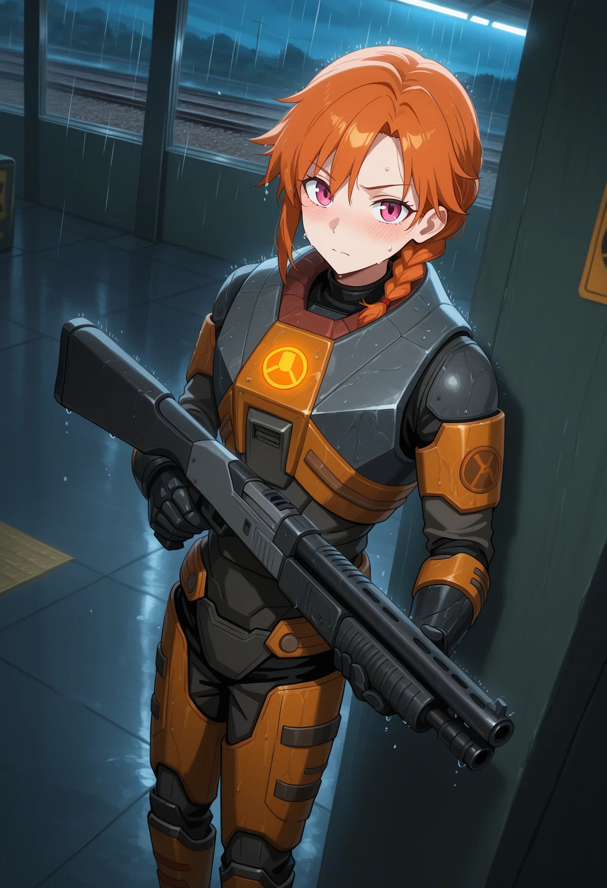 main trigger: HEV_λ,HEV suit from Half-Life,hev suit,hazmat suit, bright orange and dark gray armor, lambda logo on chest, Technological Armor,black gauntlets,orange vambraces,Orange striped paint,gorget,orange codpiece,power armor,boots