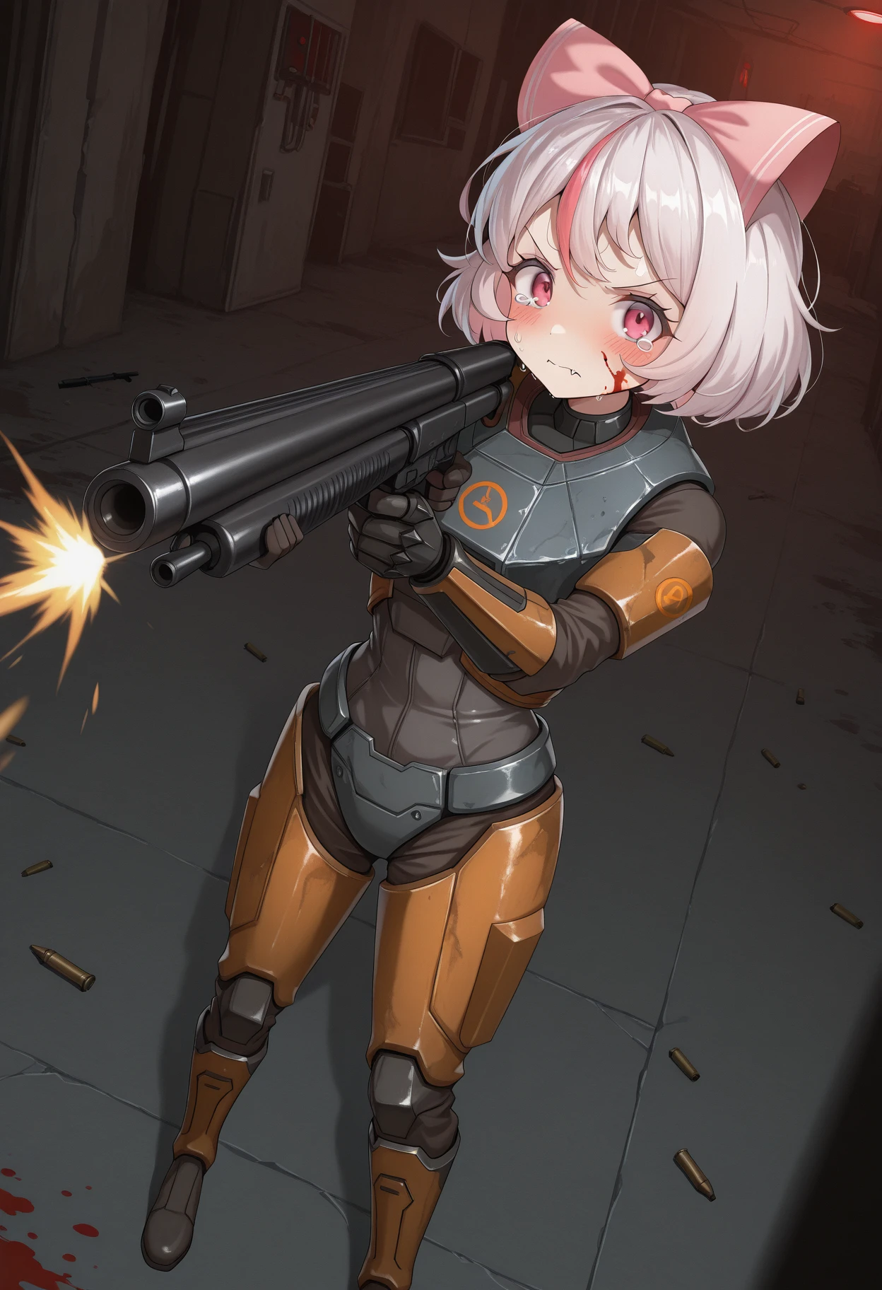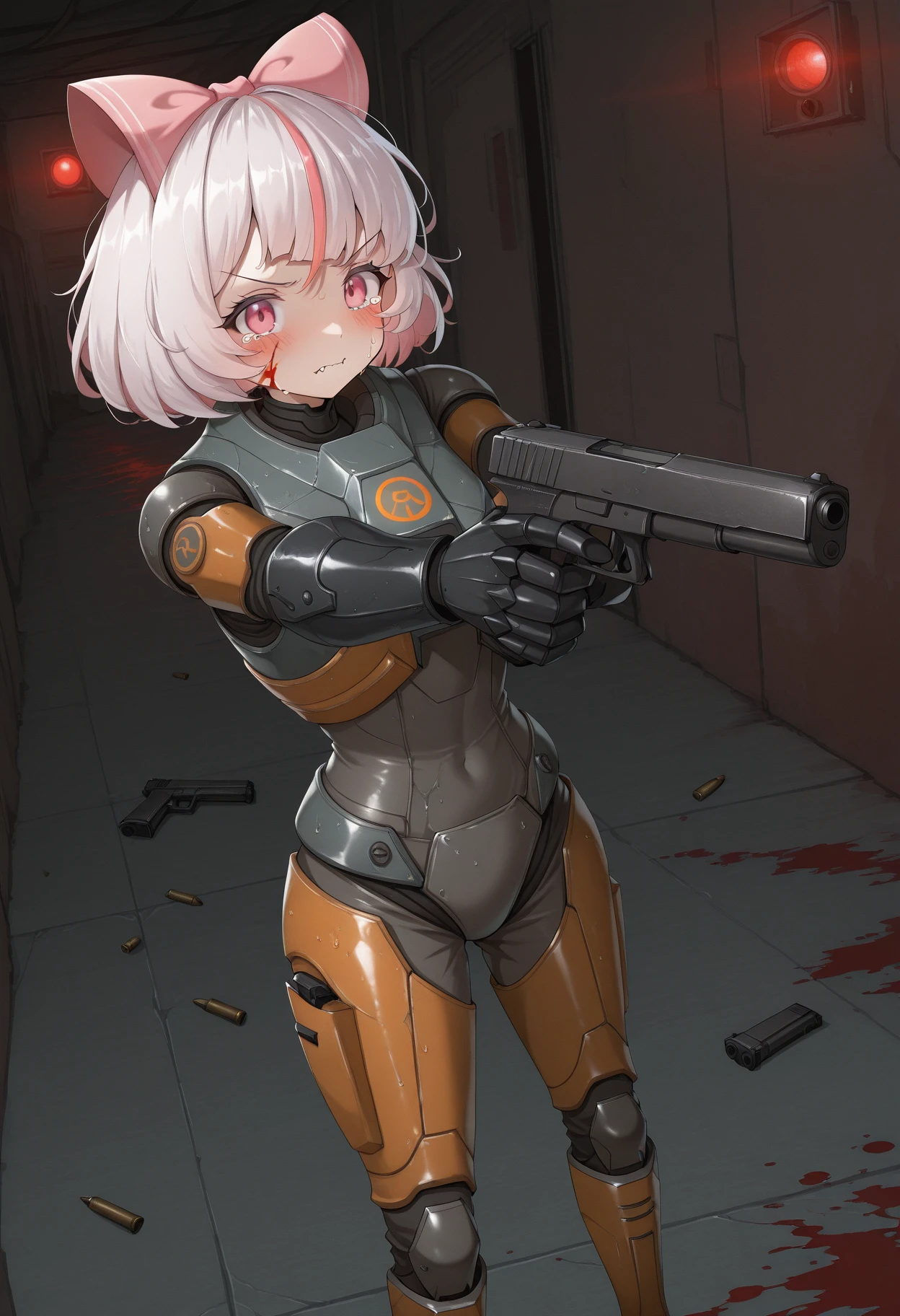 underground research lab,red Emergency lighting,broken glass volumetric flasks,blood on face,blood on armor