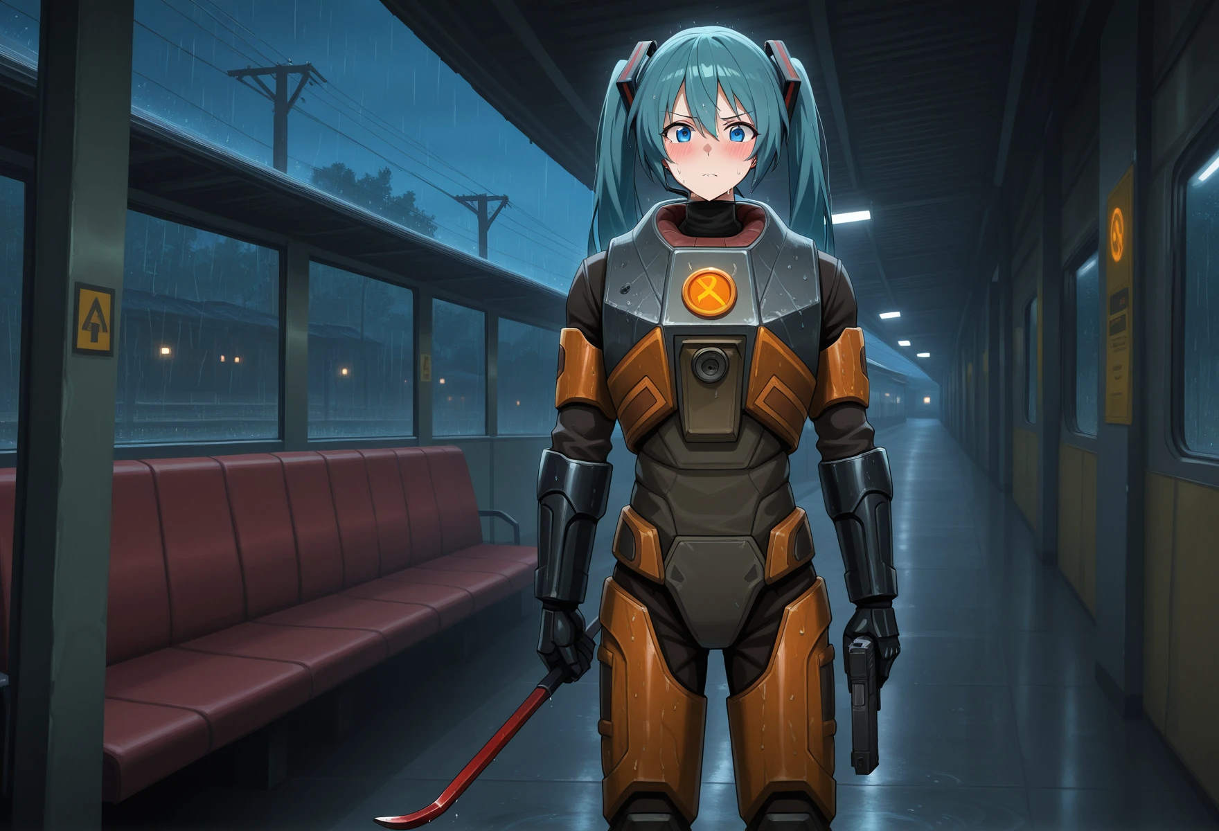 HEV suit from Half-Life,hev suit,hazmat suit, bright orange and dark gray armor, lambda logo on chest, Technological Armor,black gauntlets,orange vambraces,Orange striped paint,gorget,orange codpiece,power armor,boots