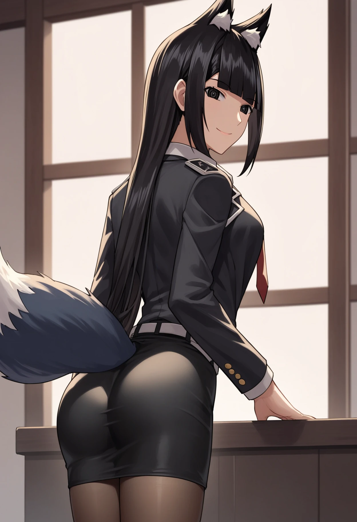 shiBelialADRIAN, long hair, fox ears, blunt bangs, tail, large breasts, collared shirt, necktie, jacket, jacket on shoulders, long sleeves, belt, pantyhose, miniskirt,