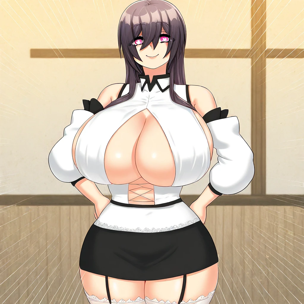 5. ((?????? cut-out white shirt with black edge, obscene cleavage, huge cleavage, sexy black skirt, white tighhighs, black garter belt, ))