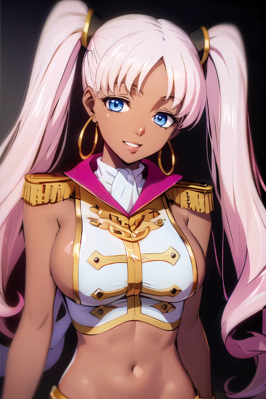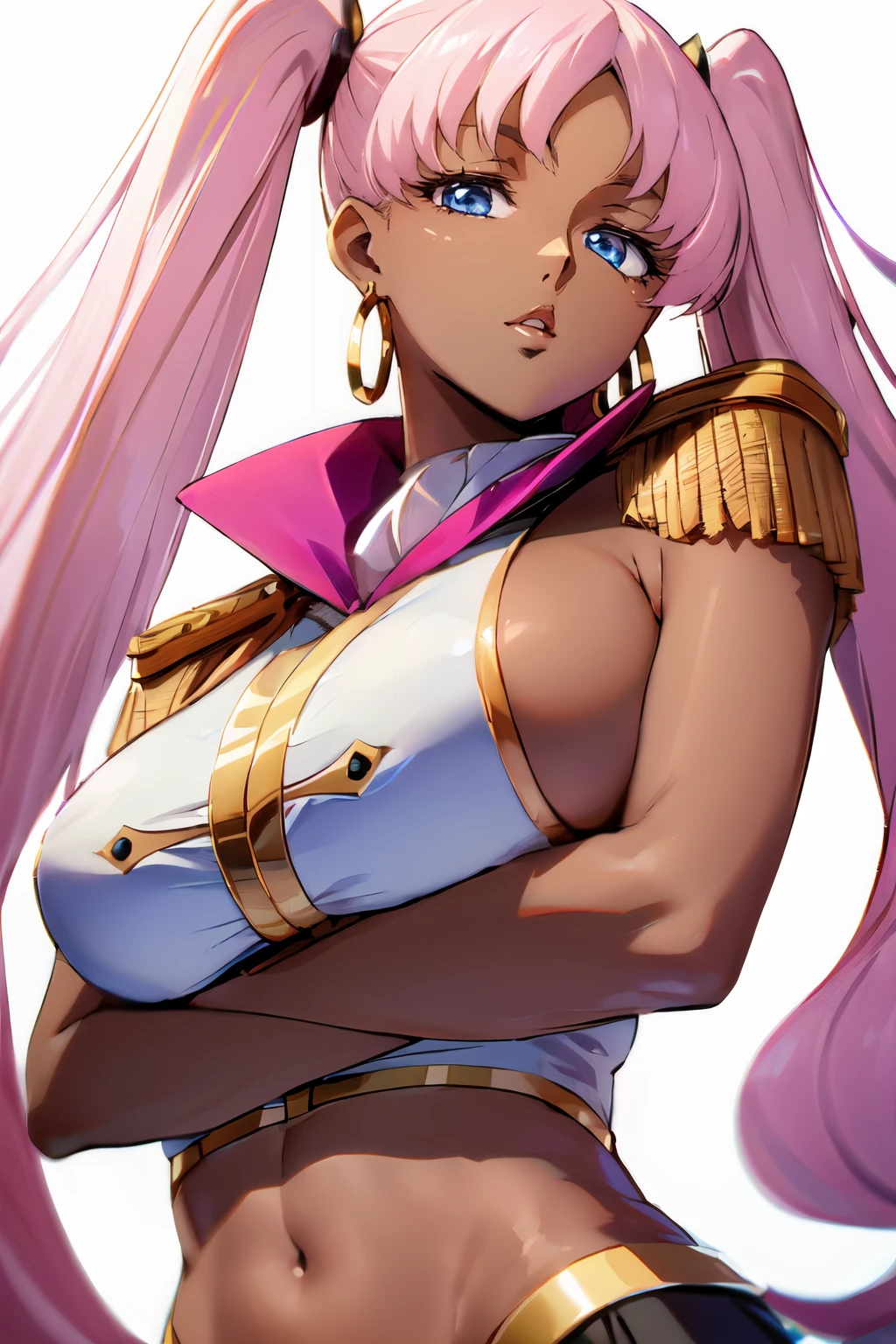 Prompt: dark-skinned female, long hair, twintails, parted bangs, pink hair, earrings, hoop earrings, blue eyes, large breasts, sideboob, midriff, navel,