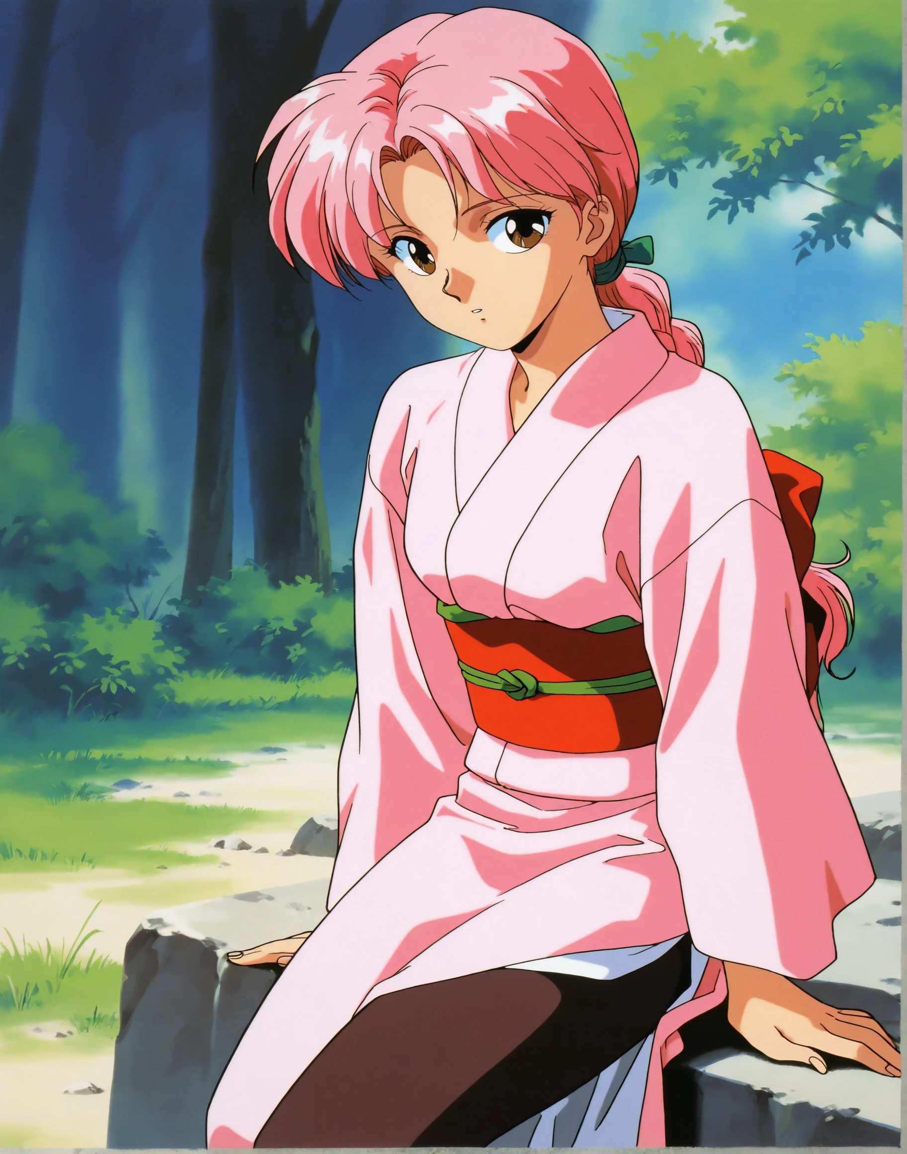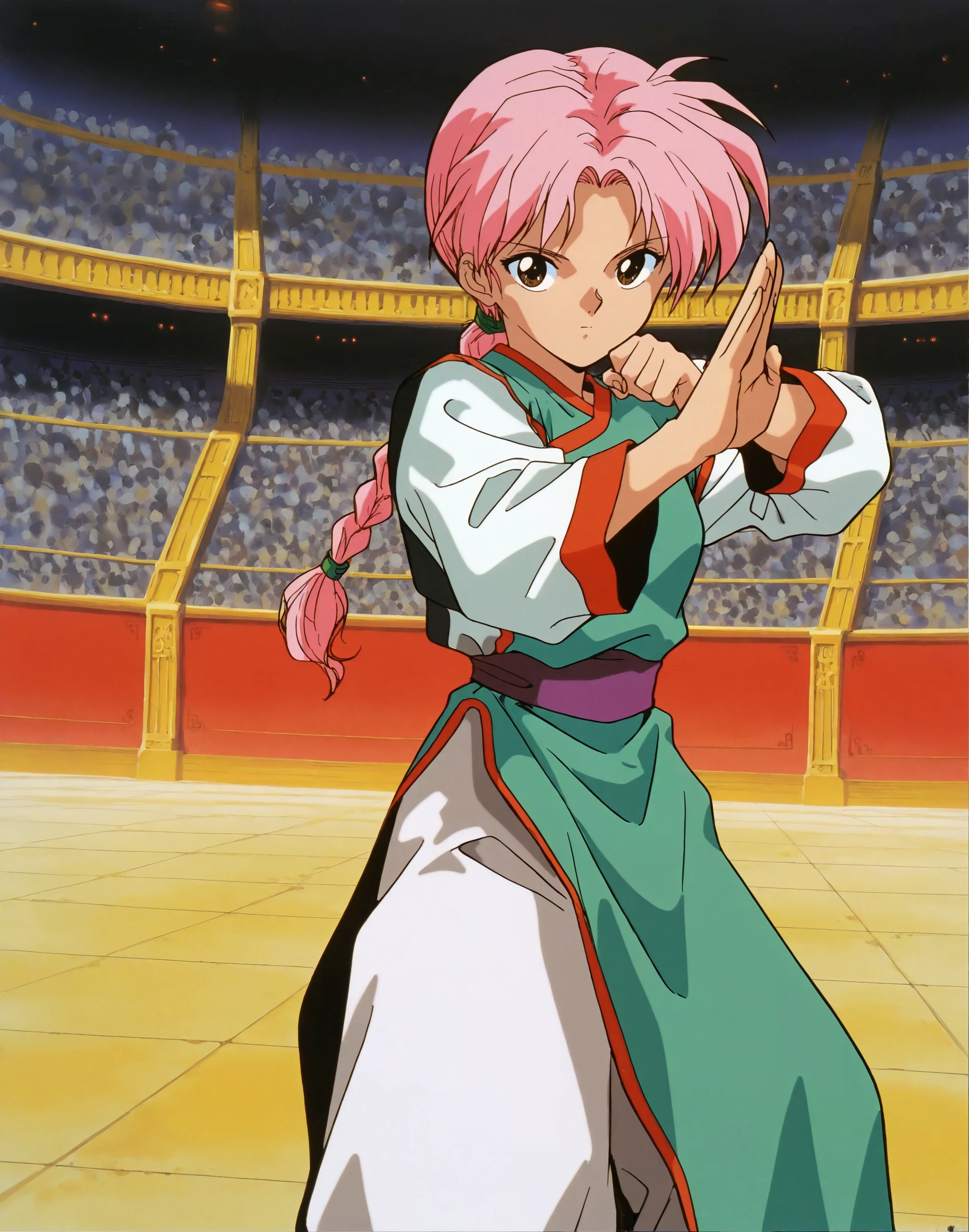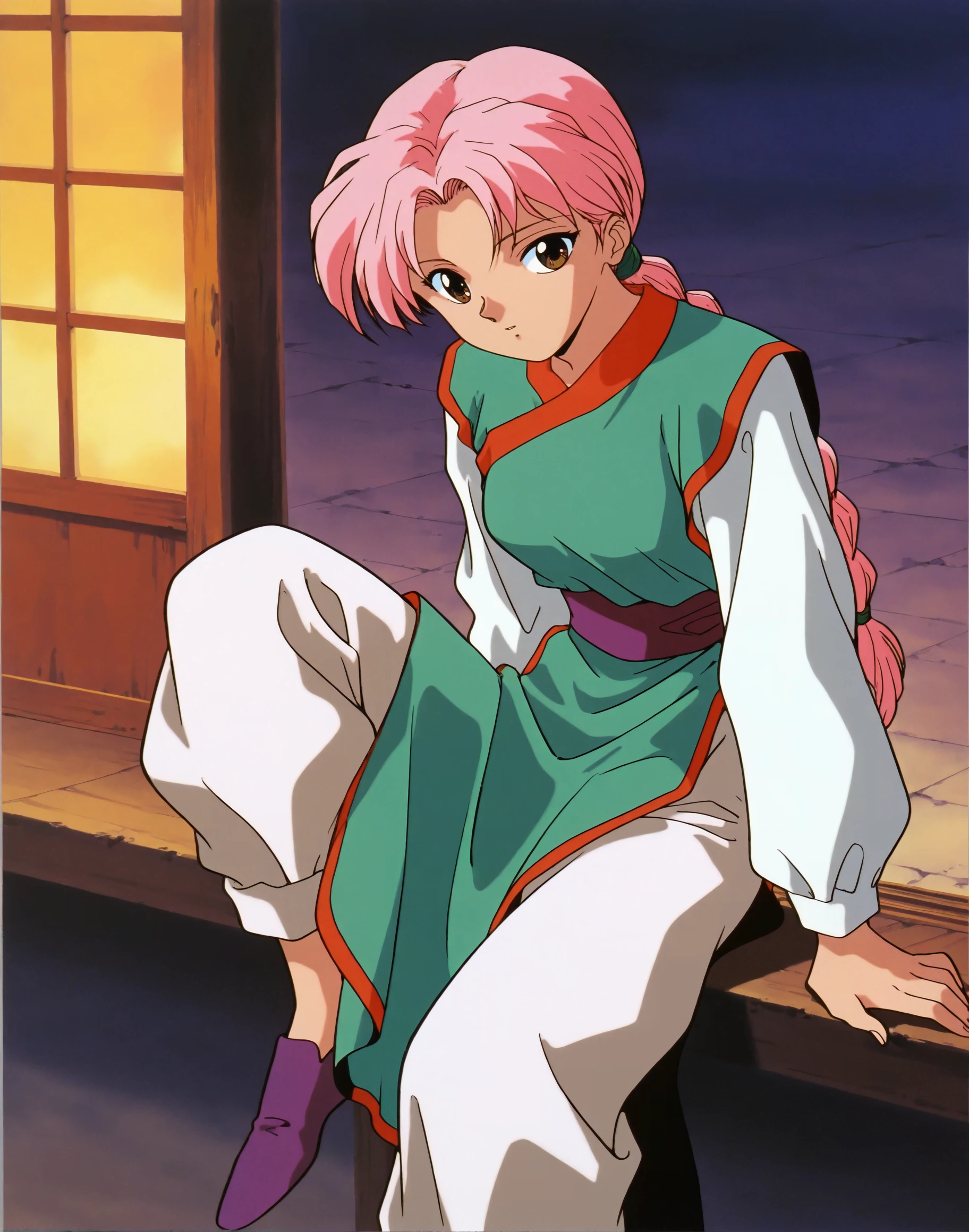 genkai01,c2, pink hair,braid, ponytail, long sleeves,, long hair, chinese clothes, brown eyes, white pants, robe, purple sash, purple footwear, white shirt, puffy pants, parted bangs,china dress, green dress,