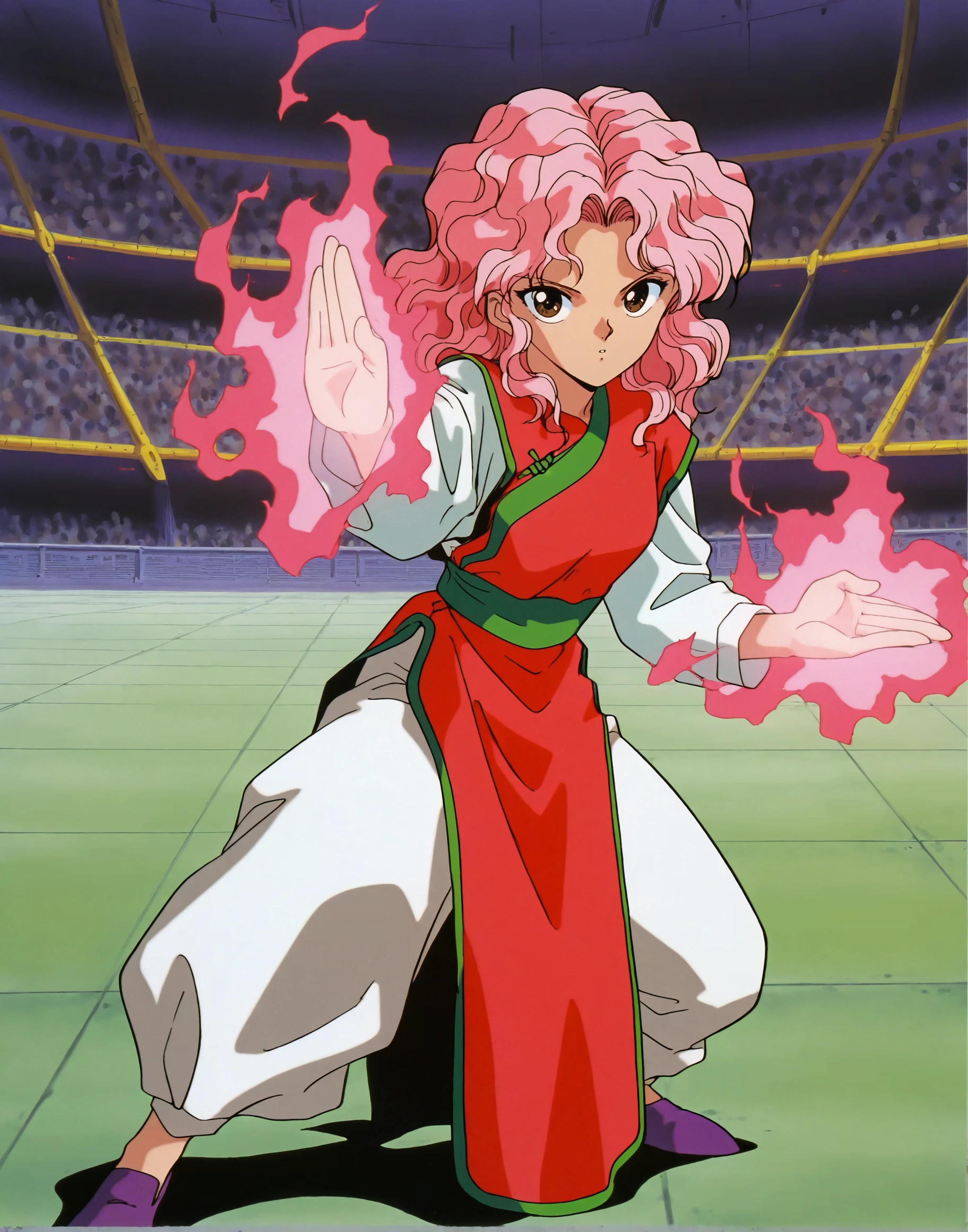 genkai01,c1, pink hair, long hair, long sleeves, white pants, wavy hair, purple footwear, brown eyes, chinese clothes, medium hair, parted bangs, robe, white shirt, baggy pants,green sash,red dress,