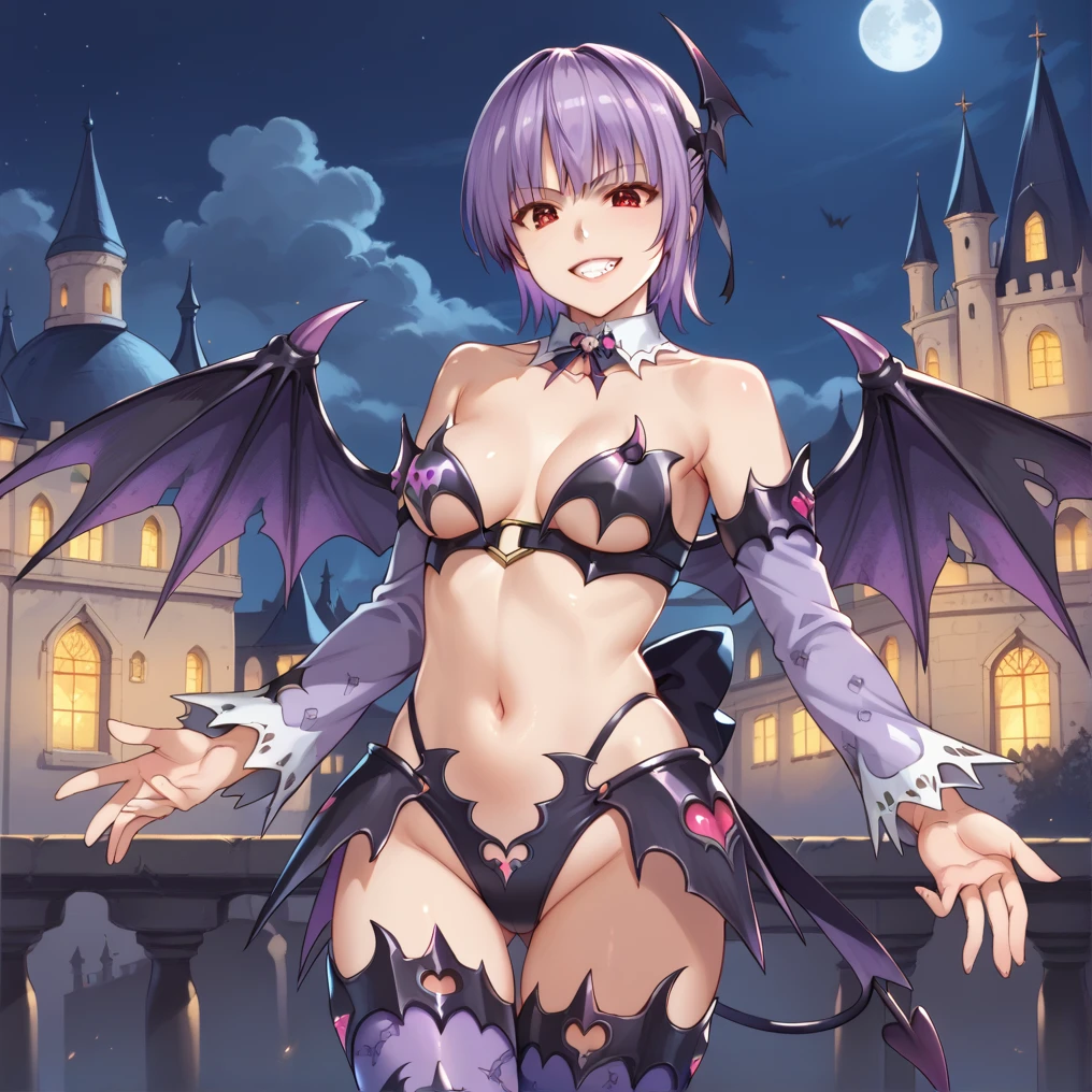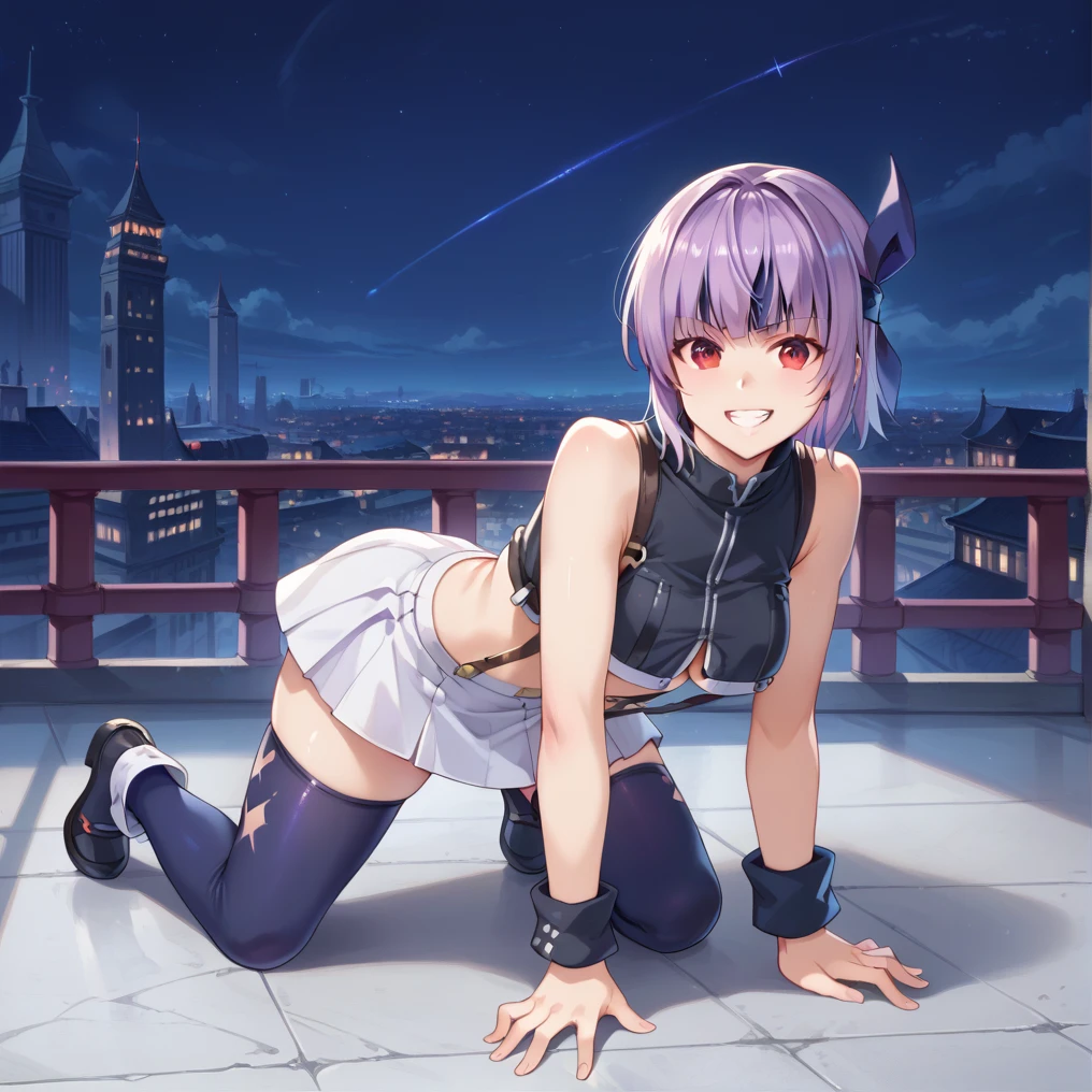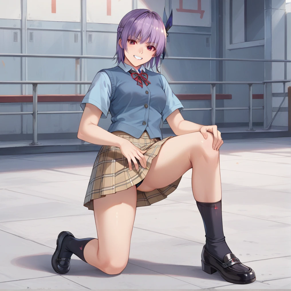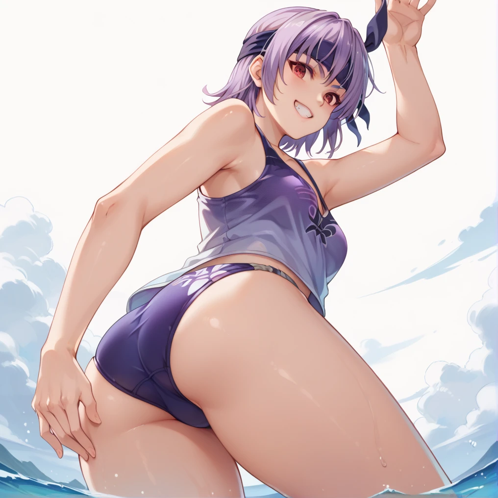 ayane, red eye, purple hair, short hair, headband,classic outfit