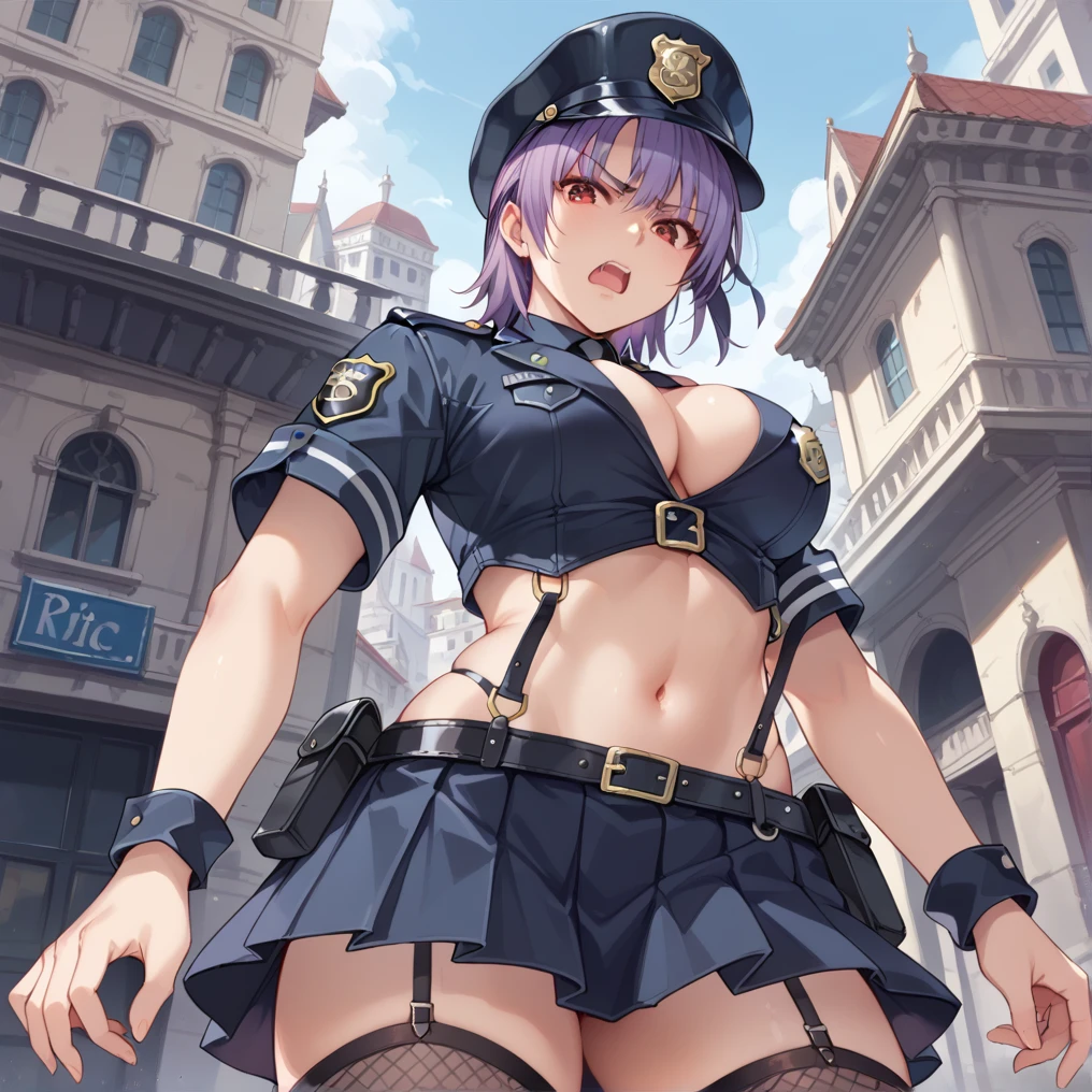 ayanepolice, black police uniform, fishnet thighhighs, navel, police hat, crop top, miniskirt, pleated skirt, short sleeves, cleavage