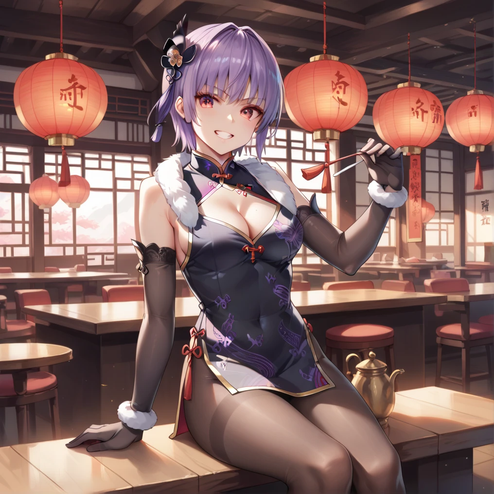 hair ornaments, ayanechina, long china dress, pantyhose, cleavage, white neck far. black pantyhose elbow gloves,mandarin outfit