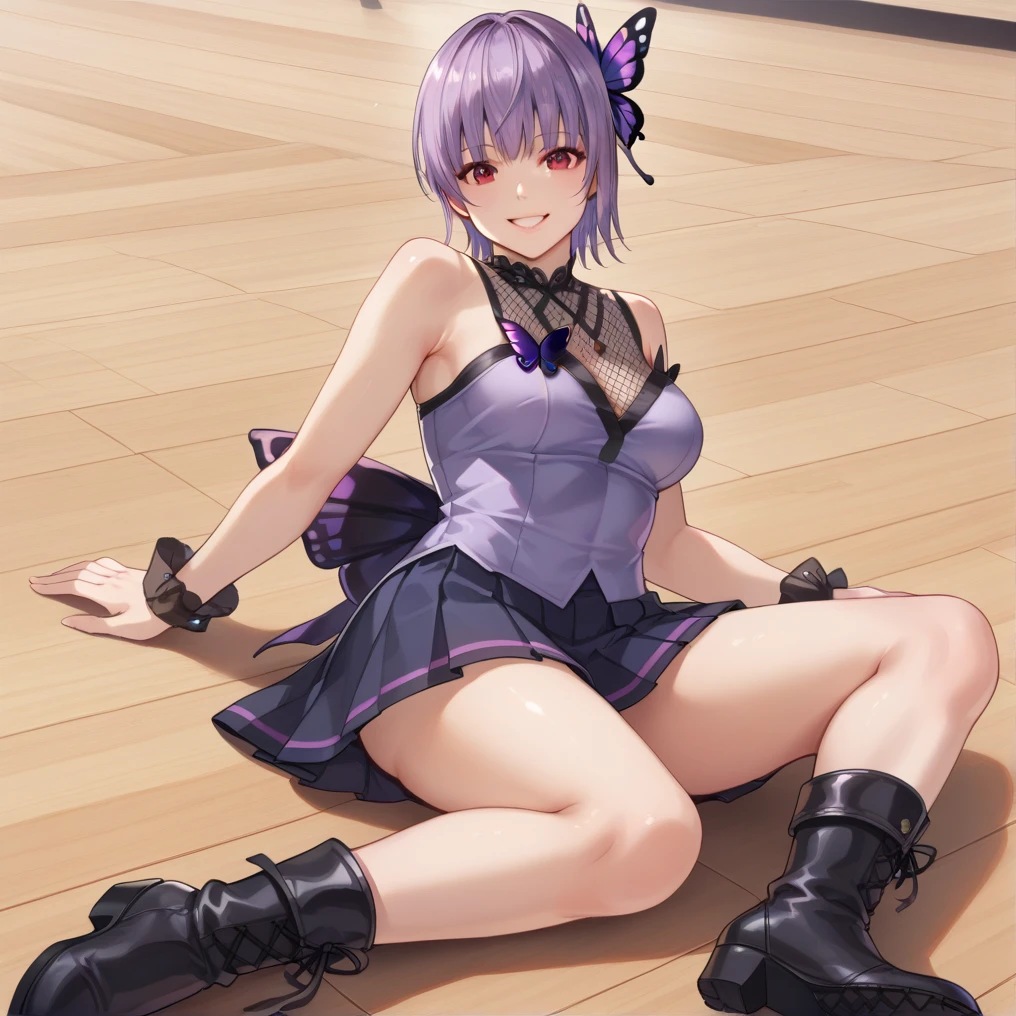 ayaneidol, butterfly hair ornament, bare shoulders, pleated skirt, dress, sleeveless, breast covered fishnets, bare legs, black boots,