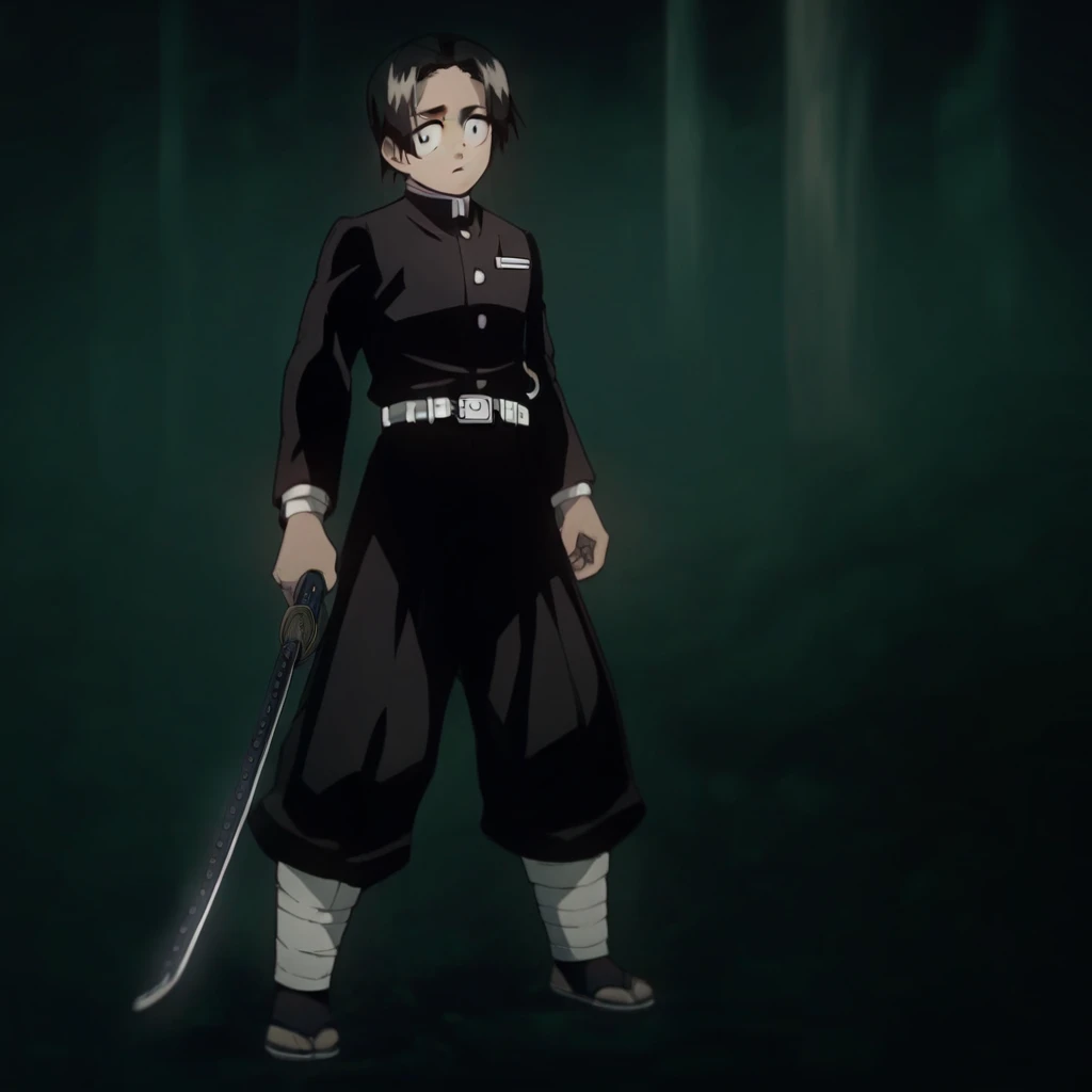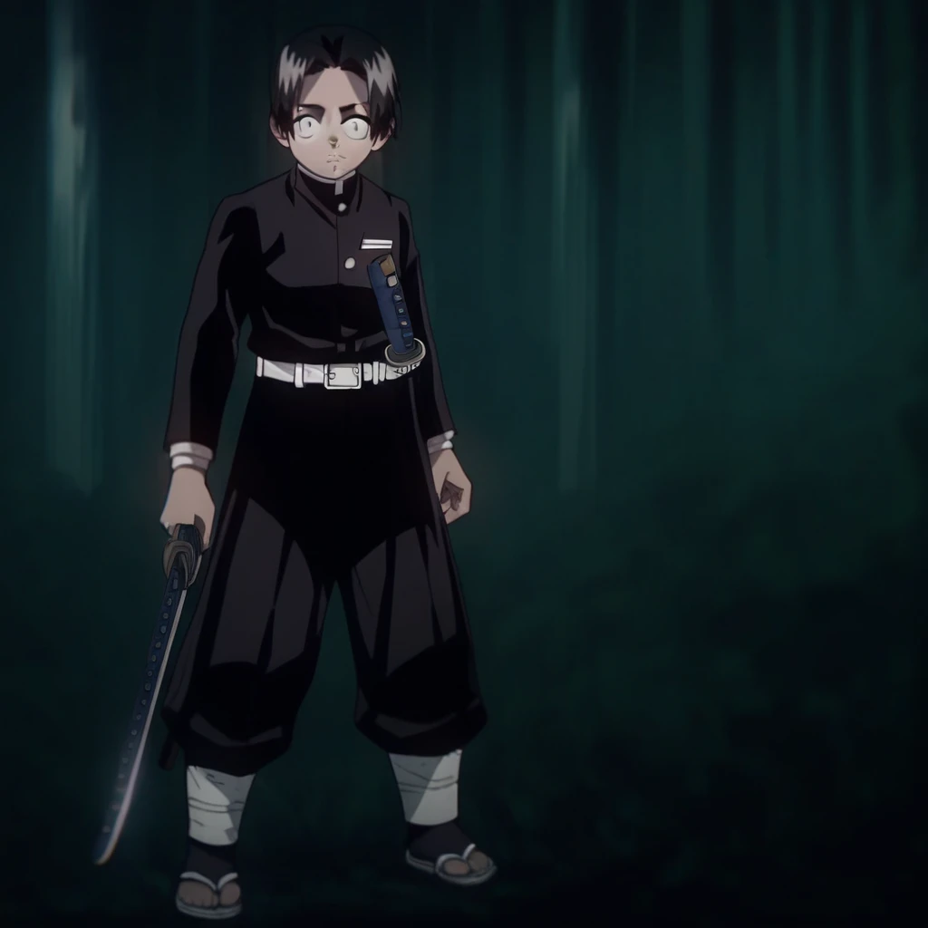 demon slayer uniform, katana, belt, pants, long sleeves, sheath, jacket, white belt, black jacket, black pants,
