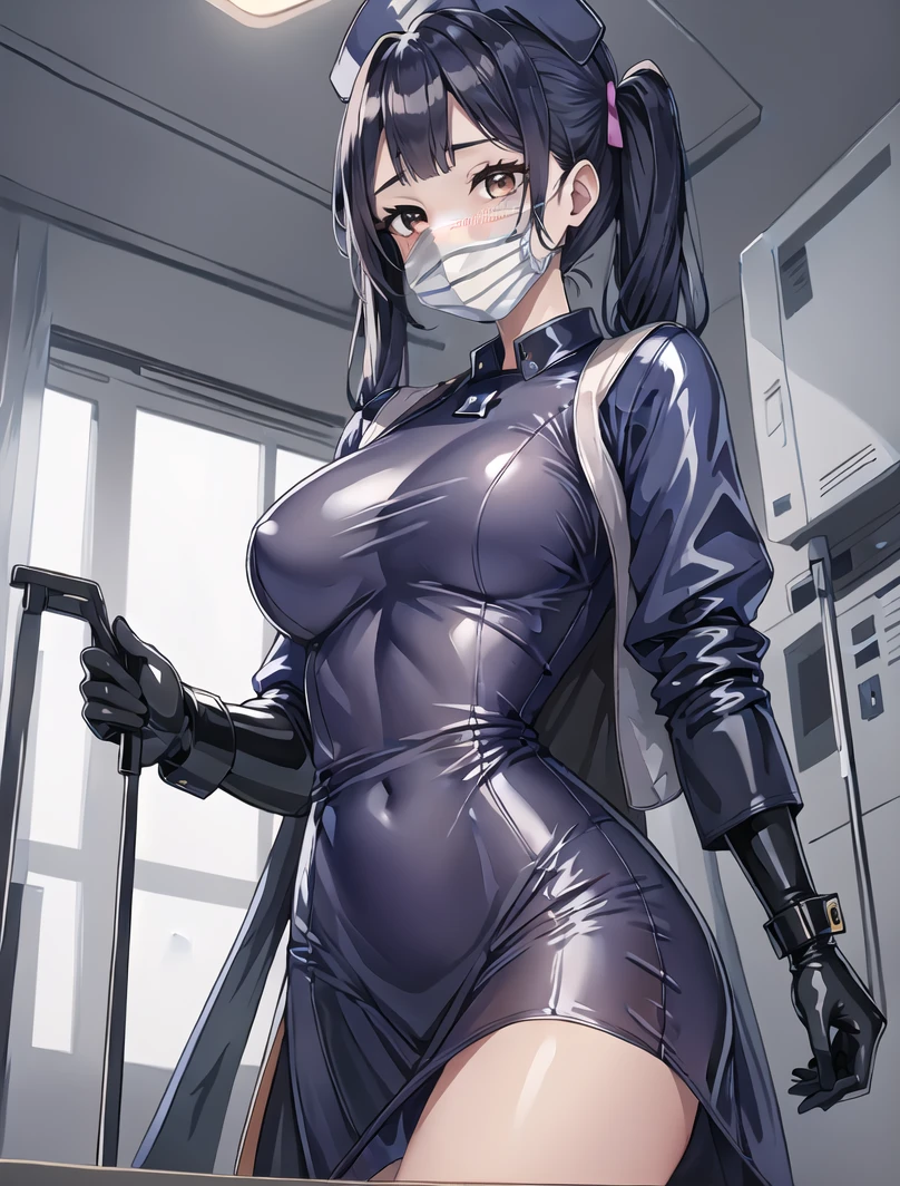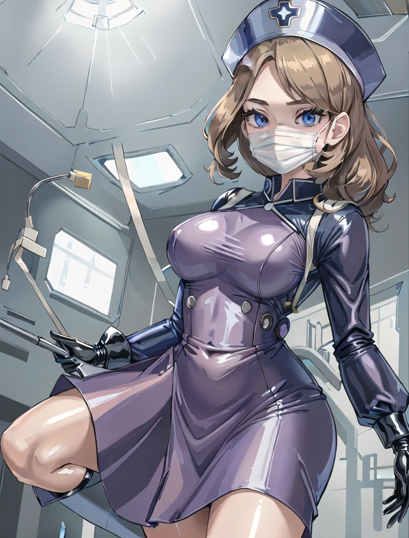 latex_nurse_surgical, mouth mask, latex, gloves, surgical mask, nurse cap,long dress,long sleeves,shiny uniform