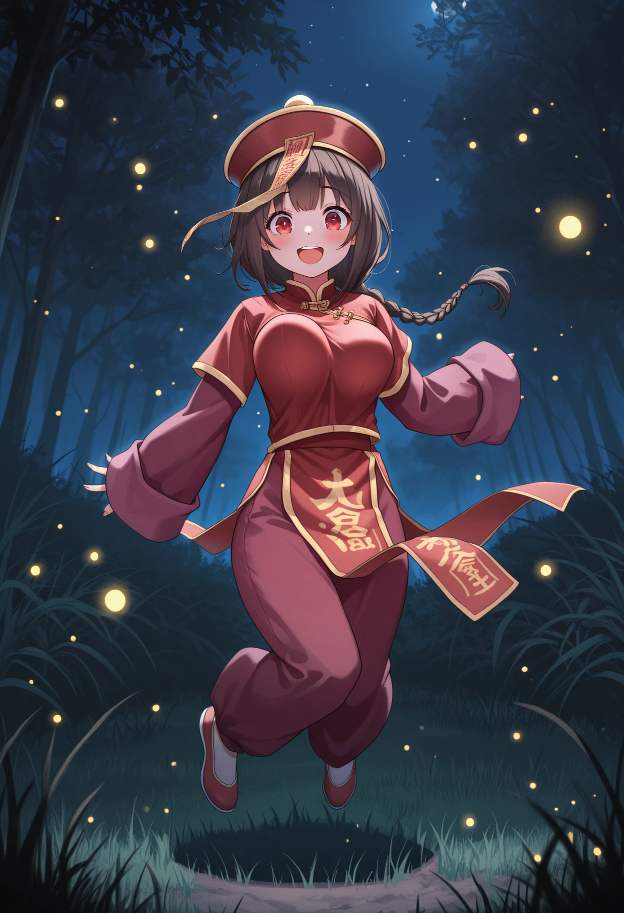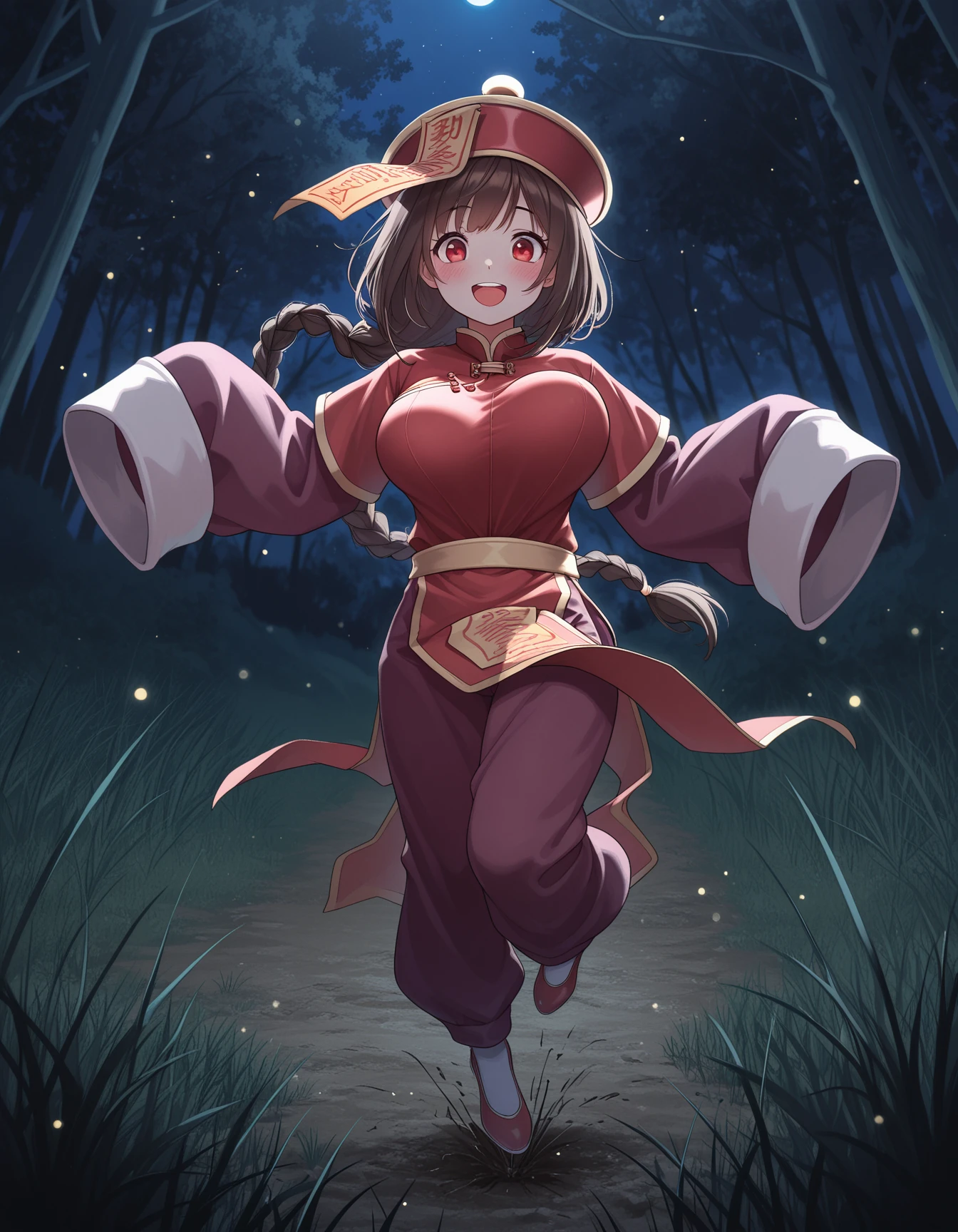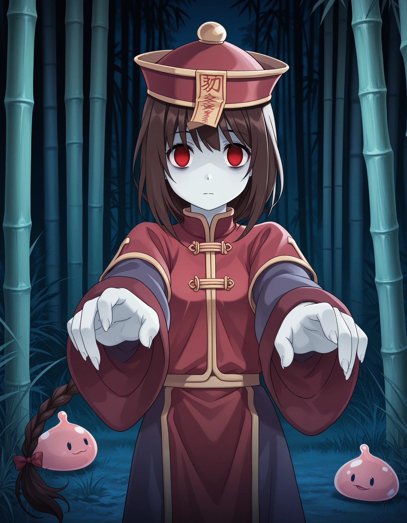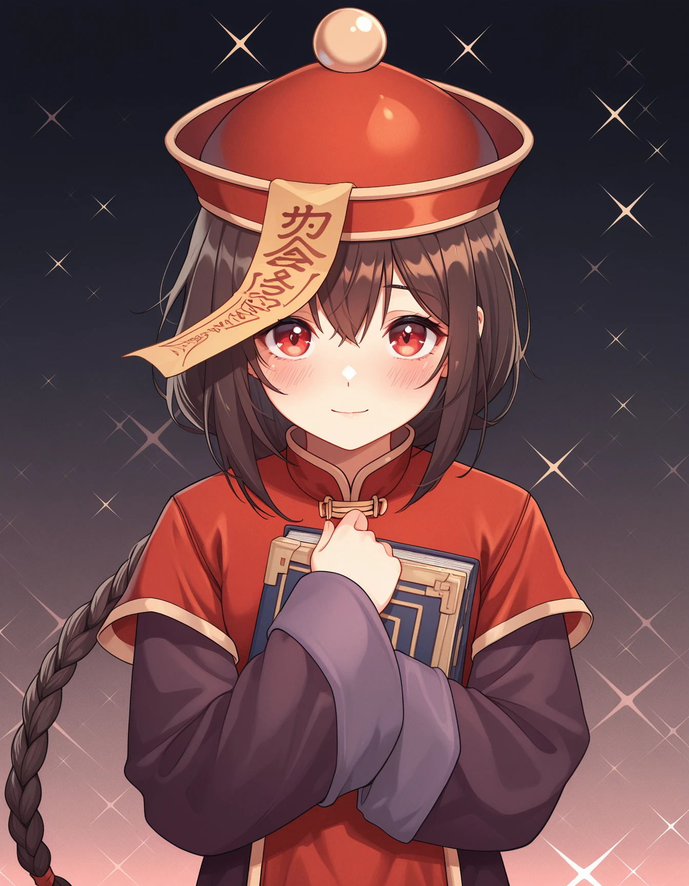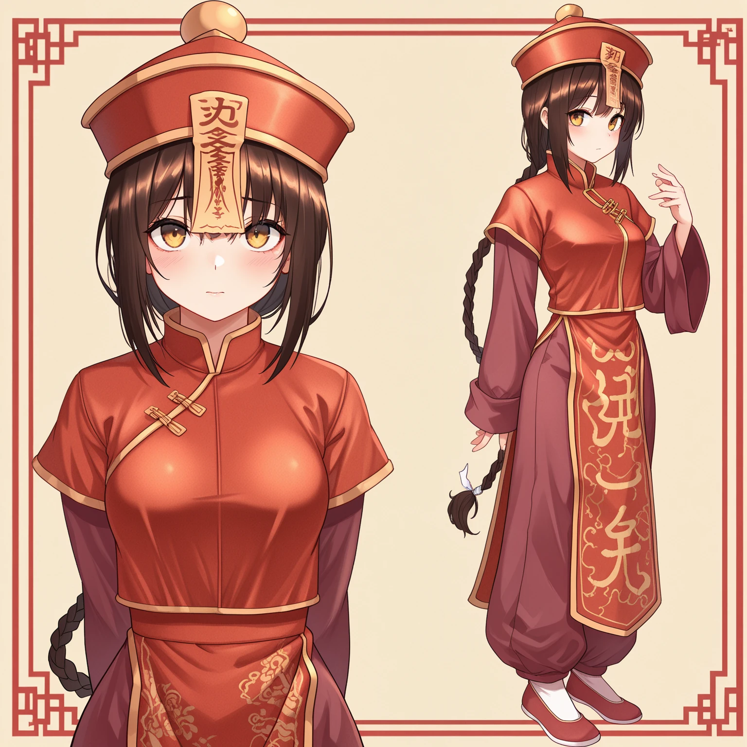 Pony version works fine with just "1girl, MUN4K", but adding a few other tags can be helpful, such as "red eyes, brown hair, single braid, qing guanmao, ofuda, wide sleeves, sleeves past wrists, chinese clothes".