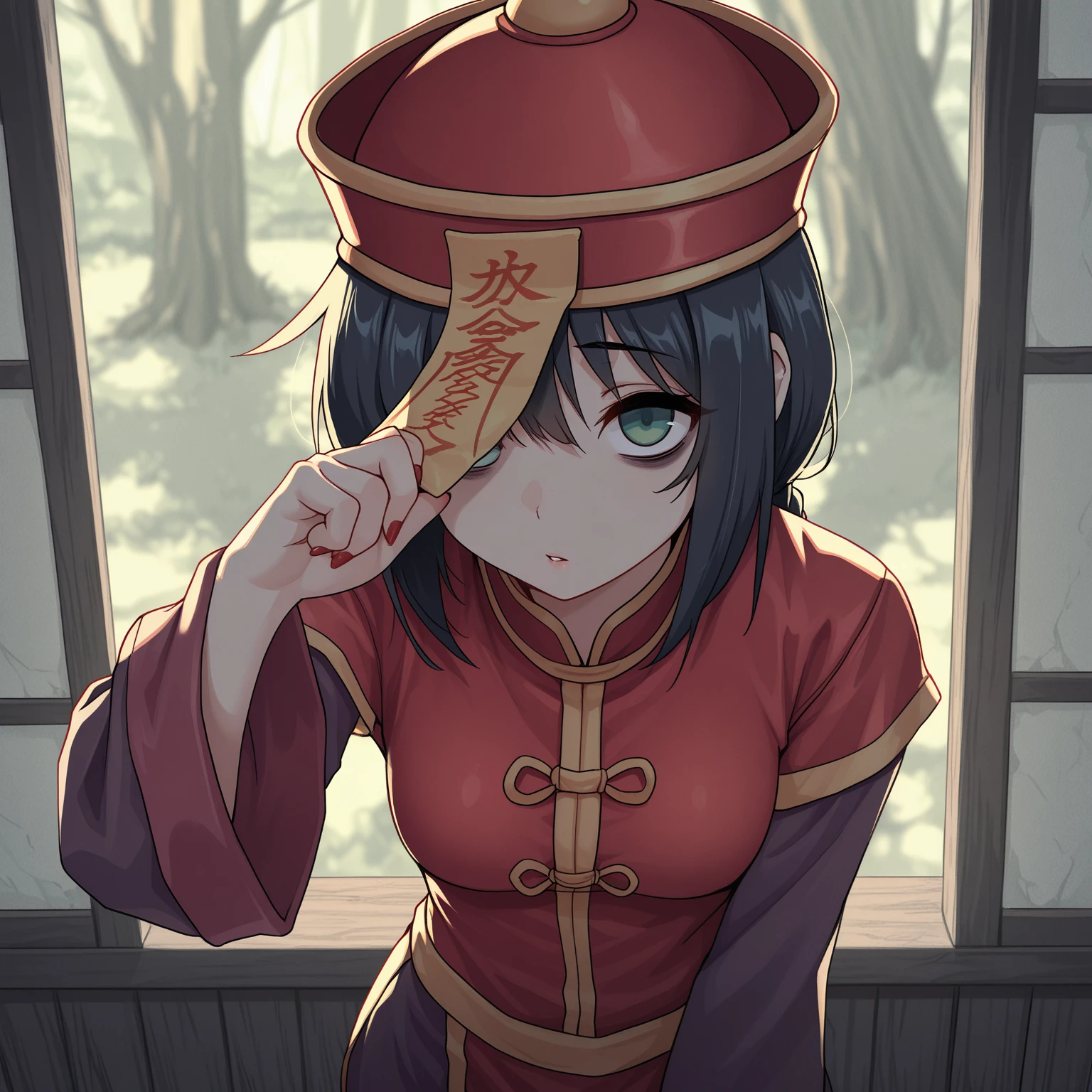 You can use the tags "one eye covered, ofuda" if you want her amulet to cover her face some more.