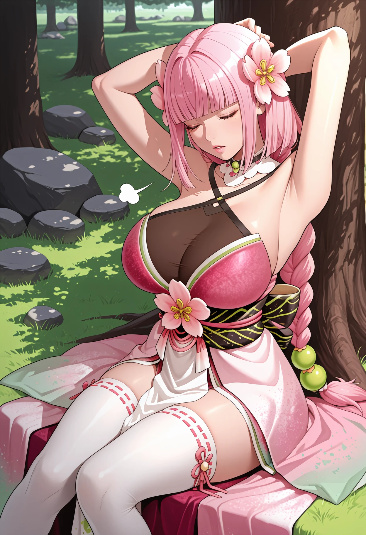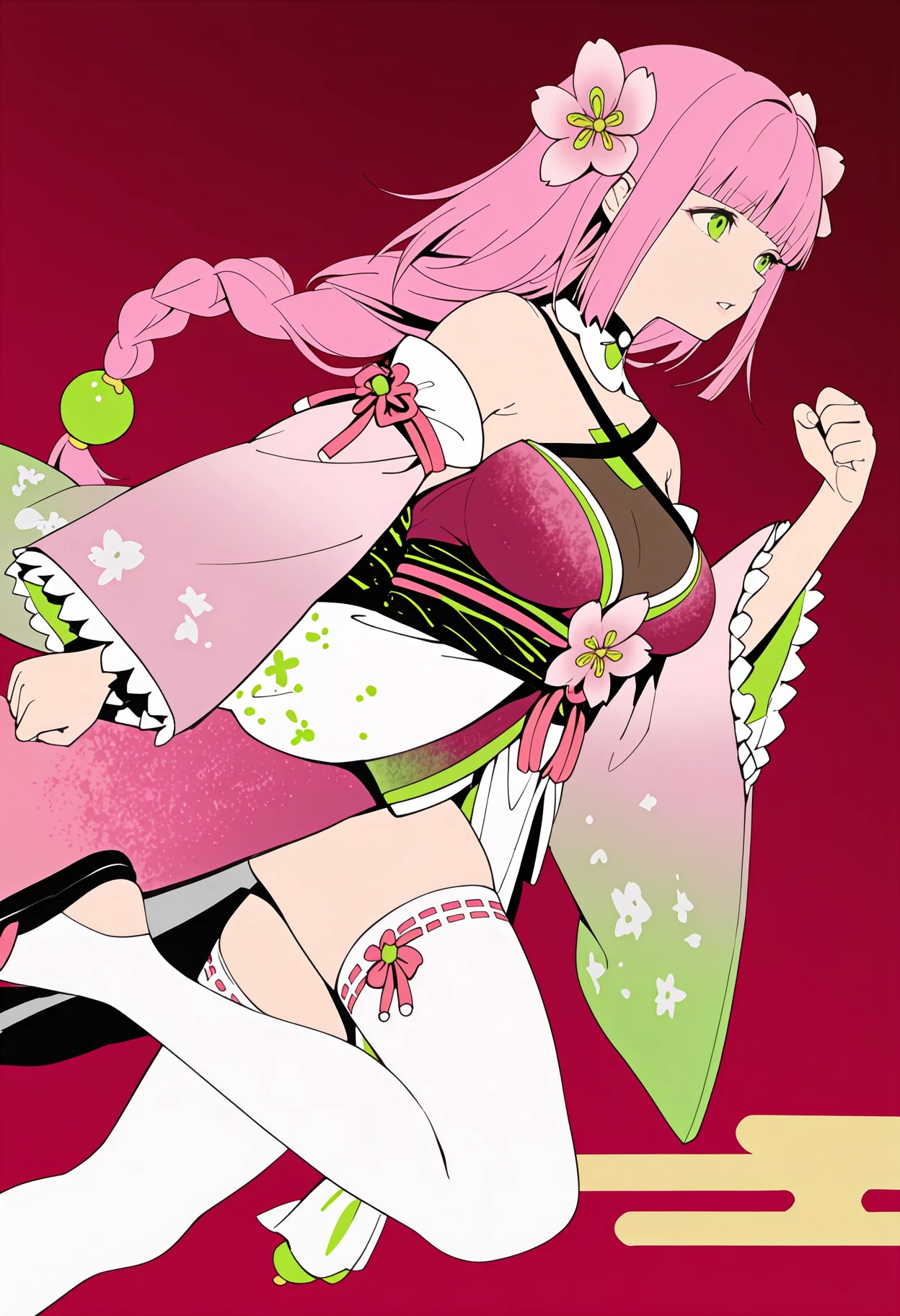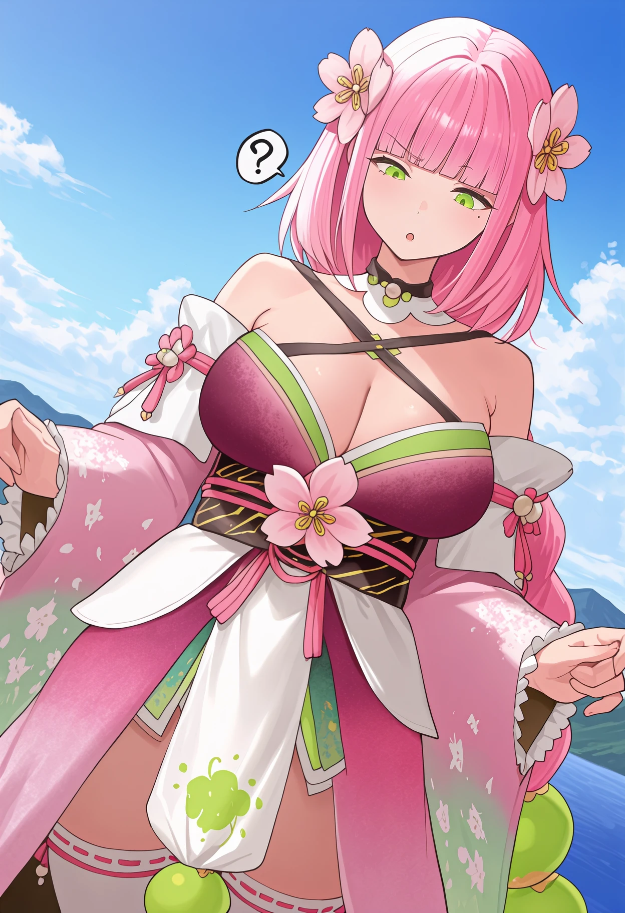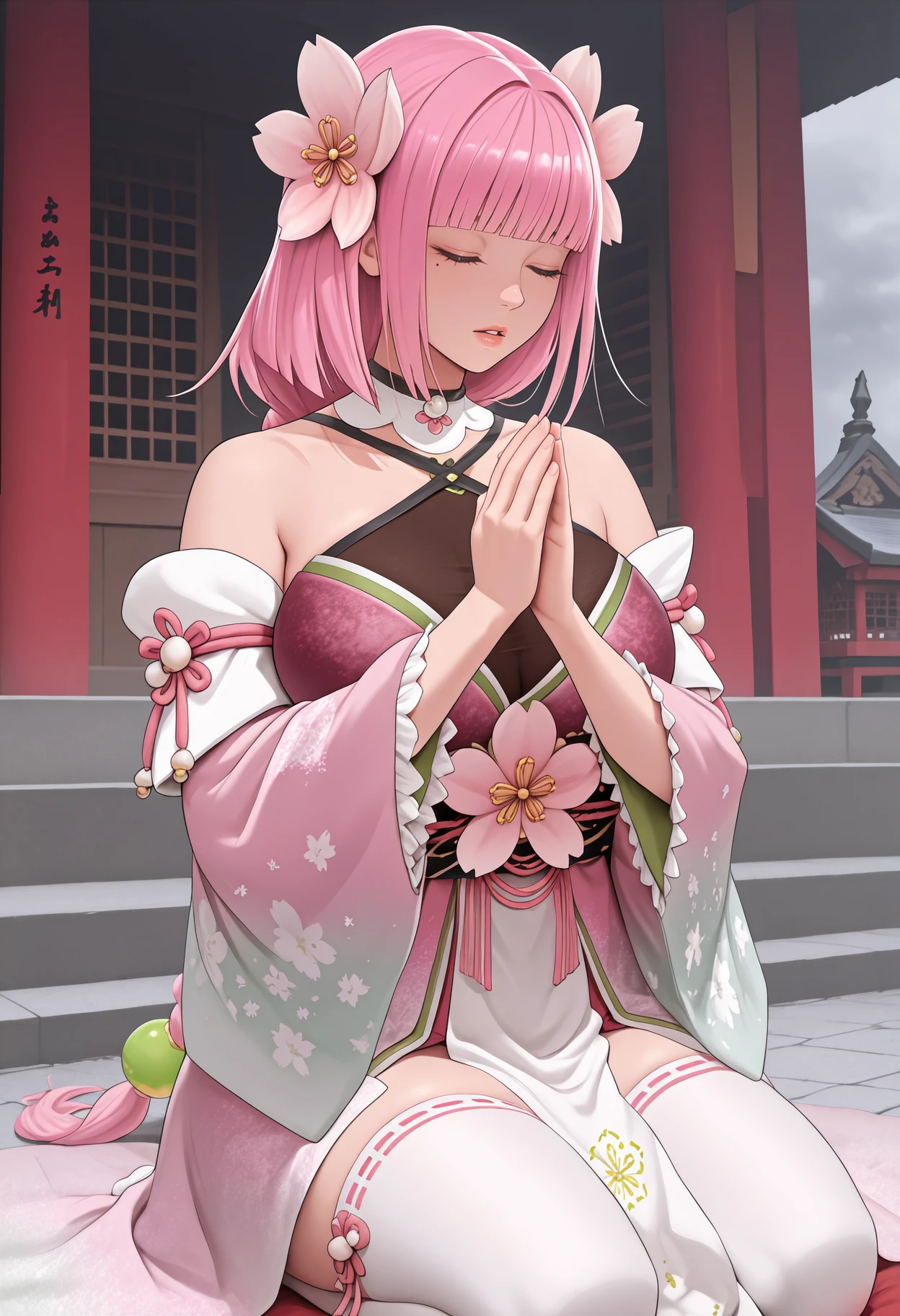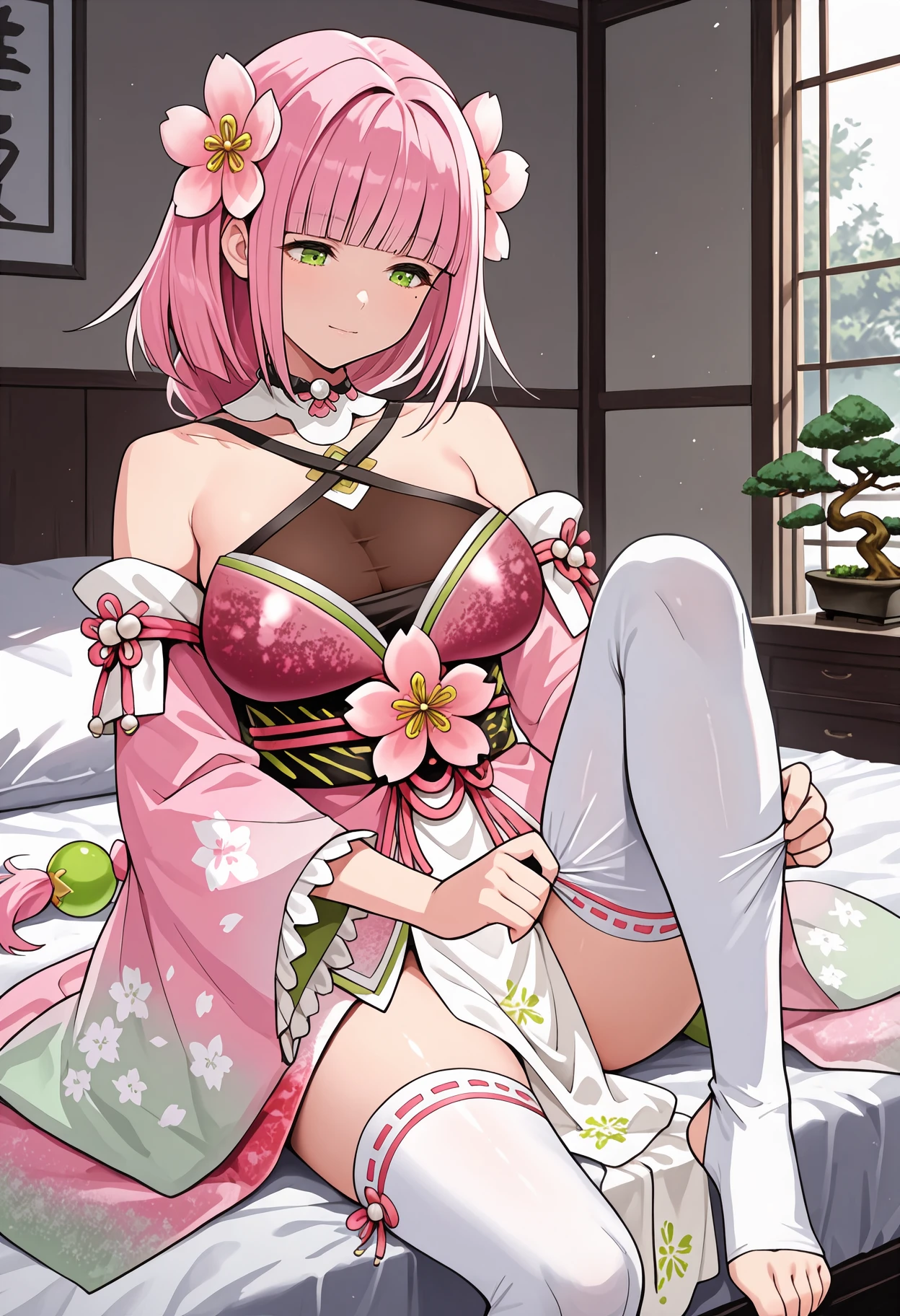 Default appearance: pink hair, hair flower, blunt bangs, braided ponytail, hair bead, green eyes, mole under eye, detached collar, pink kimono, multicolored kimono, criss-cross halter, see-through cleavage, ???? shoulders, detached sleeves, print sleeves, floral print, frilled sleeves, wide sleeves, obi, white pelvic curtain, white thighhighs, ribbon-trimmed thighhighs