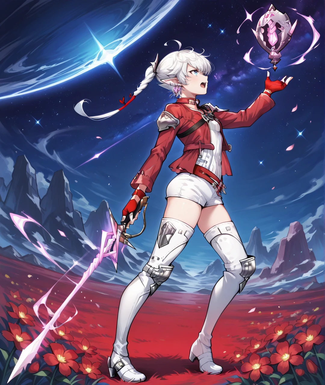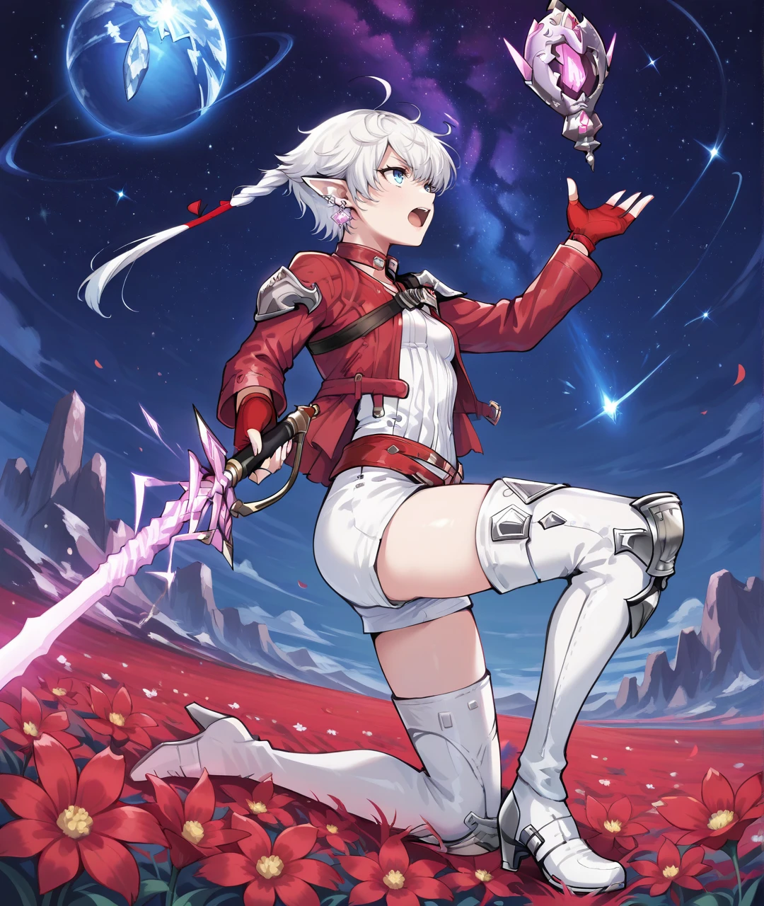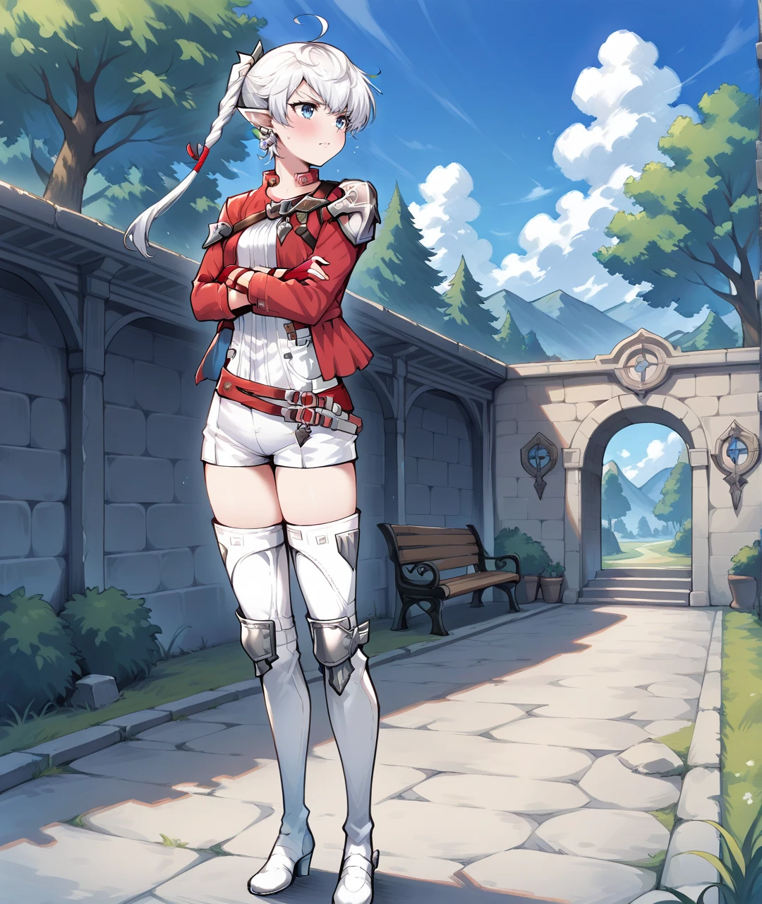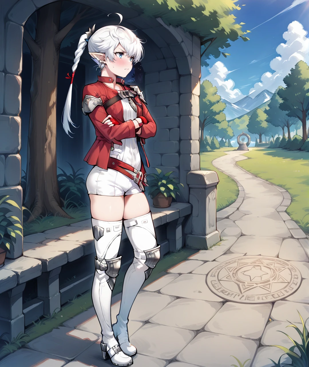 AlisaieBase, elezen, elf, pointy ears, silver earclip, one silver earring, silver earring on right ear, blue eyes, white hair, long hair, braided ponytail, ahoge, red hair ribbon, small breasts, shoulder armor, red cropped jacket, collared jacket, , long sleeves, white shirt, red fingerless gloves, red belts, multiple belts, white short shorts, white thigh boots, high heel boots,