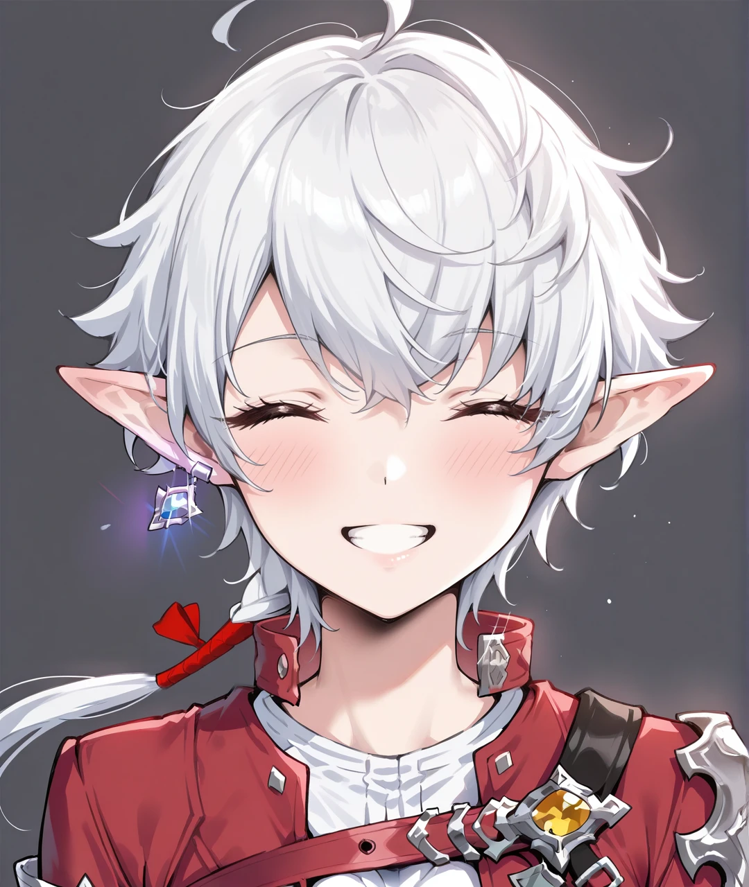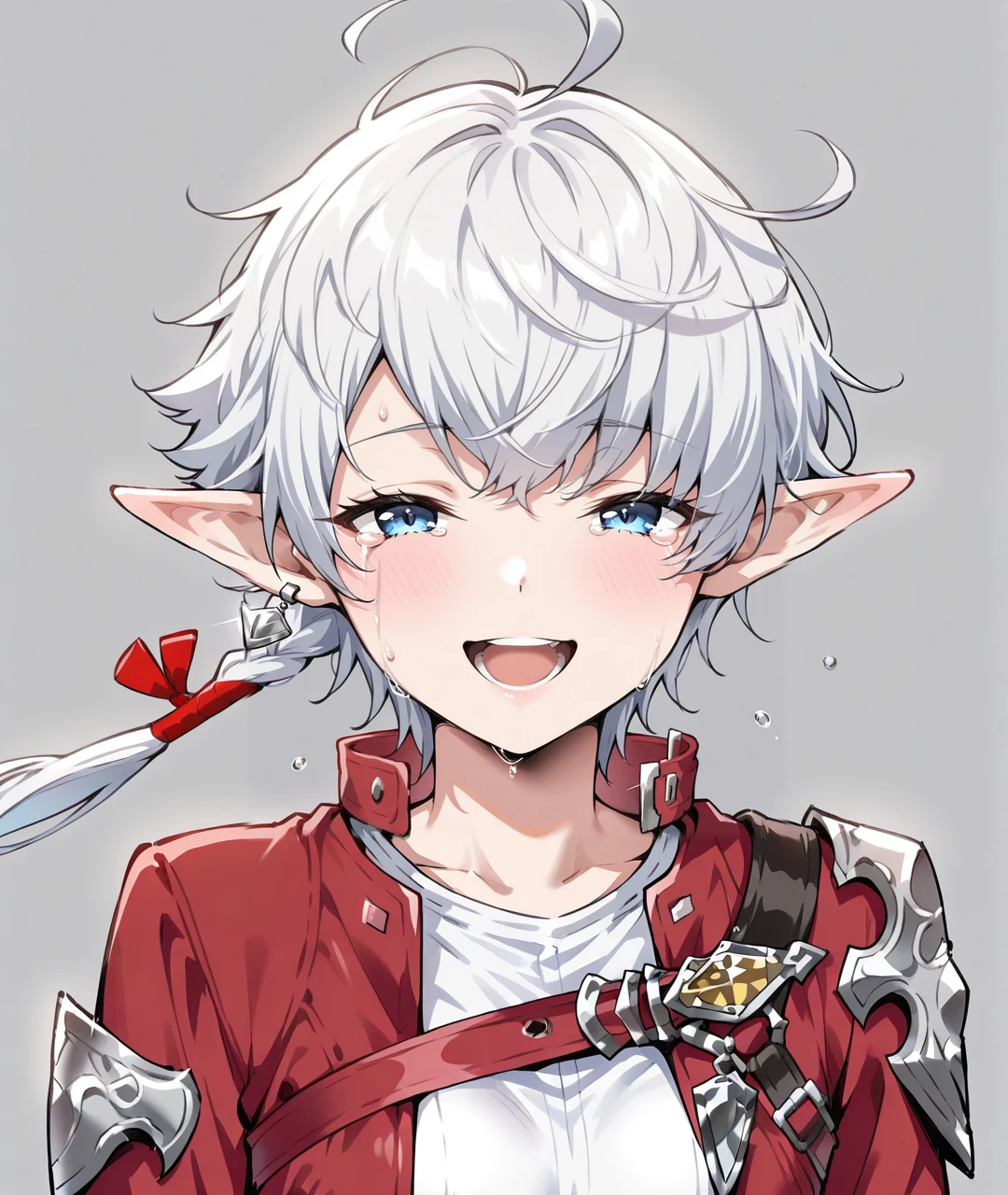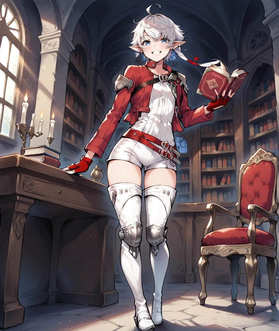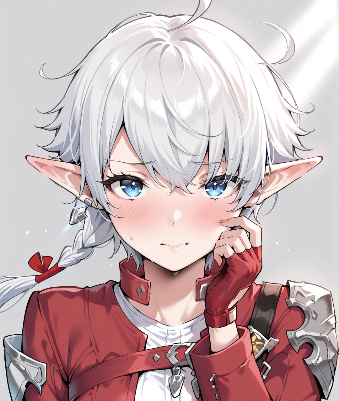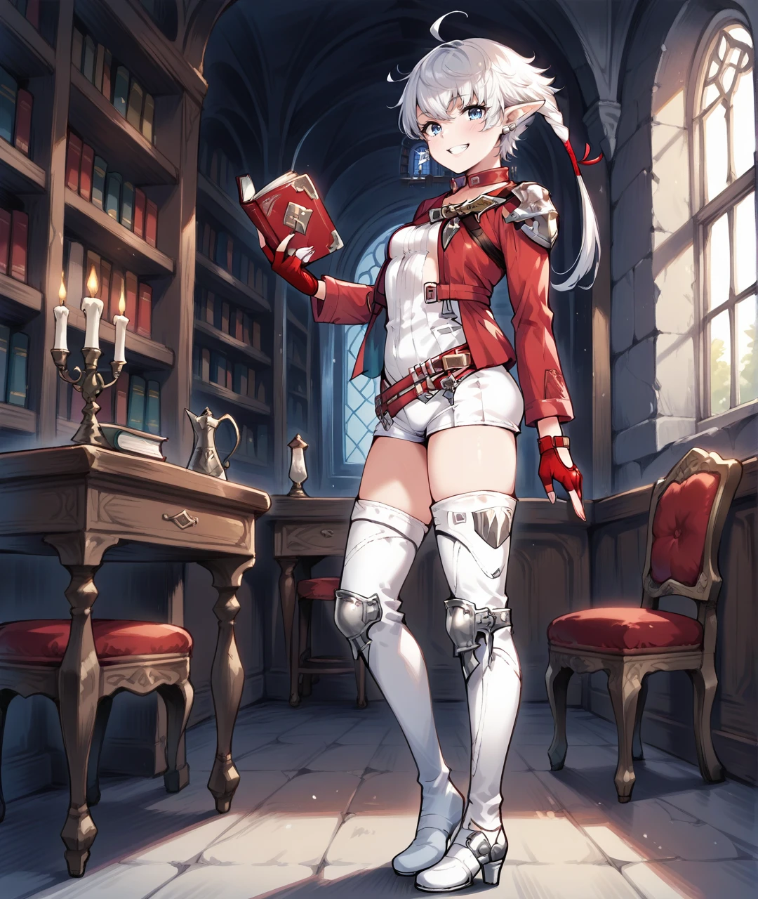 Tags: AlisaieBase, elezen, elf, pointy ears, silver earclip, one silver earring, silver earring on right ear, blue eyes, white hair, long hair, braided ponytail, ahoge, red hair ribbon, small breasts, shoulder armor, red cropped jacket, collared jacket, open jacket, long sleeves, white shirt, red fingerless gloves, red belts, multiple belts, white short shorts, white thigh boots, high heel boots,