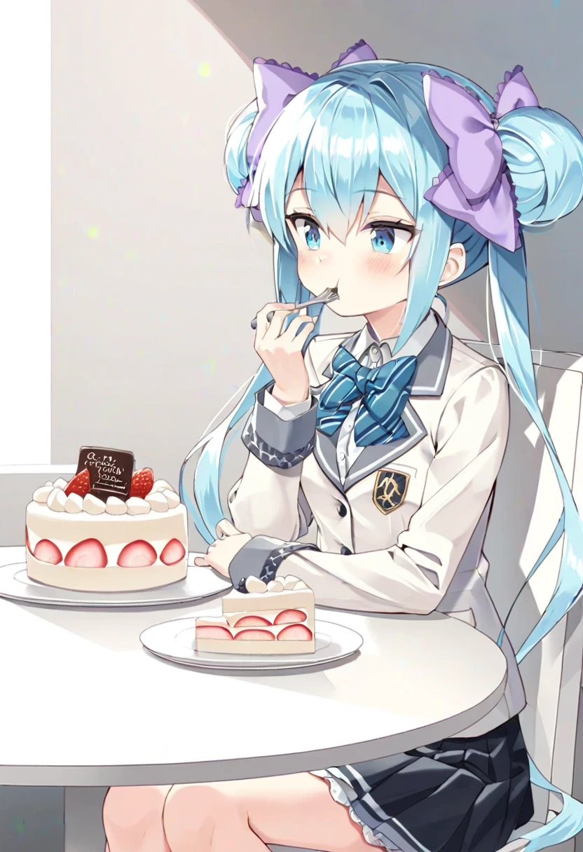 基础(Basic):suzushima arisu,double bun,blue eyes,blue hair, hair bow, hair bun, purple bow,very long hair