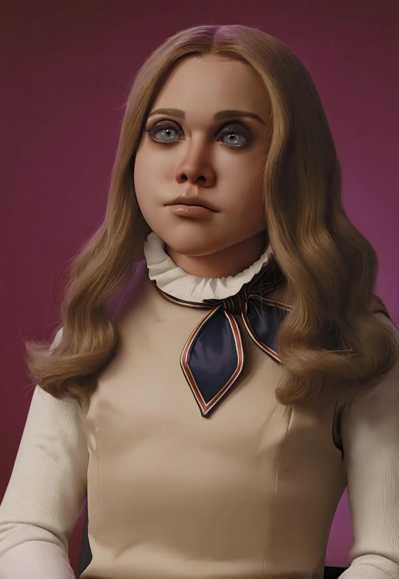 M3GAN, 1girl, solo, long blonde hair, android, doll joints, realistic, robot girl, gynoid, realistic doll, female android, grey eyes, smooth face, slender body, synthetic skin, glossy eyes