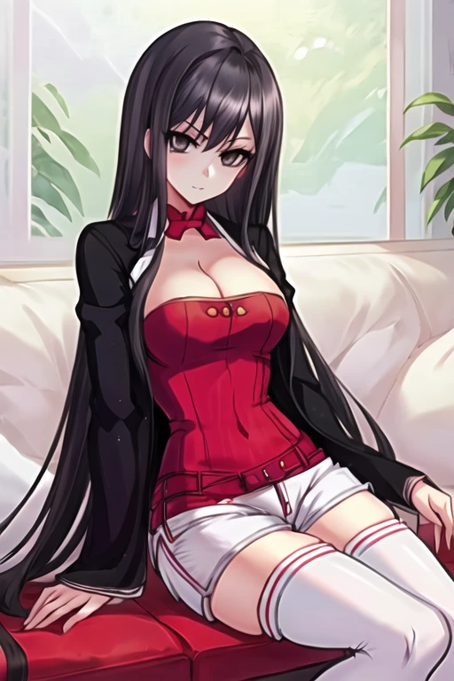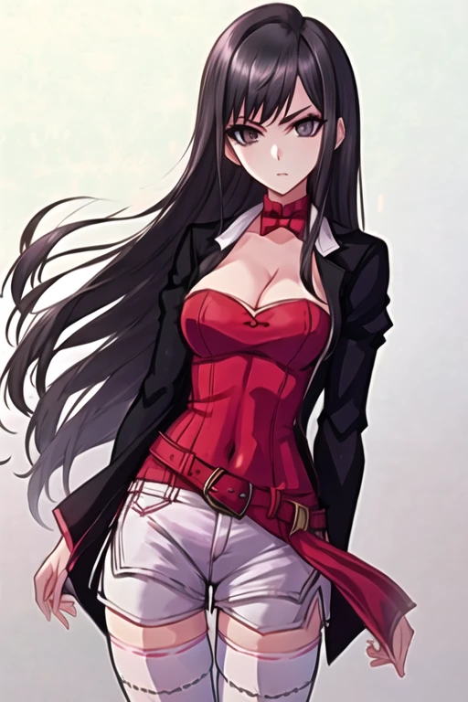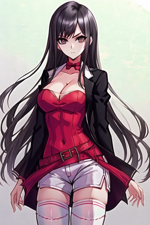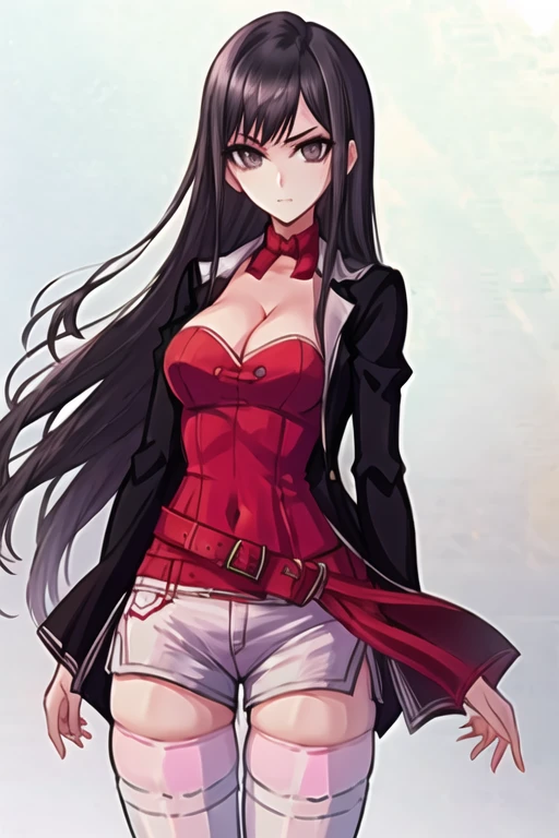 1girl,long hair,black hair, white shorts, thighhighs, neckline, cleavage