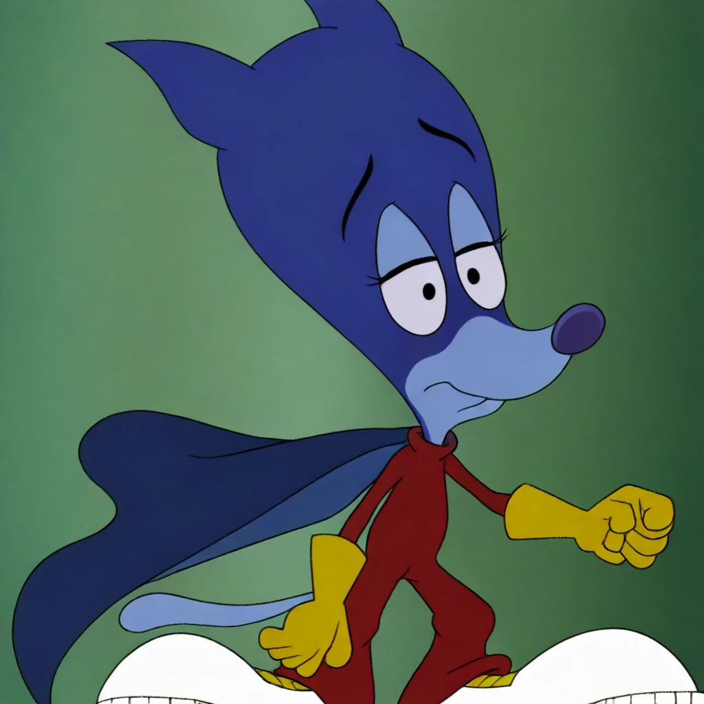 Roberta Illus, solo, 1girl, Anthropomorphic dog, Blue fur, black Eyes, dark Blue nose, Blue tail, red Mask, red , yellow gloves, Blue cape, white shoes, giant feet