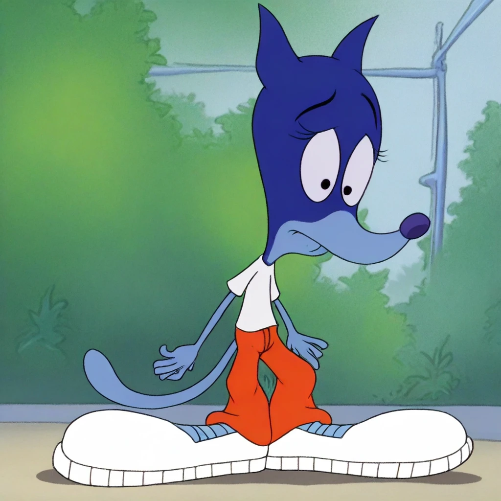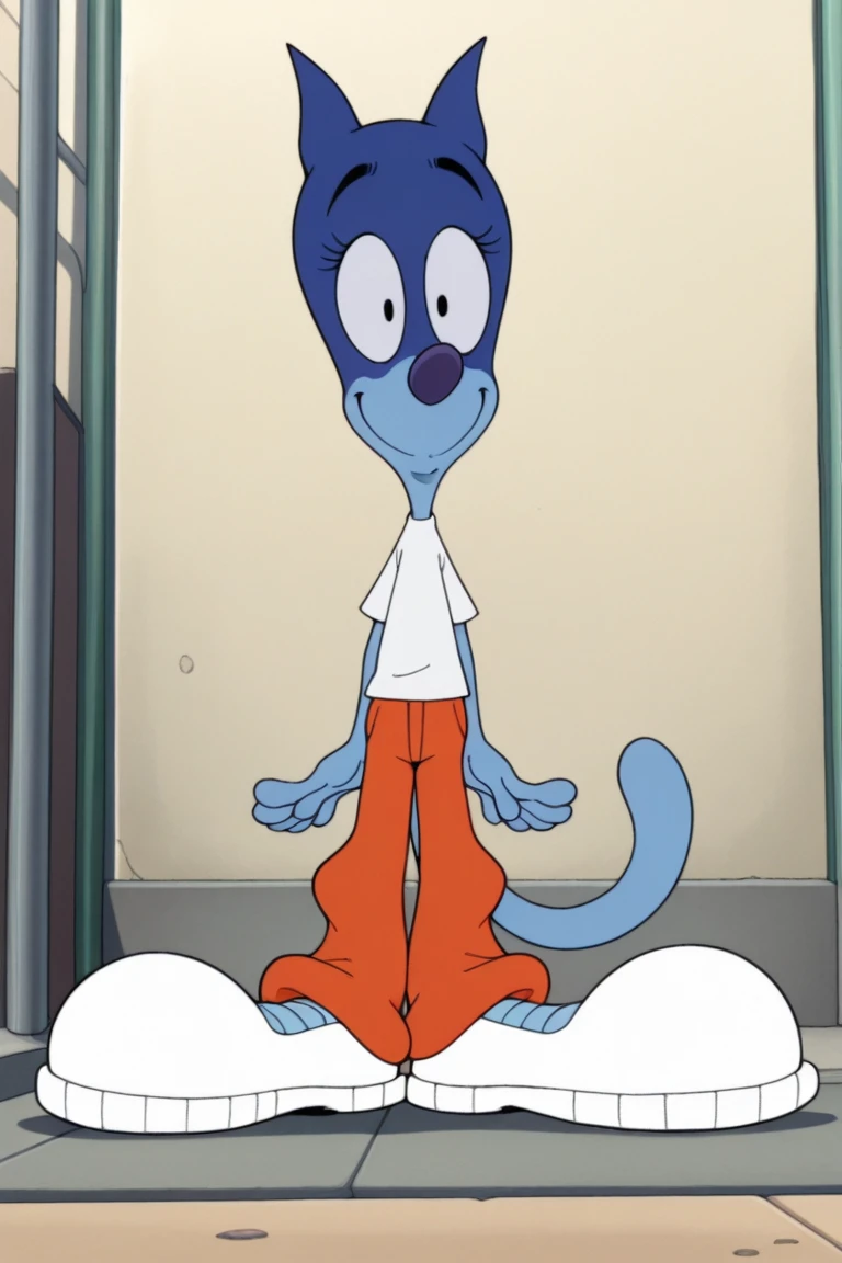 Prompt: Roberta Illus, solo, 1girl, Anthropomorphic dog, Blue fur, black Eyes, dark Blue nose, Blue tail, white shirt, Orange pants, white shoes, giant feet