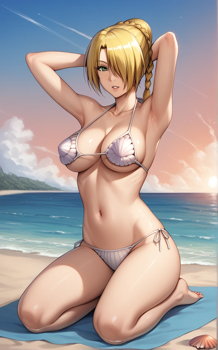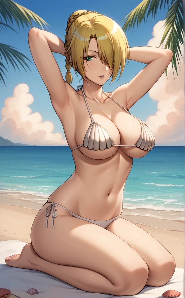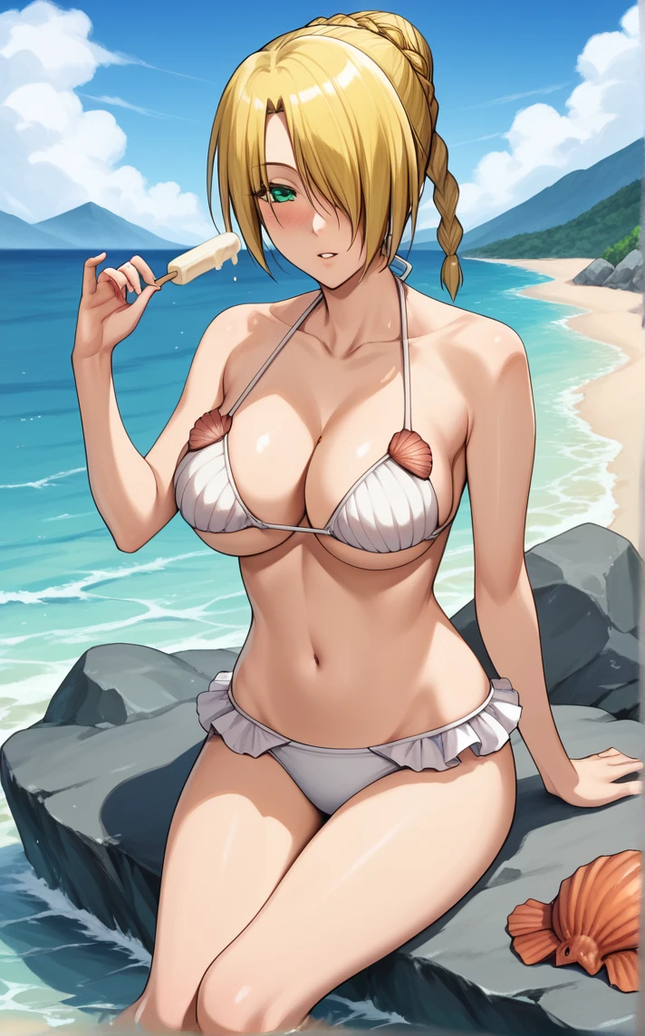 ShellBikini_Hilda_Beelzebub_ownwaifu, 1girl, blonde hair, green eyes, hair over one eye, single braid, swimsuit, cleavage, collarbone, large breasts, navel, shell bikini, short hair, white bikini, bare shoulders, halterneck, seashell, underboob,