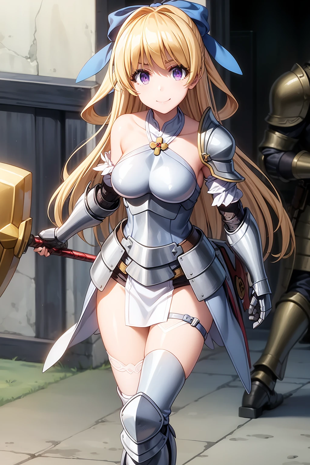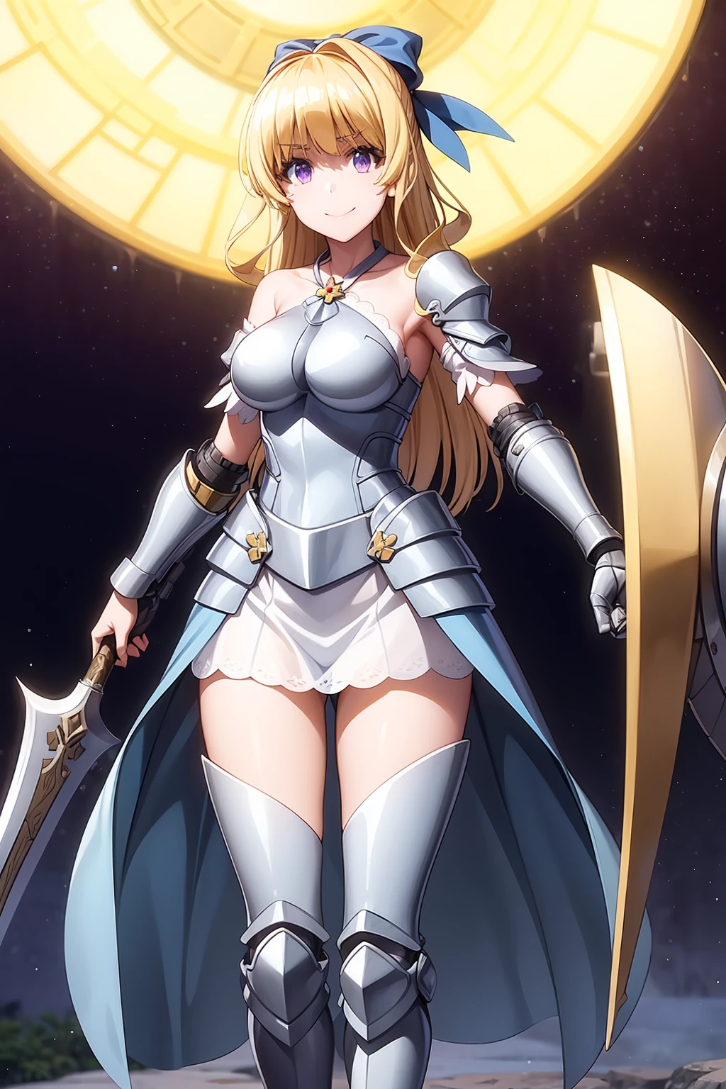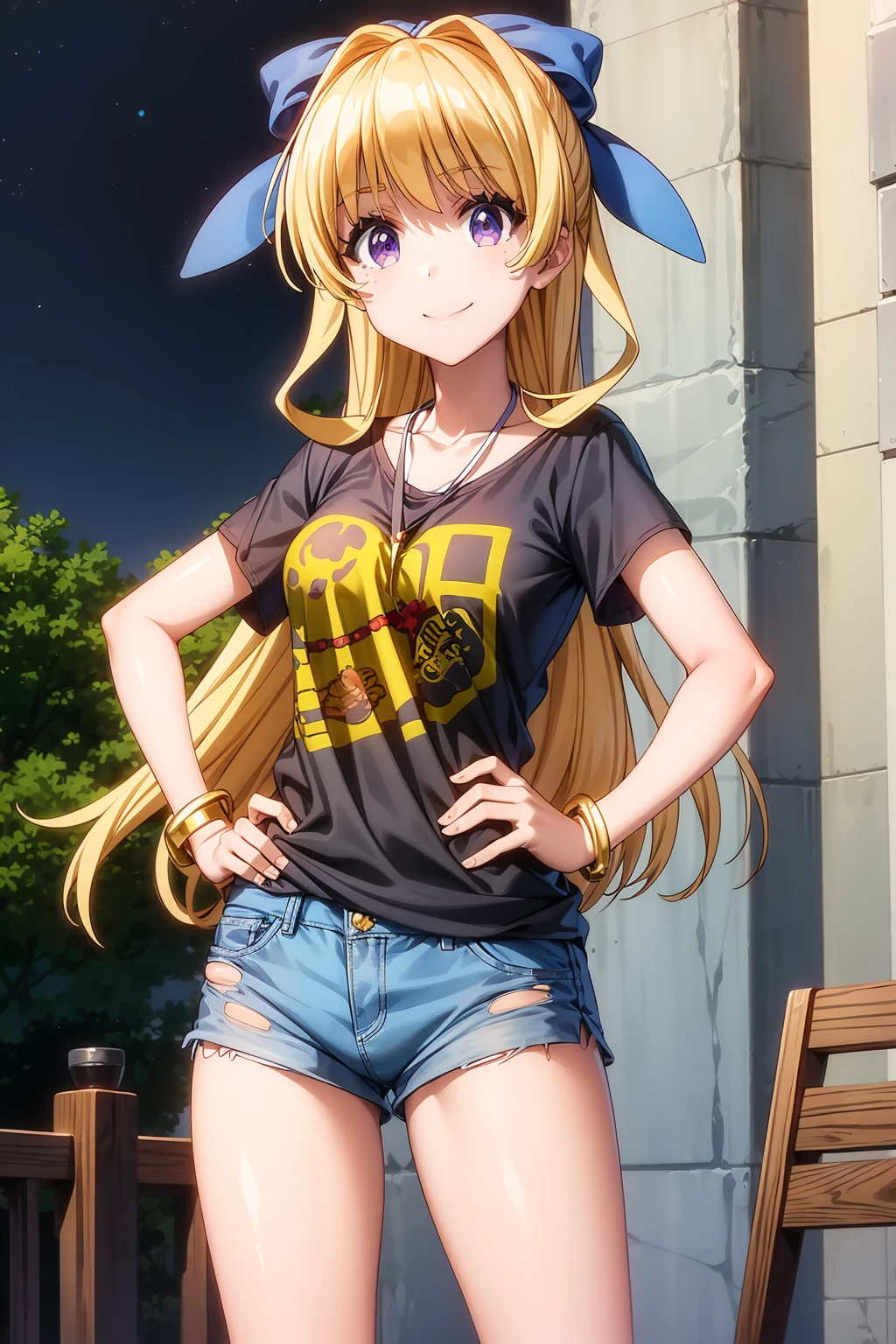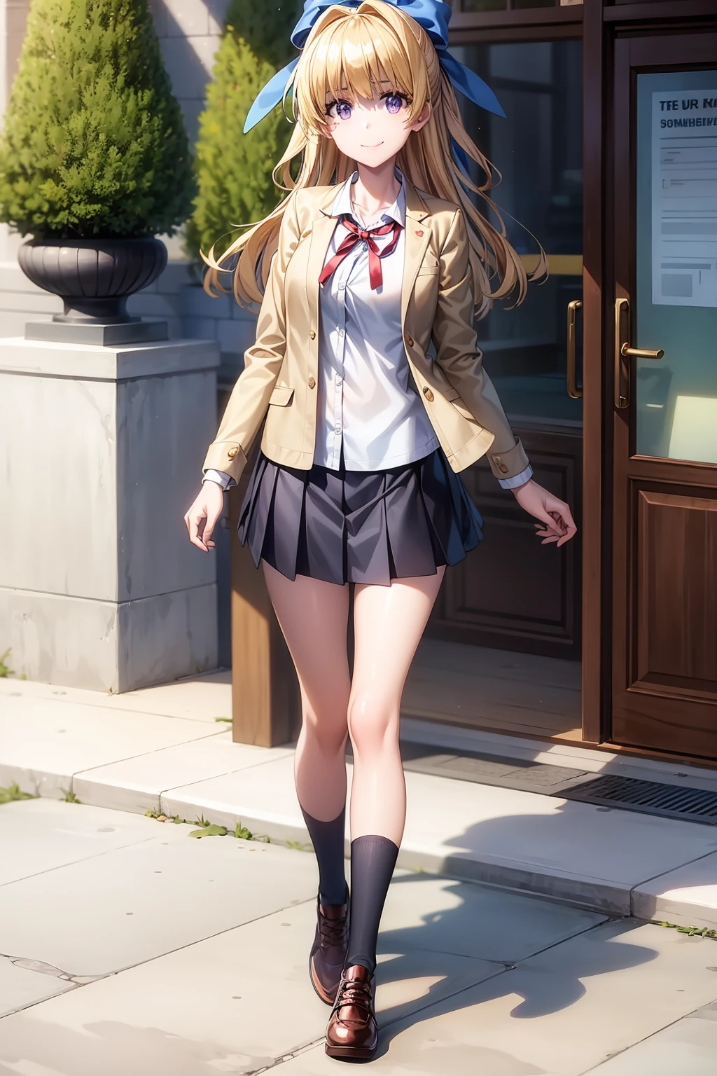 long hair, blonde hair, purple eyes, hair bow, blue bow