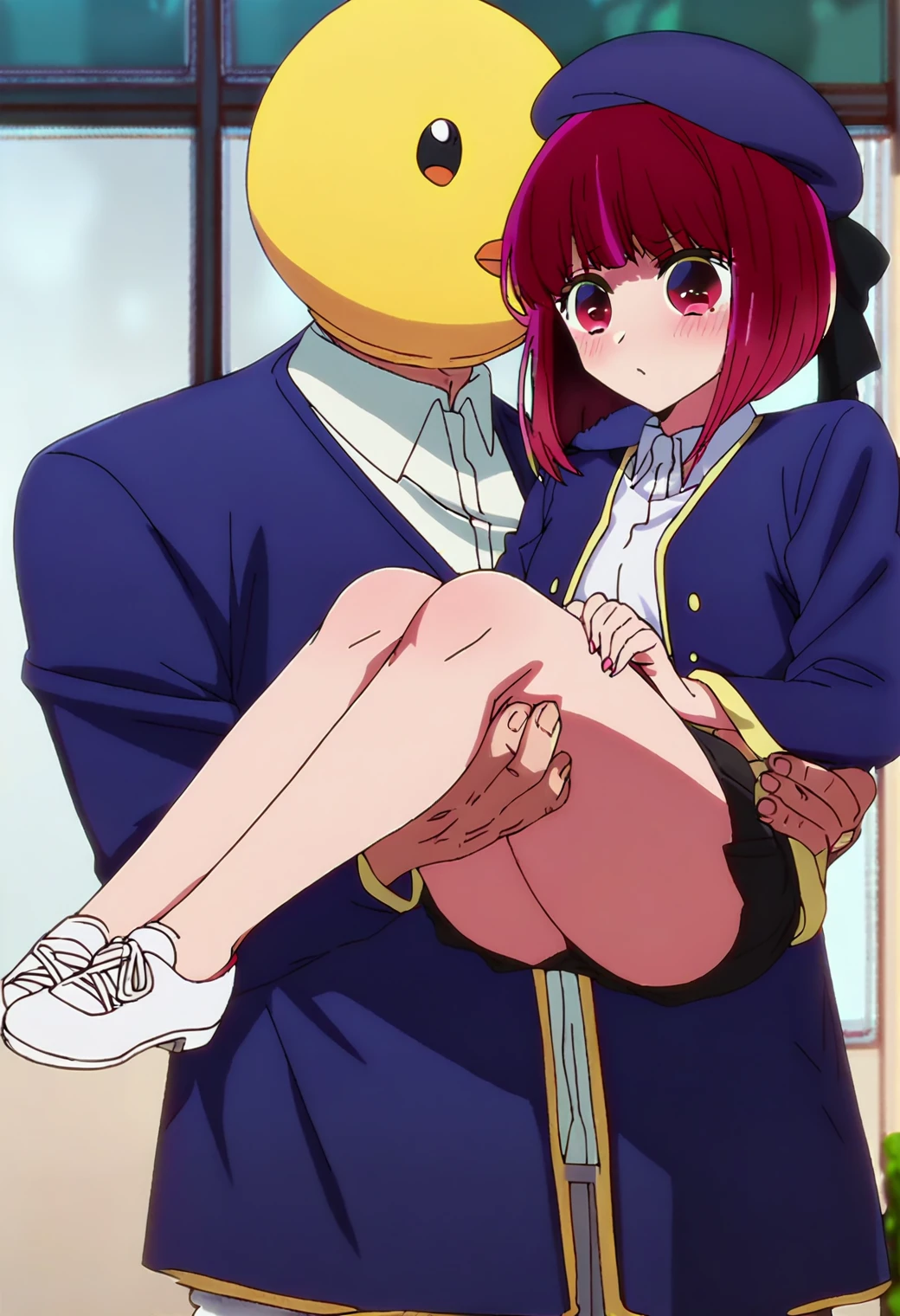 arimakana, school uniform, blue jacket, black vest, white collared shirt, blue hat, beret, grey skirt, pink bowtie