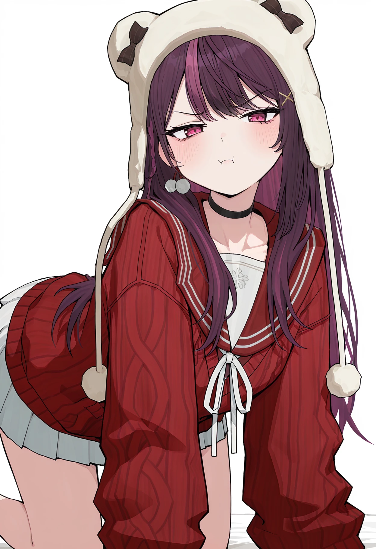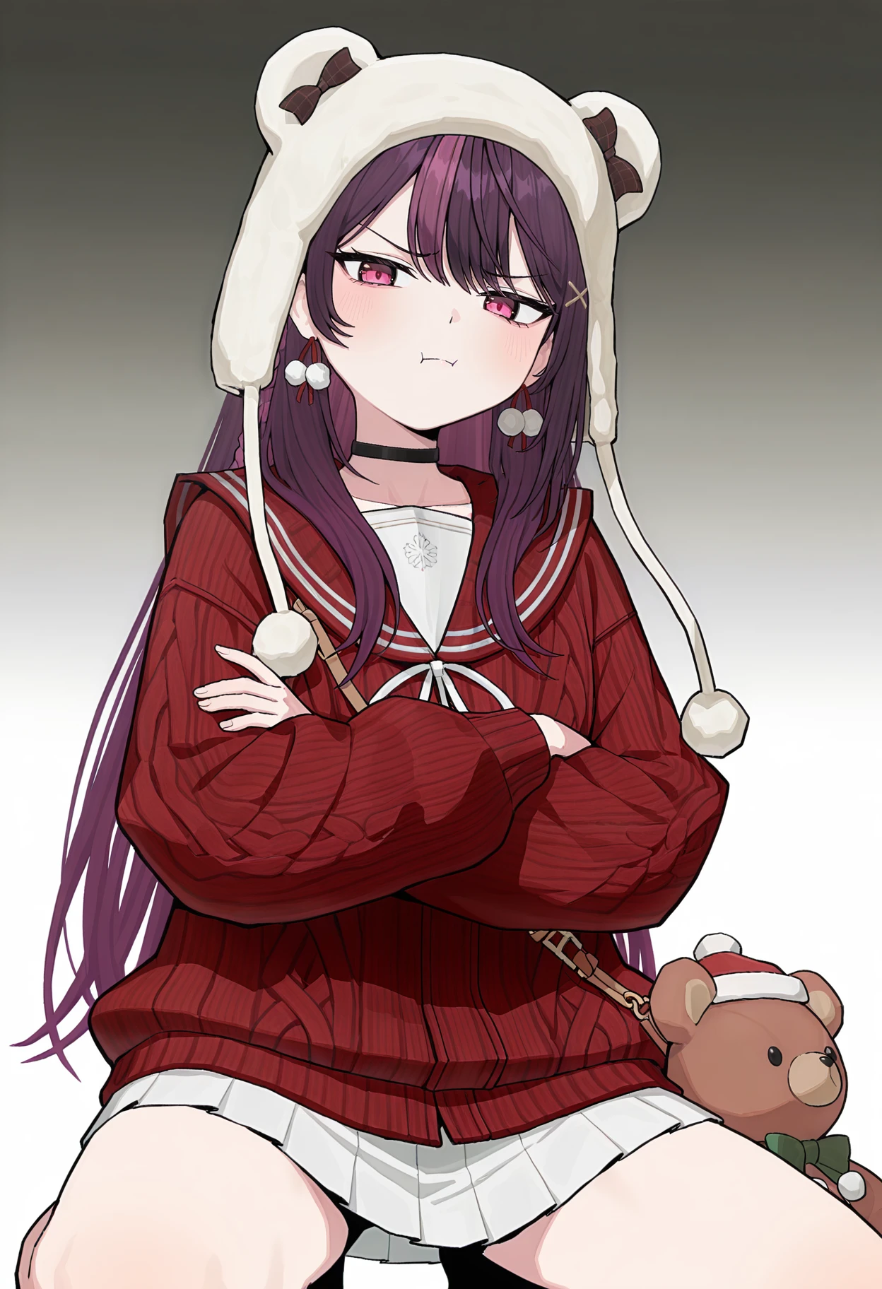 BRURU, animal ear headwear, earflap beanie, dark purple hair, purple streaked hair, long hair, sidelocks, double-parted bangs, x hair ornament, side braid, pink eyes, pom pom earrings, single earring, black choker, sailor collar, red sweater, long sleeves, white neck ribbon, crossbody bag, animal bag, teddy bear, stuffed animal, white skirt, miniskirt, kneehighs, knee boots, brown footwear