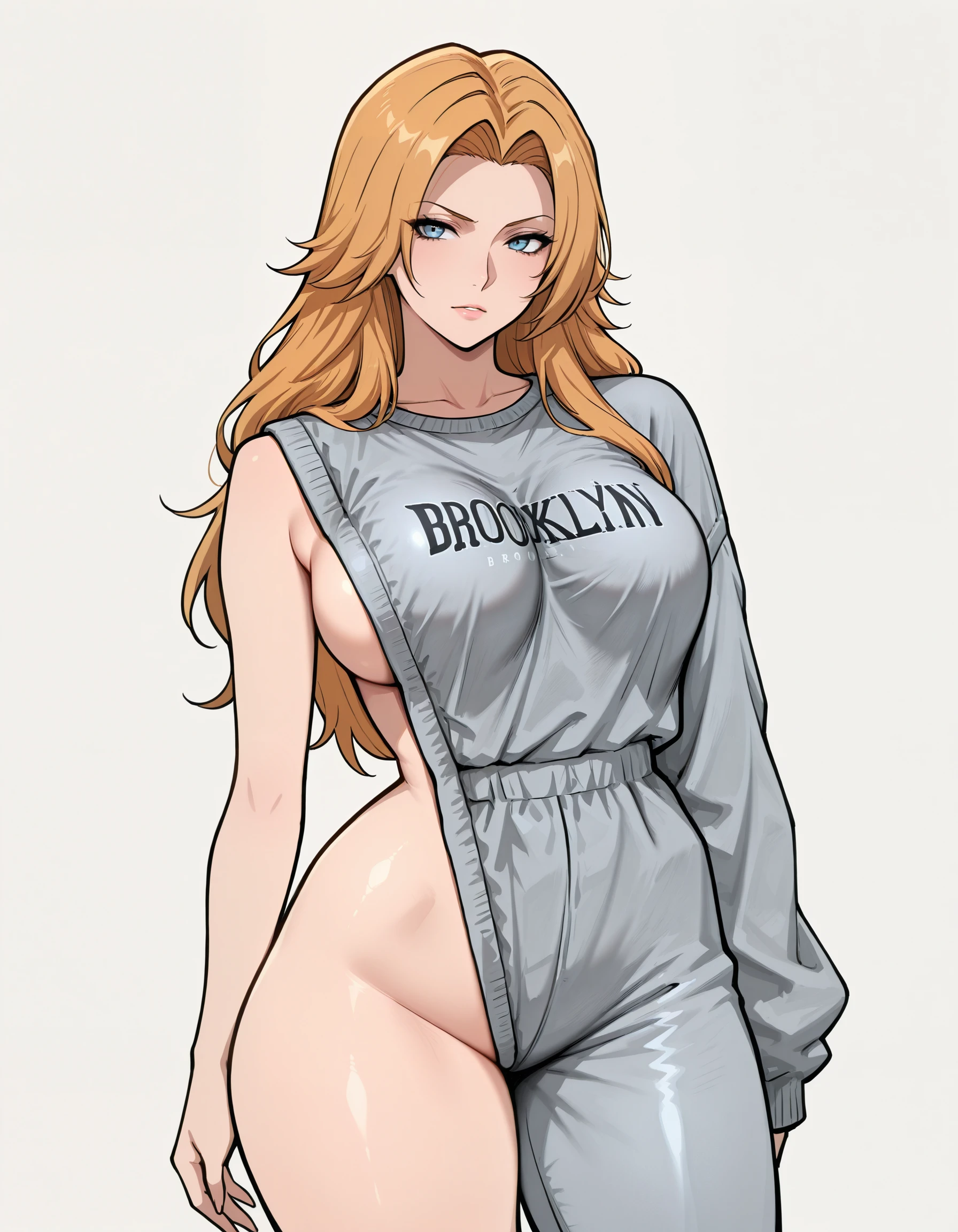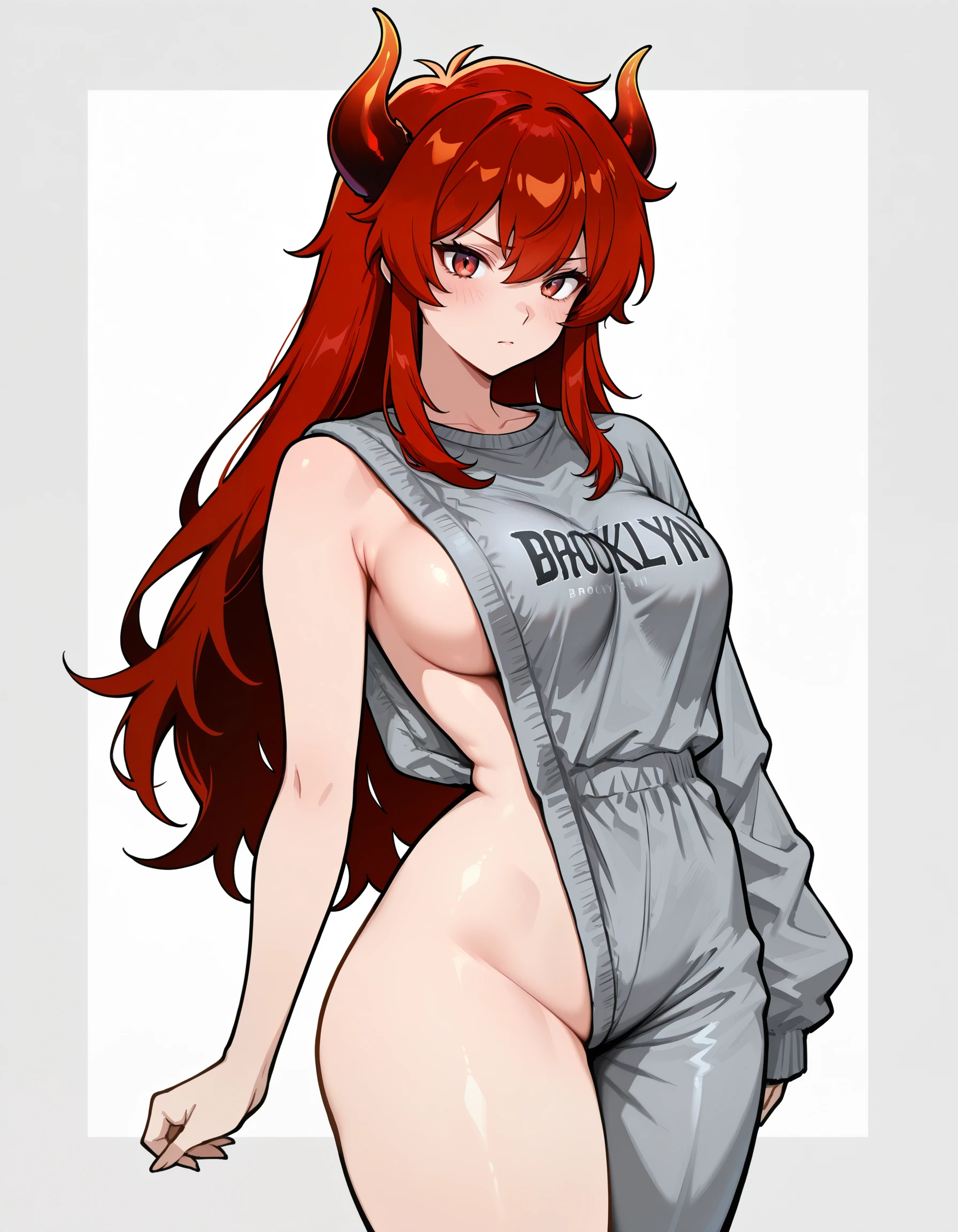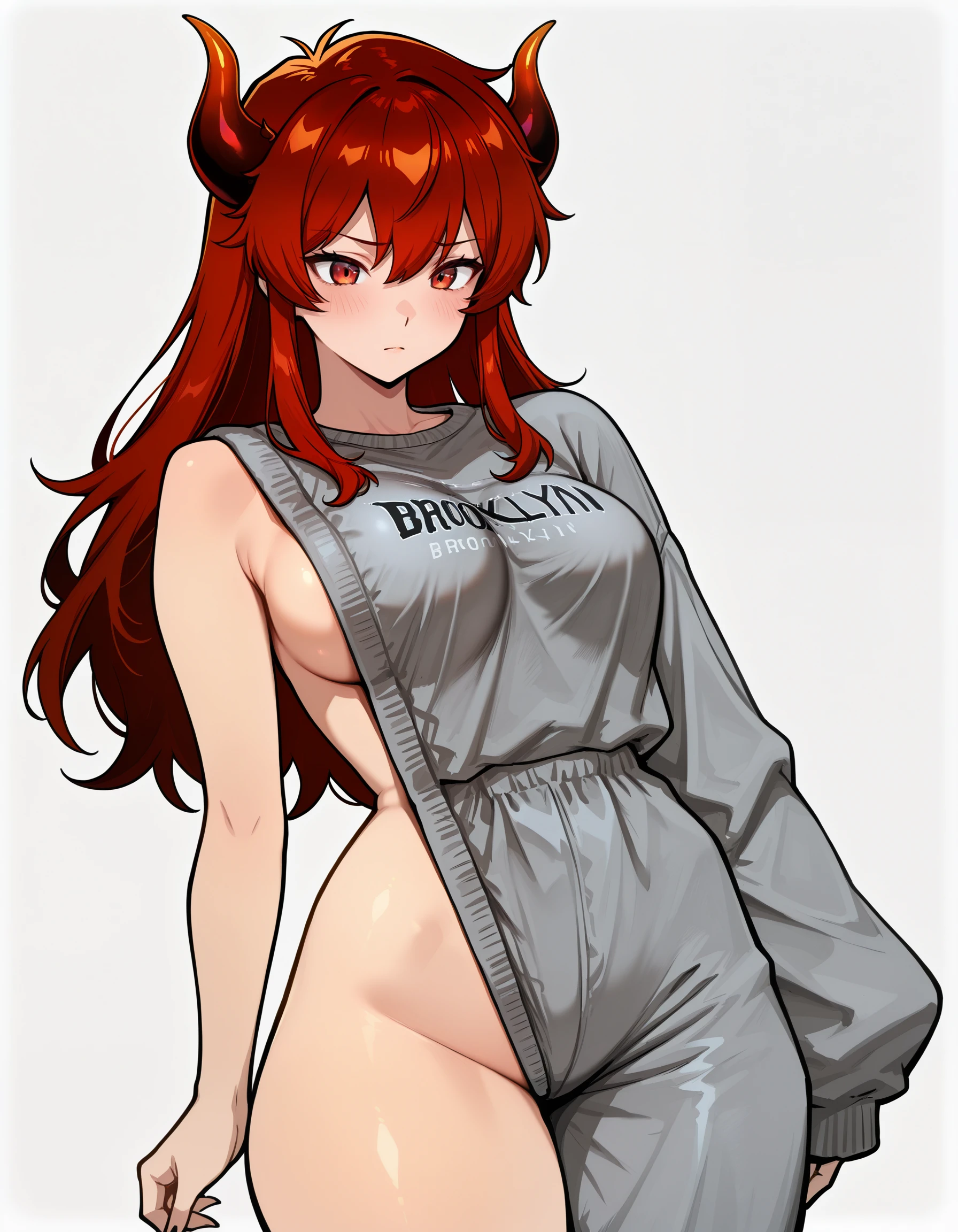 sweatshirt , single pantsleg, sleeveless sweater, asymmetrical clothes, single sleeve, defective brooklyn sweater, meme attire, long sleeves, baggy clothes, single bare shoulder, clothes writing, grey