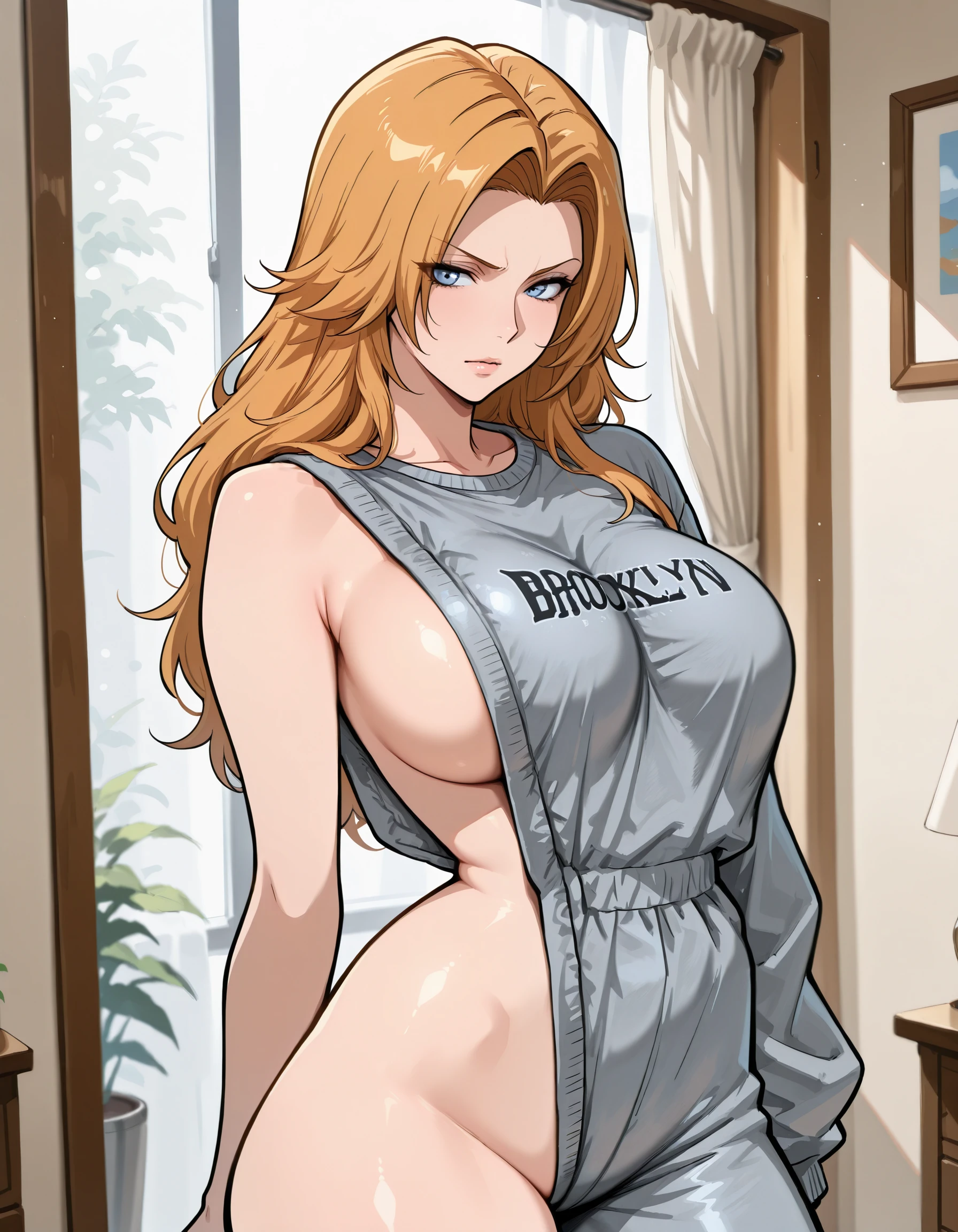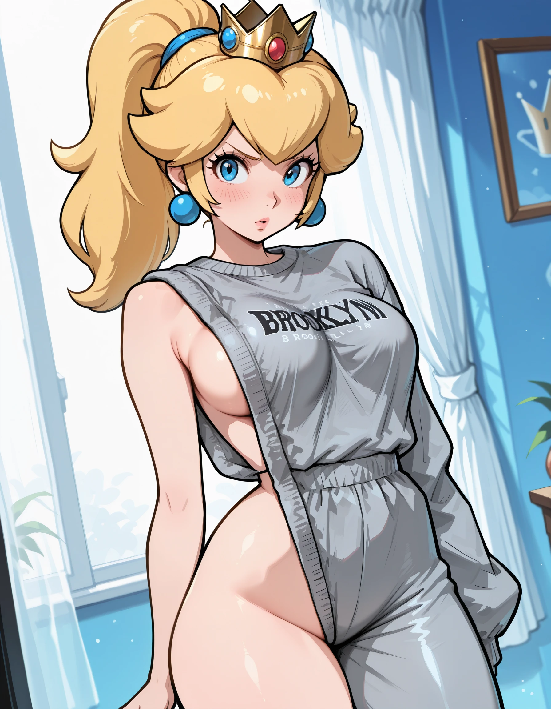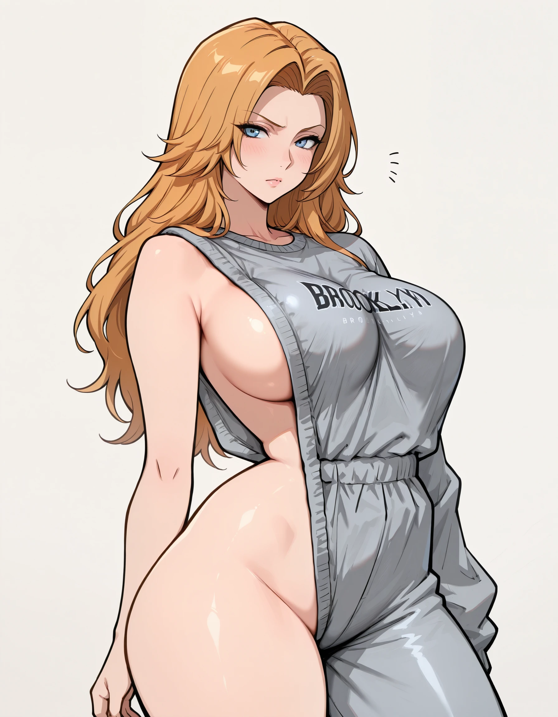 sweatshirt , single pantsleg, sleeveless sweater, asymmetrical clothes, single sleeve, defective brooklyn sweater, meme attire, long sleeves, baggy clothes, single bare shoulder, clothes writing, grey
