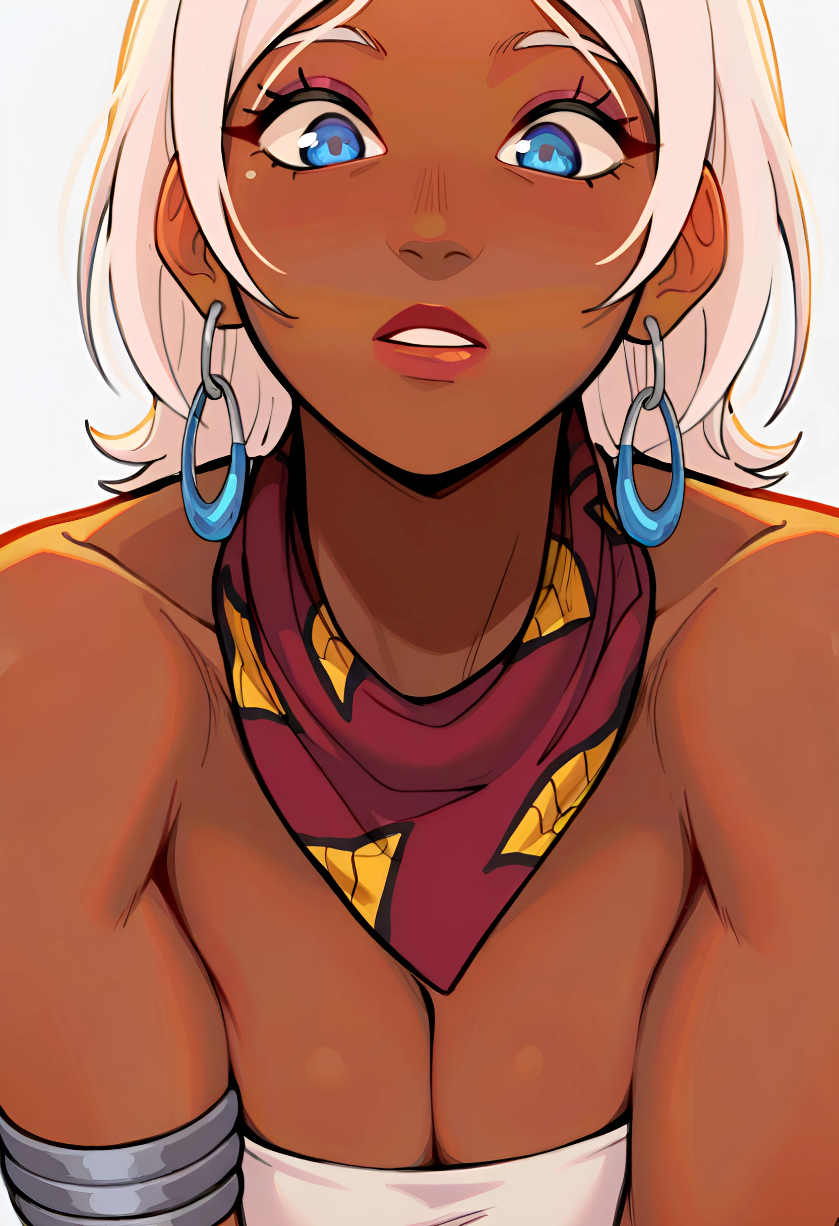 el3na, 1girl, solo, neck bandana, earrings, dark-skinned female, bracelets, blue eyes, strapless, bandeau, tube top, huge breasts, breasts covered, armlet, bracelets,