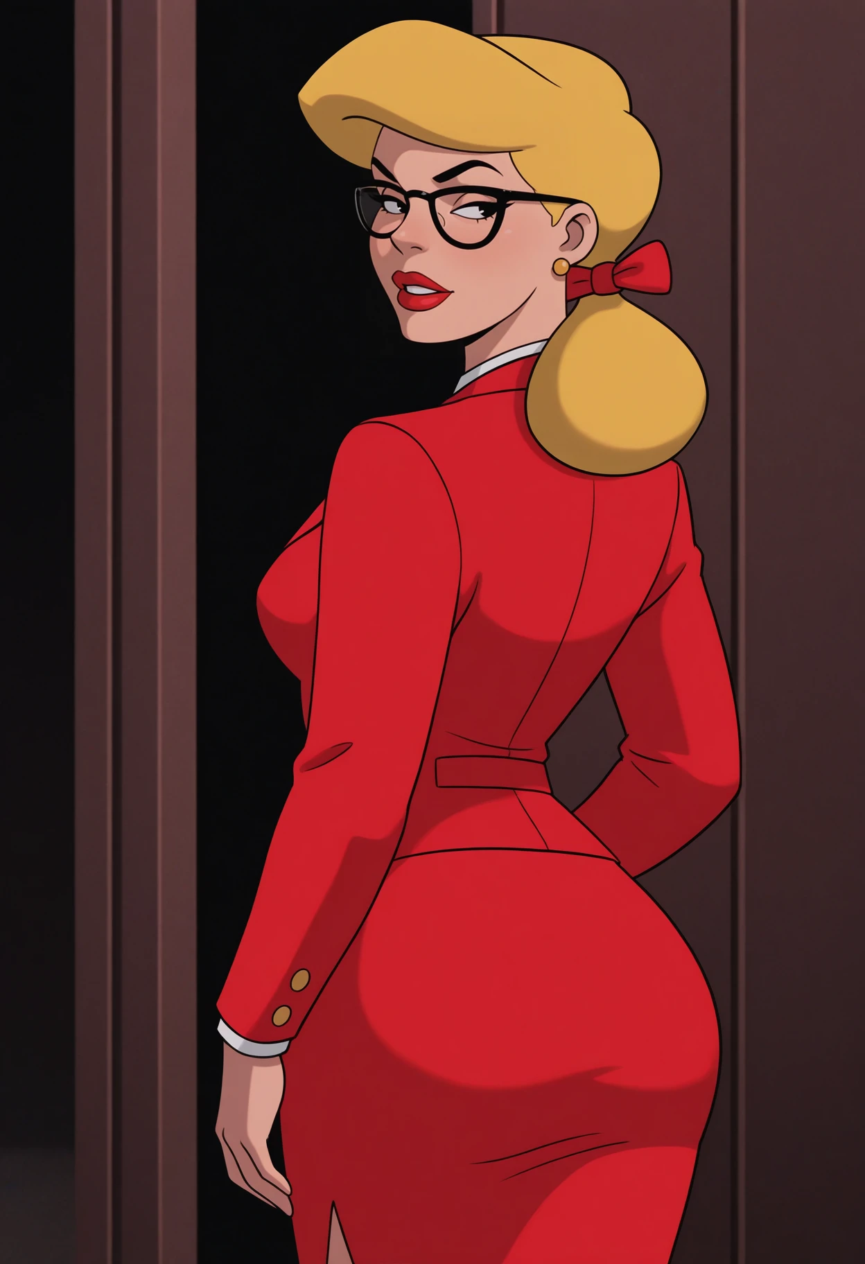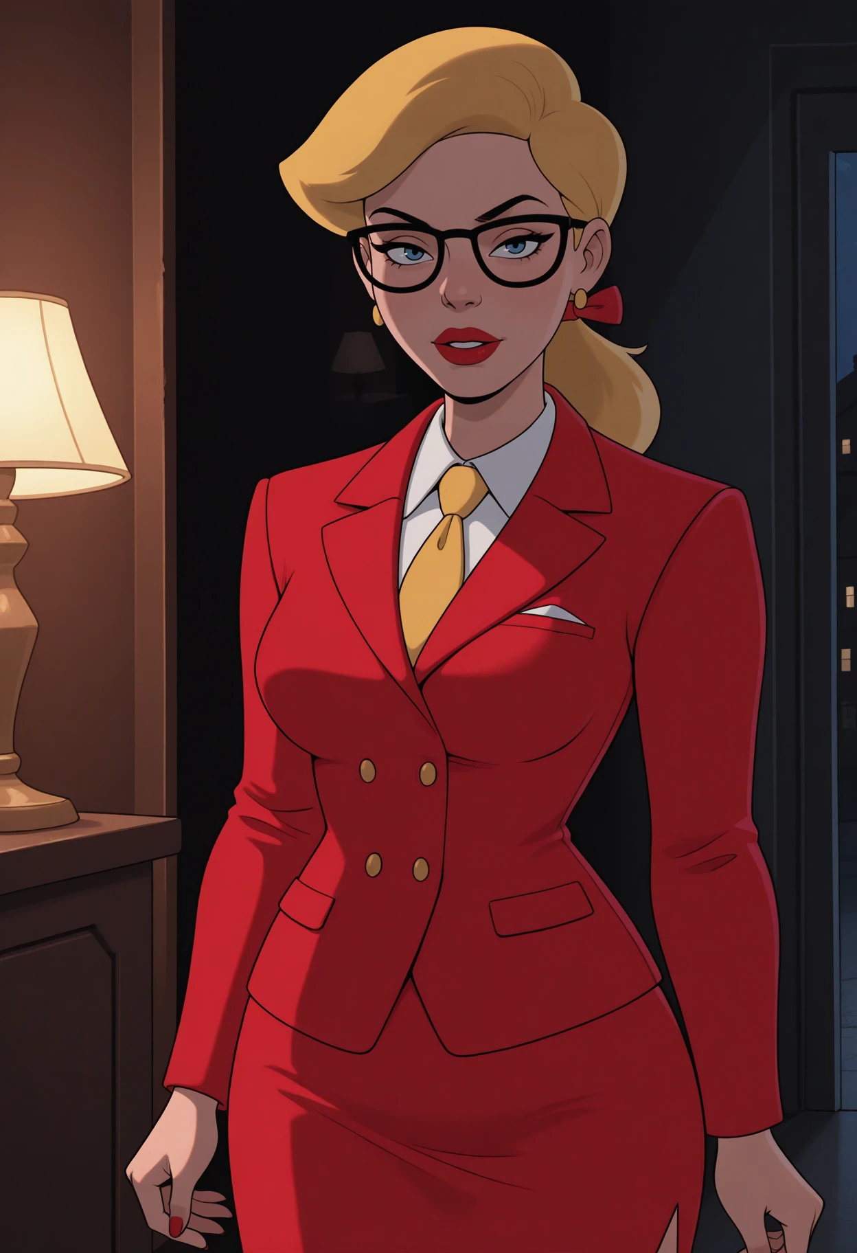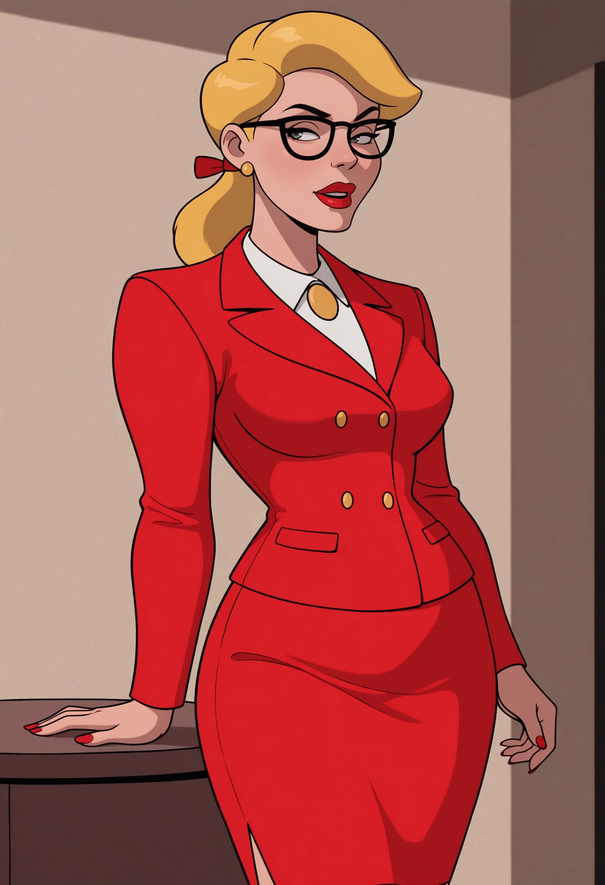 main outfit: glasses, black-framed eyewear, ribbon, necktie, jewelry, earrings, formal, skirt suit, jacket, red jacket, buttons, shirt, collared shirt, white shirt, skirt, red skirt,