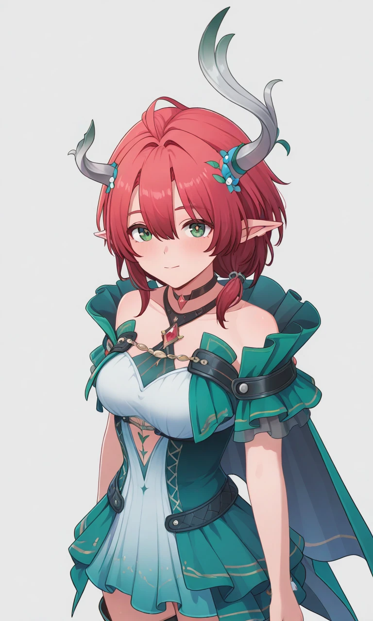Ciaccona, horns, pointy ears, red hair, thigh boots, dress, thighhighs, boots, green eyes, high heels, jewelry, hair between eyes, choker, hair ornament, cape, short hair, medium breasts, short dress, black footwear, flower, bare shoulders, green dress,