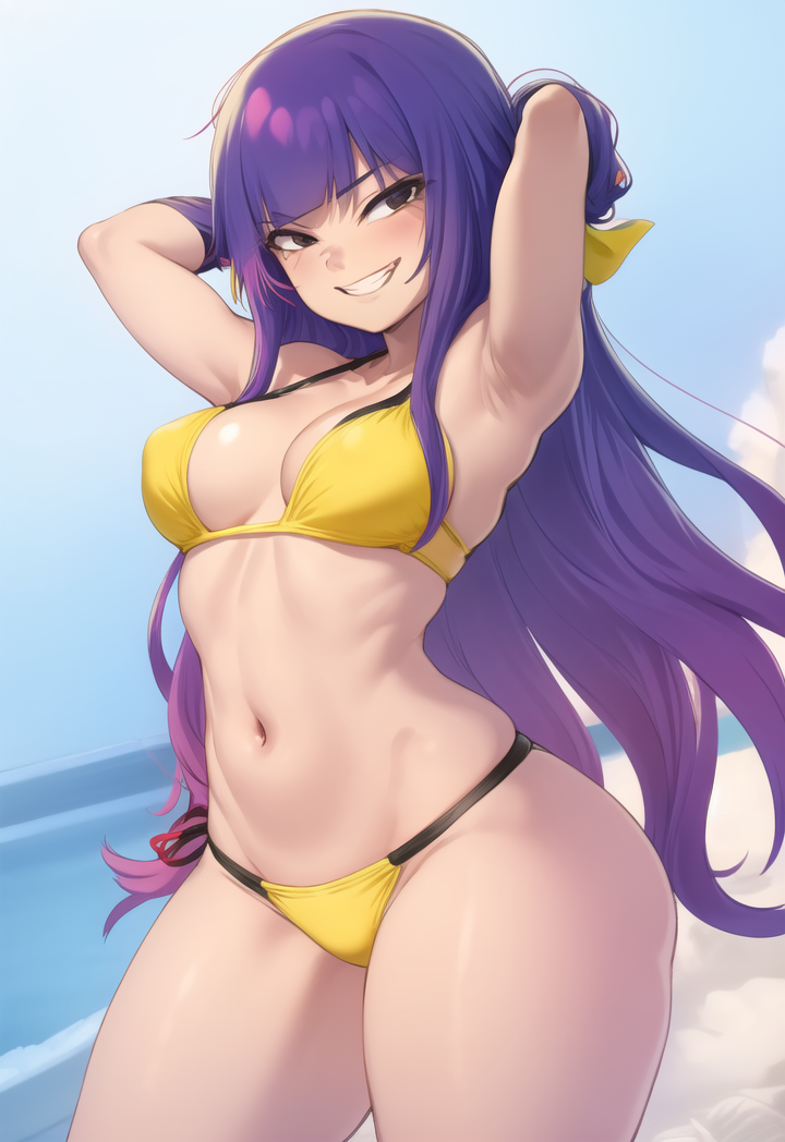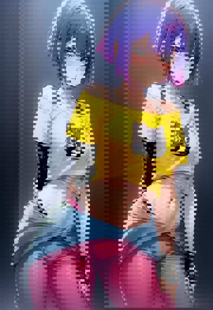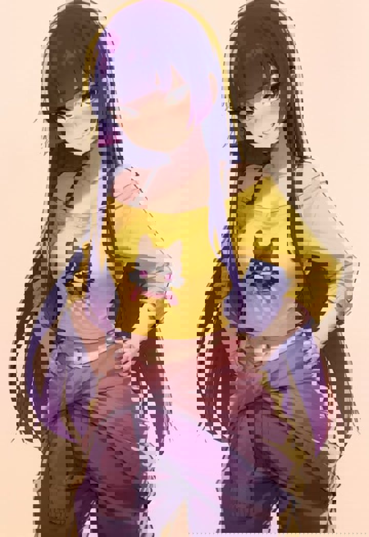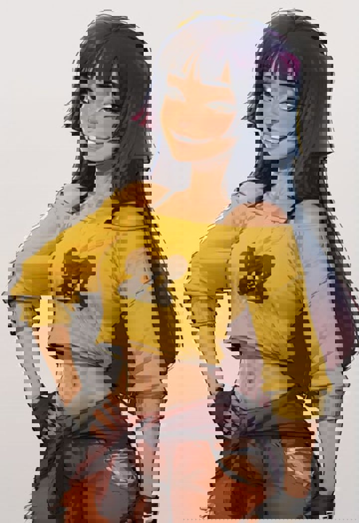 Using these tags helps generate her clothes: yellow shirt, off shoulder, navel, pants, sweater around waist, fingerless gloves