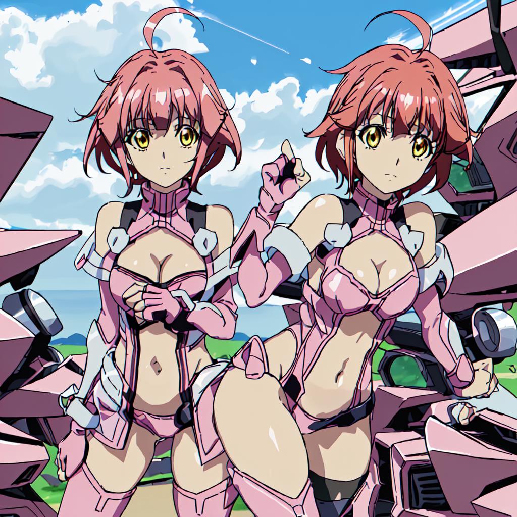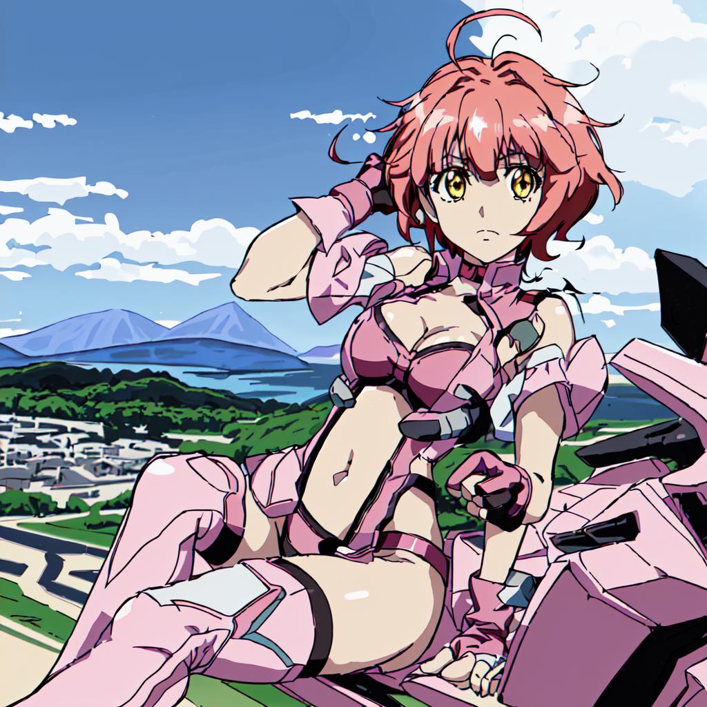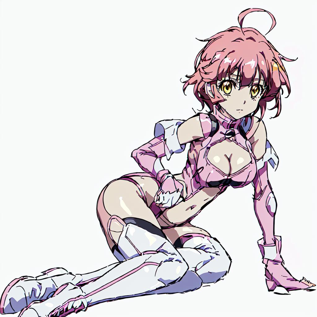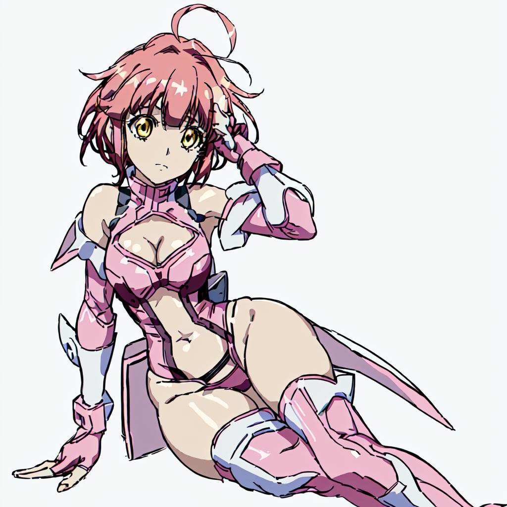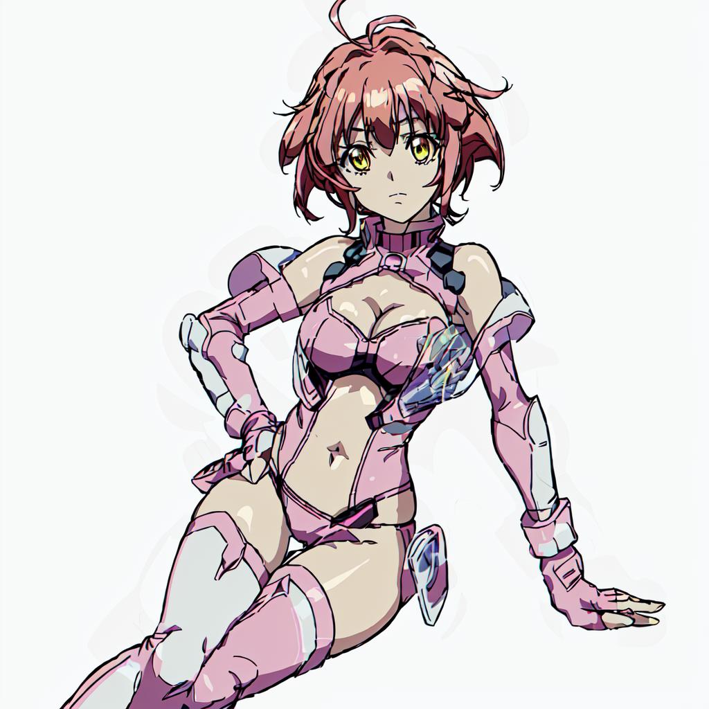 Set 2 : <lora:Vivian_Crossange-10:1>masterpeace,high quality,Vivian_Crossange, 1girl, solo, short hair, thighhighs, fingerless gloves, navel, cleavage, medium breasts, underwear, yellow eyes, red hair, ahoge, red hair, boots, black panties, clothing cutout, cleavage cutout, pink gloves, pink bodysuit