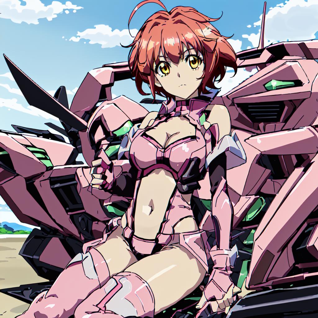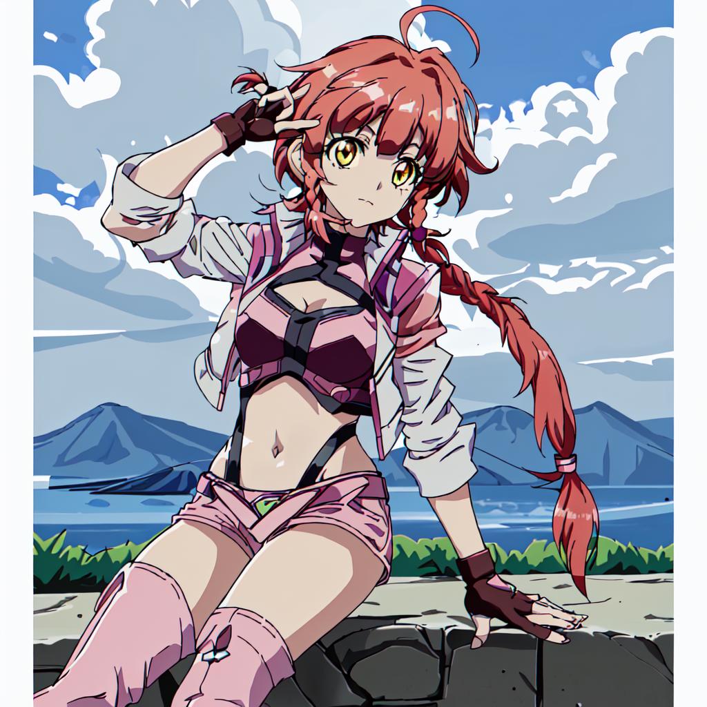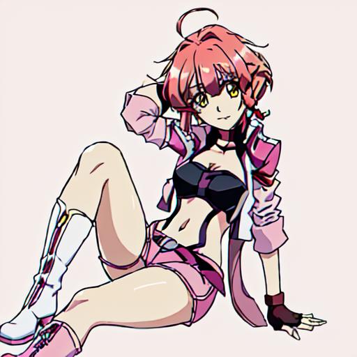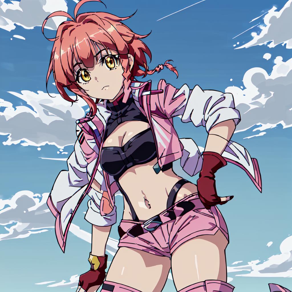 Set 1 : <lora:Vivian_Crossange-10:1>masterpeace,high quality,Vivian_Crossange, 1girl, solo, short hair, navel, jacket, yellow eyes, ahoge, red hair, boots, midriff, fingerless gloves, single braid, side braid, pink shorts