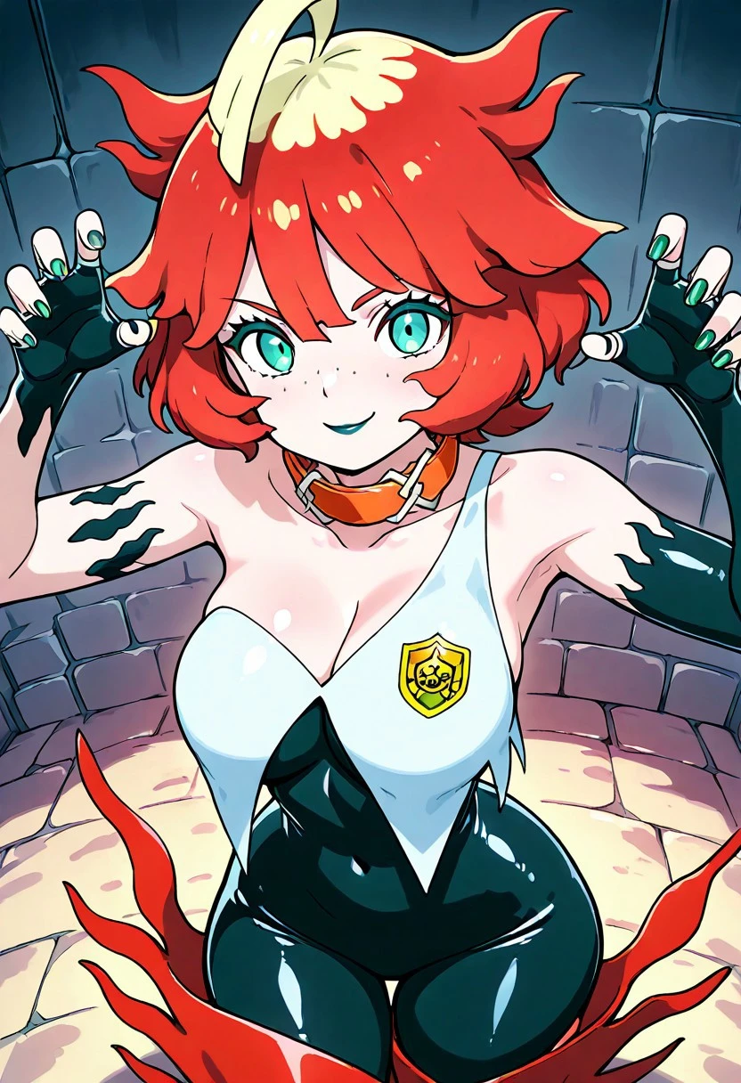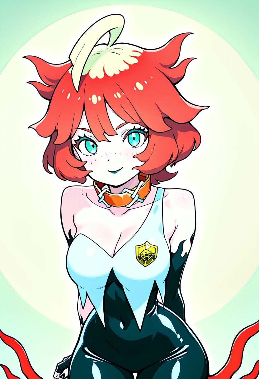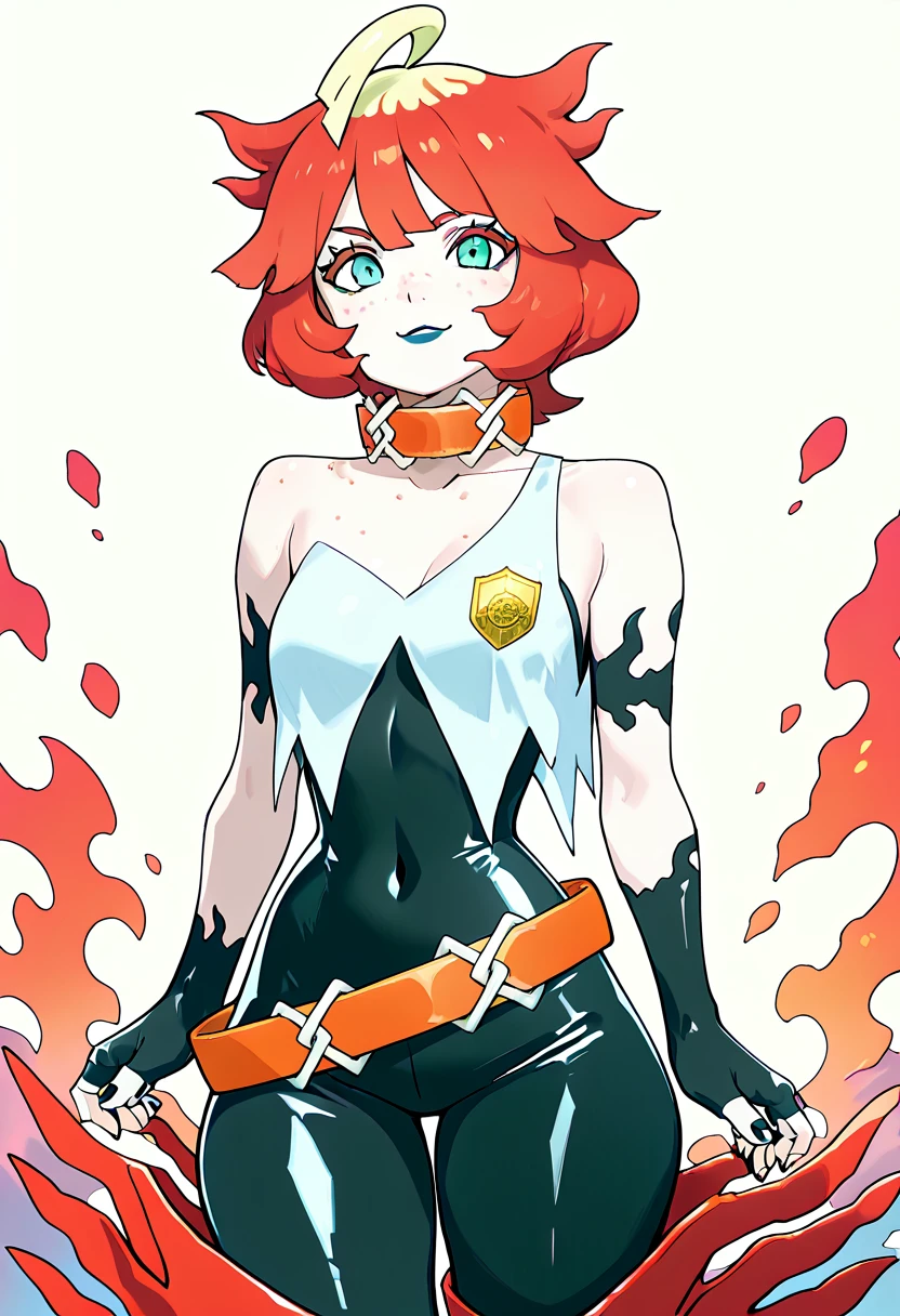 zzMela, green eyes, ahoge, freckles, red hair, multicolored hair, two-tone hair, short hair, black gloves, collar, fingerless gloves, bare shoulders, black bodysuit, nail polish, collarbone, large breasts,